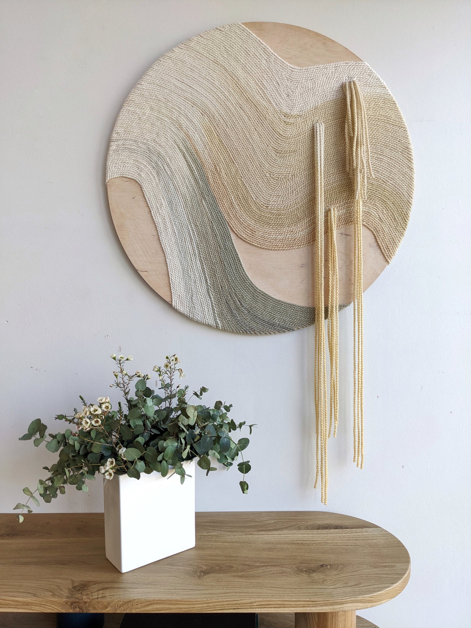 This circle dip dyed wall hanging is made of natural color soft wool, in shades of gray, green, yellow and sand with plywood. Fiber art like this will suit perfectly a minimalist living room, bohemian bedroom and warm office.