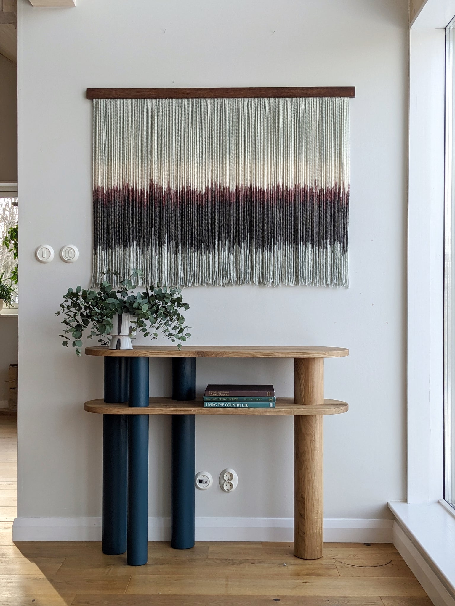 This dip dyed wall hanging is made of natural color soft wool, in shades of bluish gray, gray, charcoal/black and burgundy finished with a stained oak wood panel. Fiber art like this will suit perfectly a minimalist living room, bohemian bedroom and warm office.