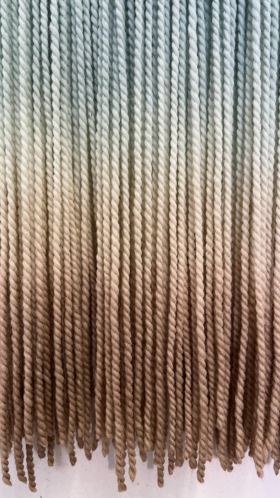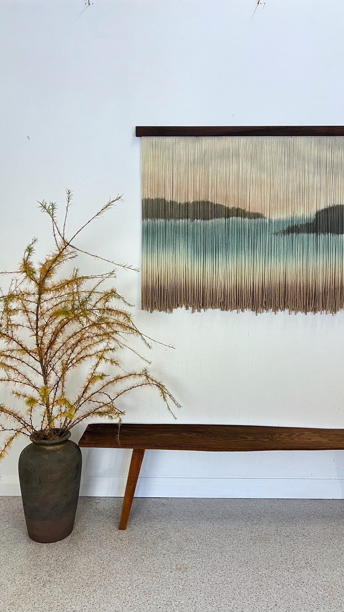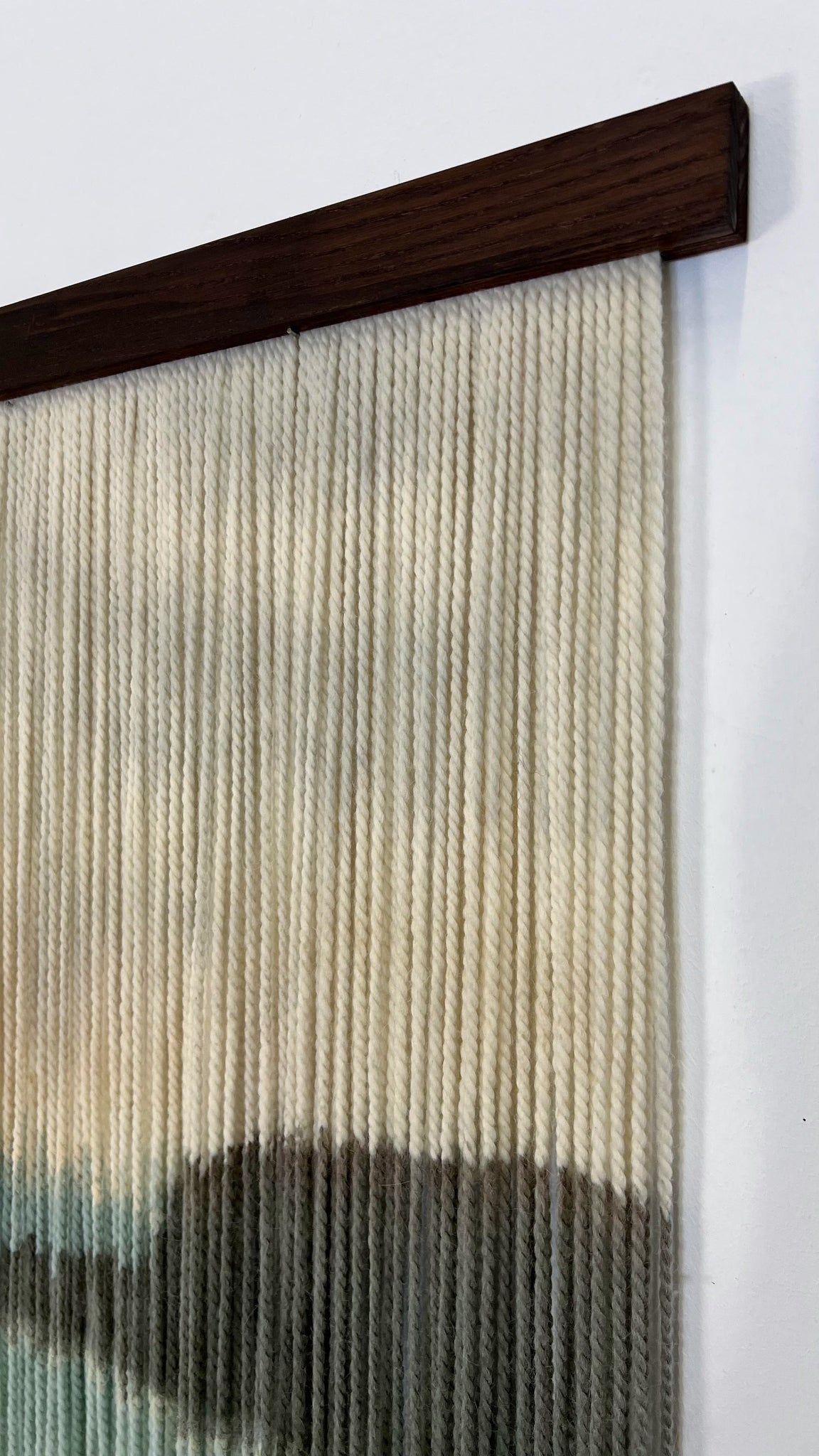 This dip dyed wall hanging is made of natural color soft wool, in shades of gray, beige/pink, chorcoal, anthracite, brown and blue finished with a stained oak wood panel. Fiber art like this will suit perfectly a minimalist living room, bohemian bedroom and warm office.