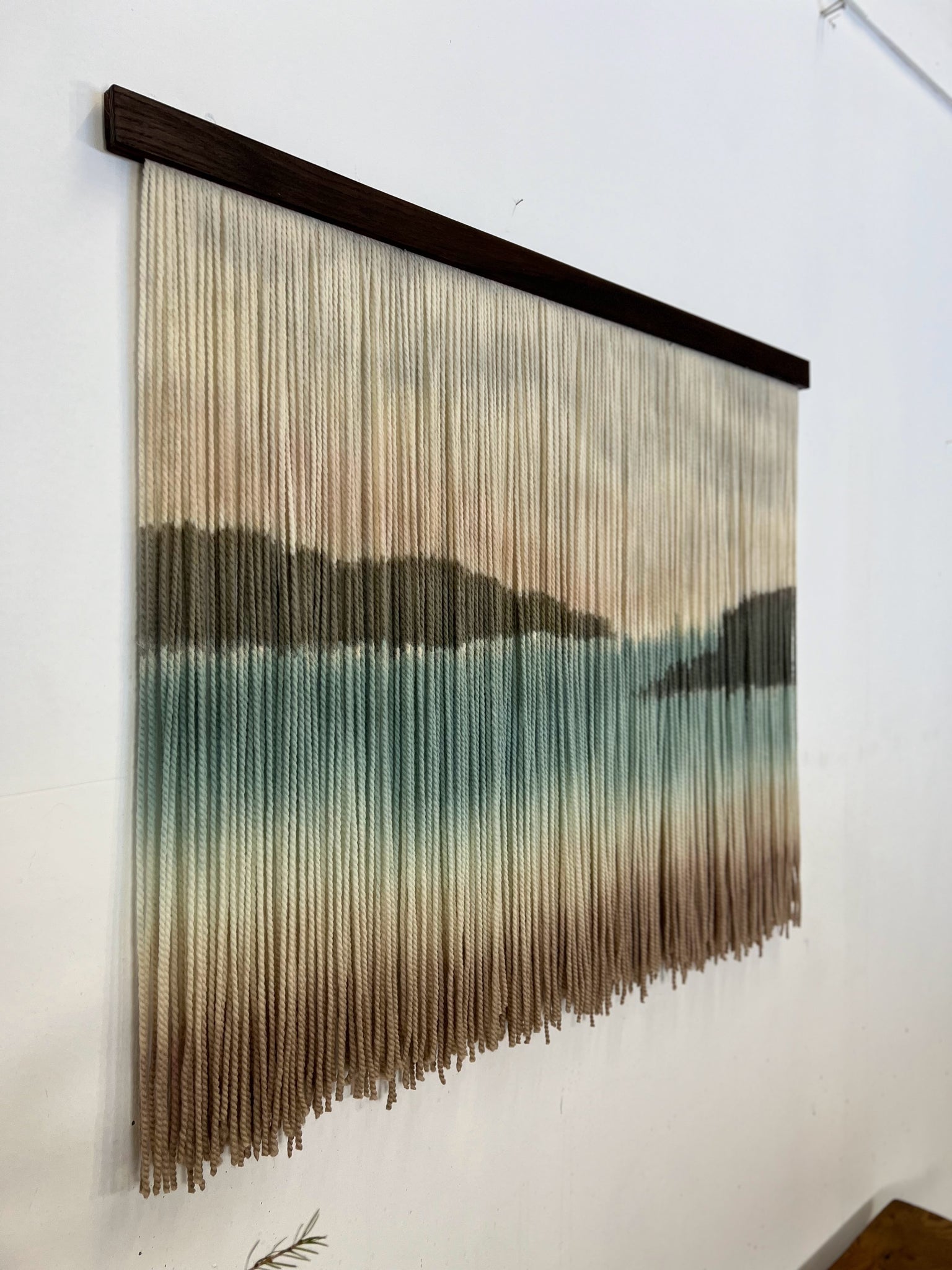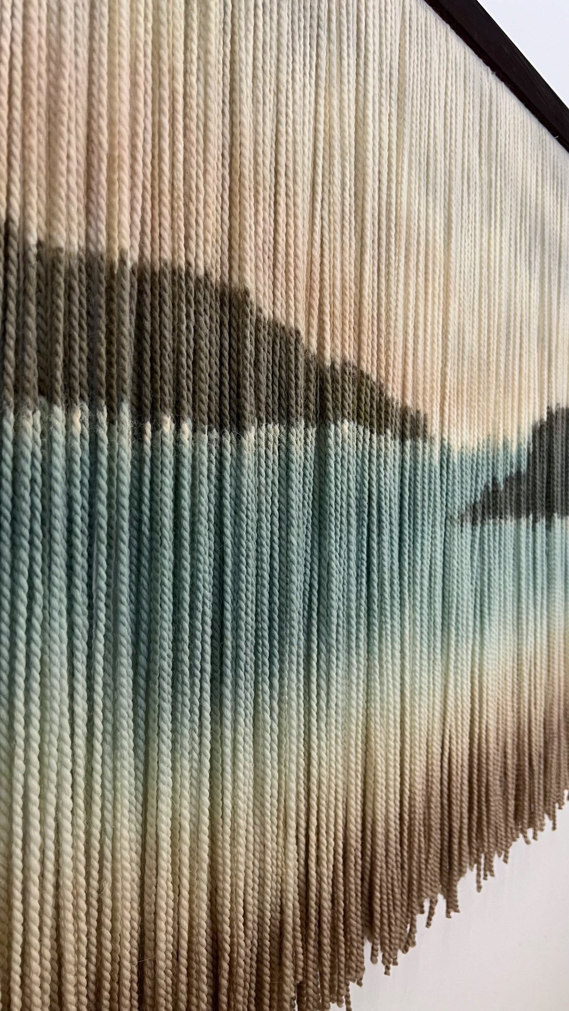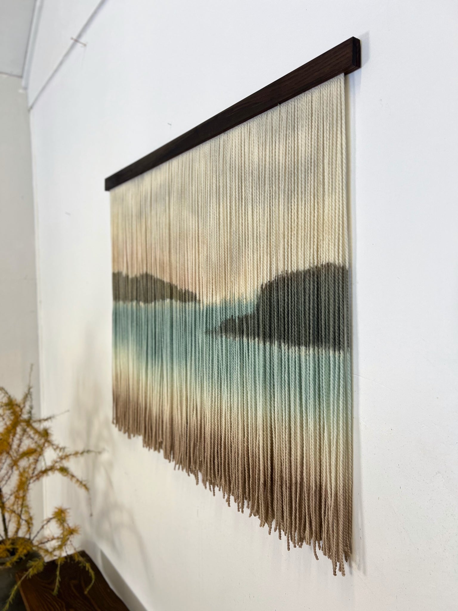 This dip dyed wall hanging is made of natural color soft wool, in shades of gray, beige/pink, chorcoal, anthracite, brown and blue finished with a stained oak wood panel. Fiber art like this will suit perfectly a minimalist living room, bohemian bedroom and warm office.
