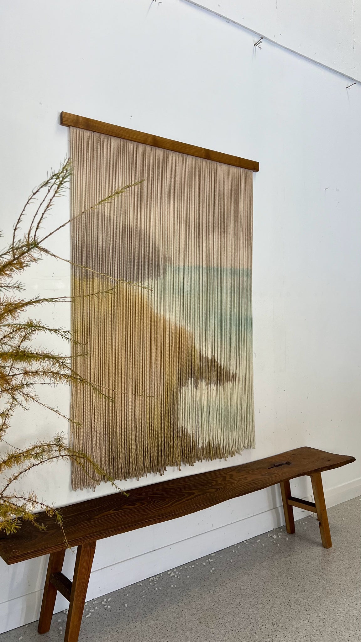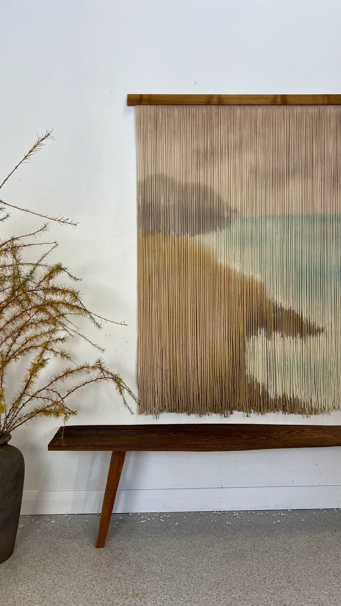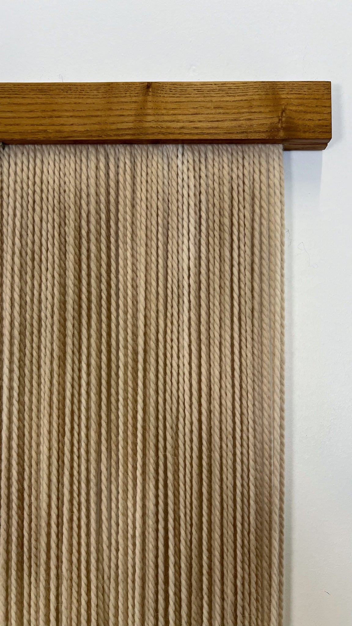 This dip dyed wall hanging is made of natural color soft wool, in shades of beige, brown, gold/sand and turquoise finished with a stained oak wood panel. Fiber art like this will suit perfectly a minimalist living room, bohemian bedroom and warm office.