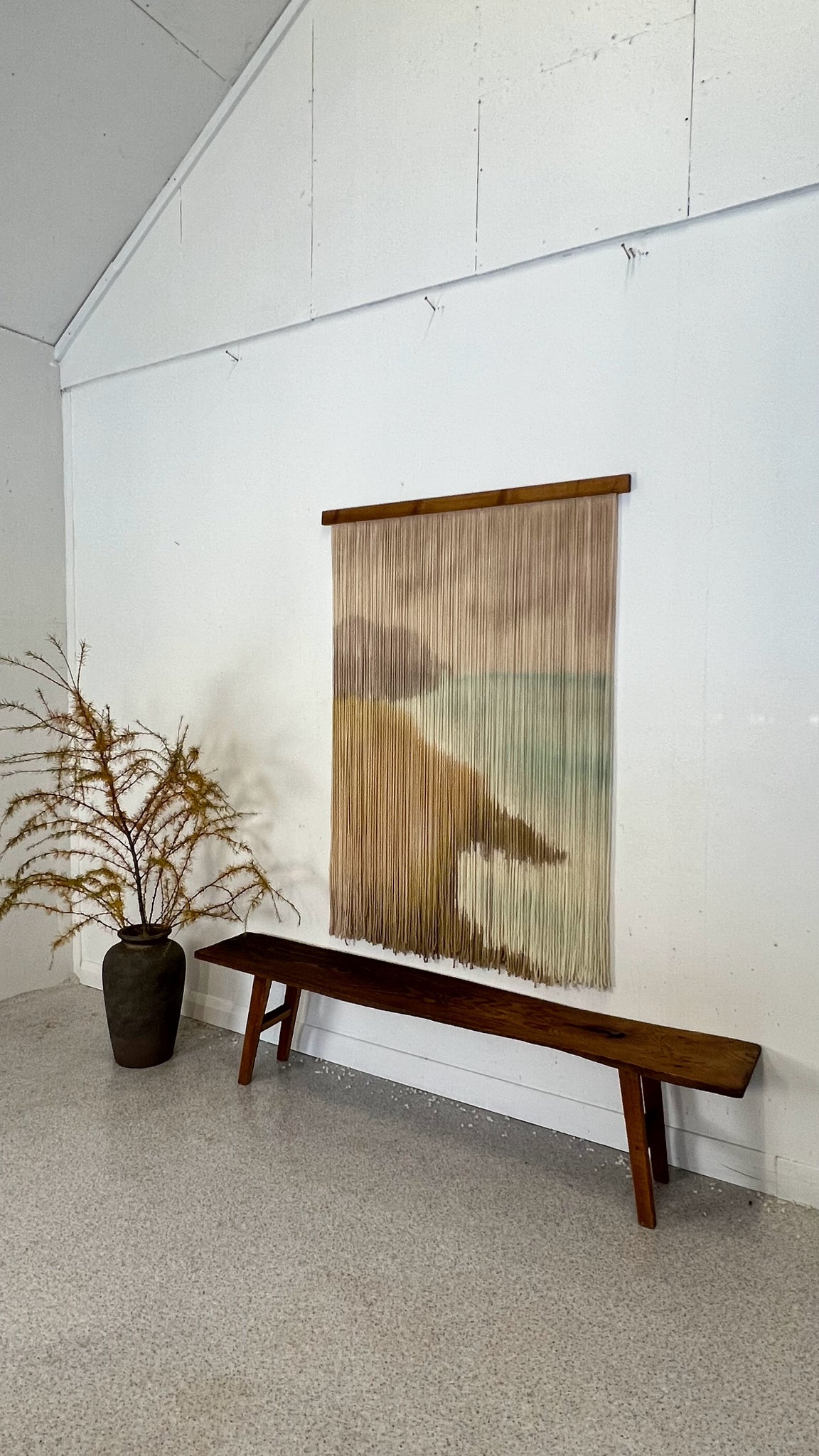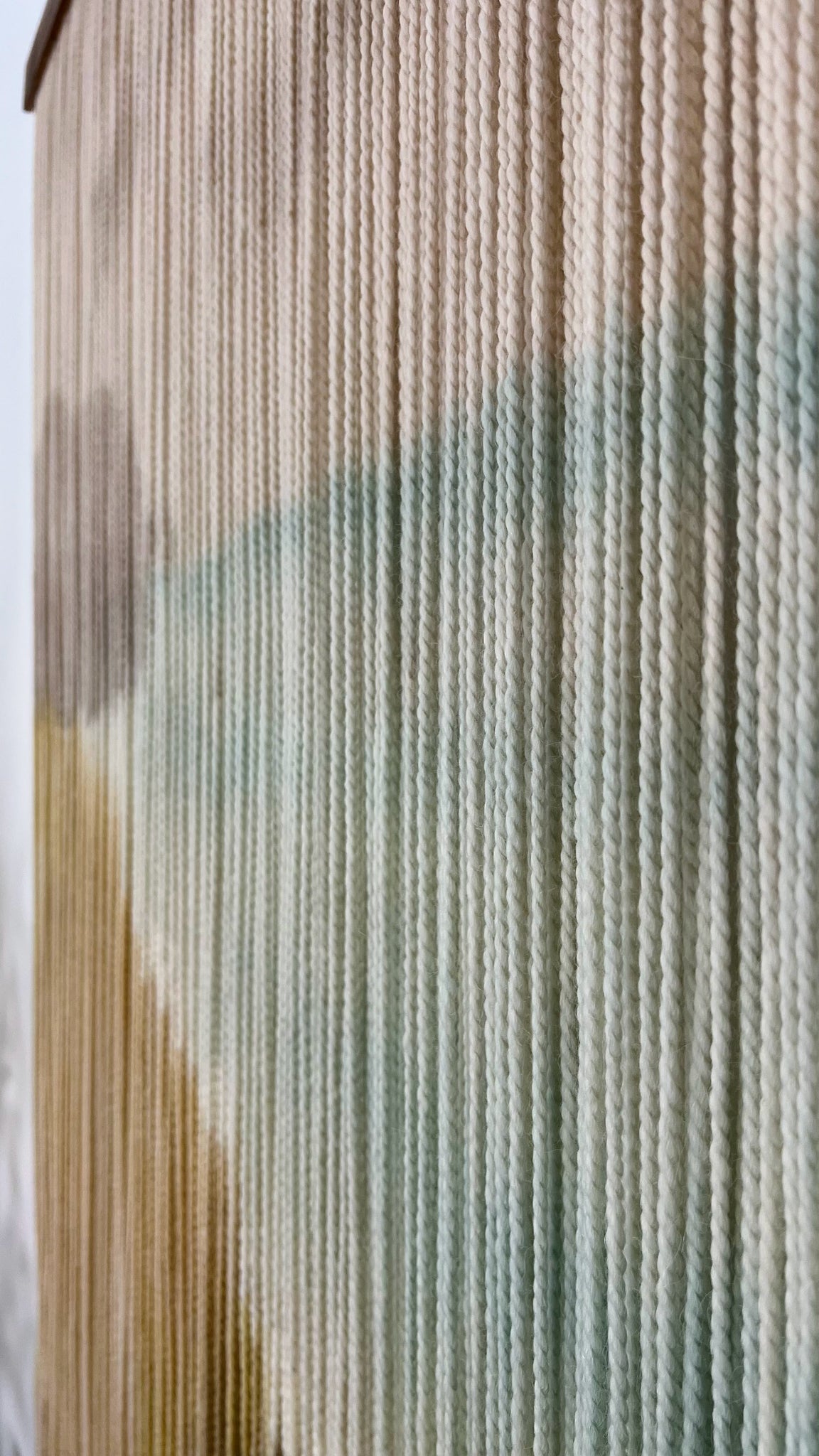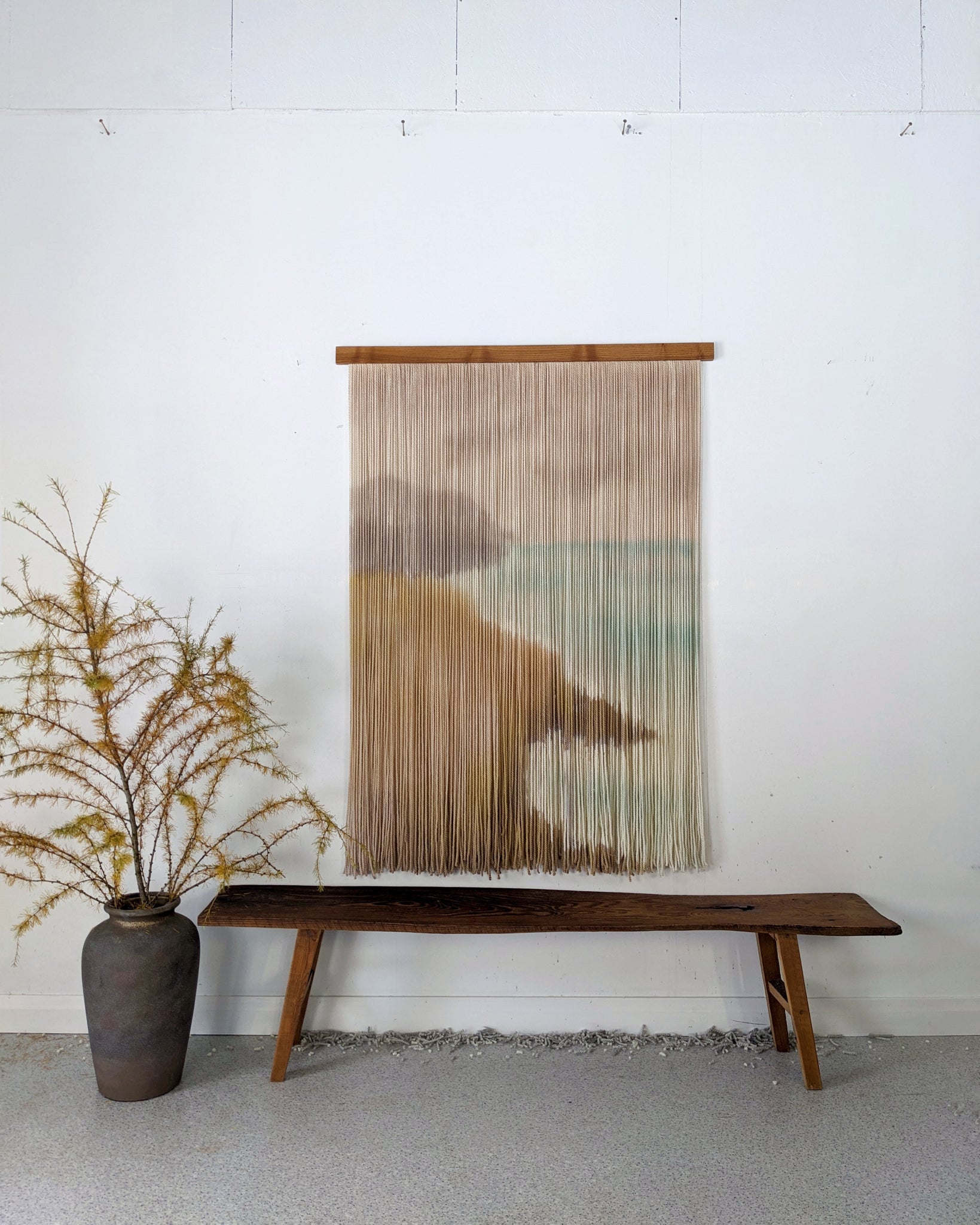 This dip dyed wall hanging is made of natural color soft wool, in shades of beige, brown, gold/sand and turquoise finished with a stained oak wood panel. Fiber art like this will suit perfectly a minimalist living room, bohemian bedroom and warm office.
