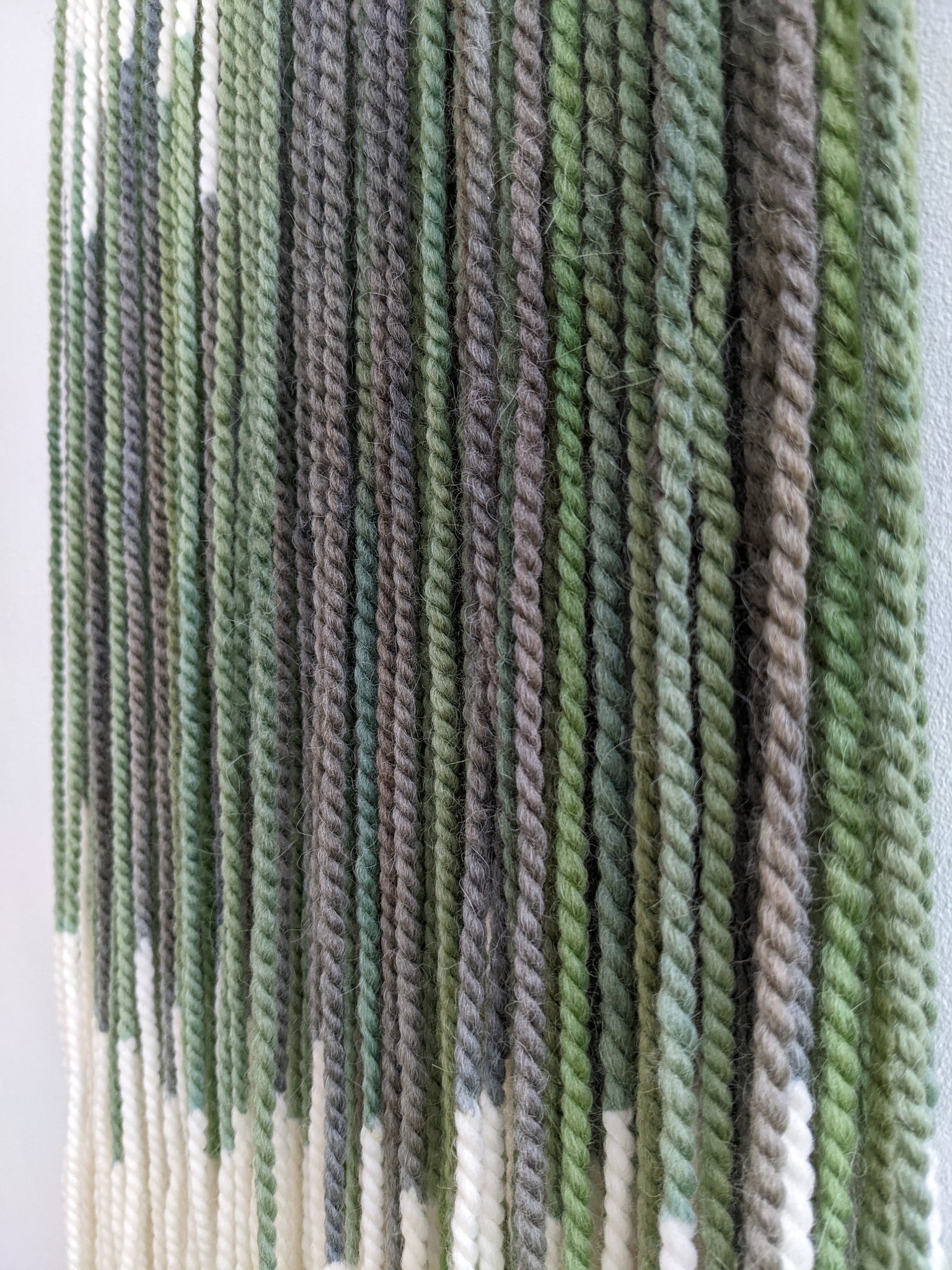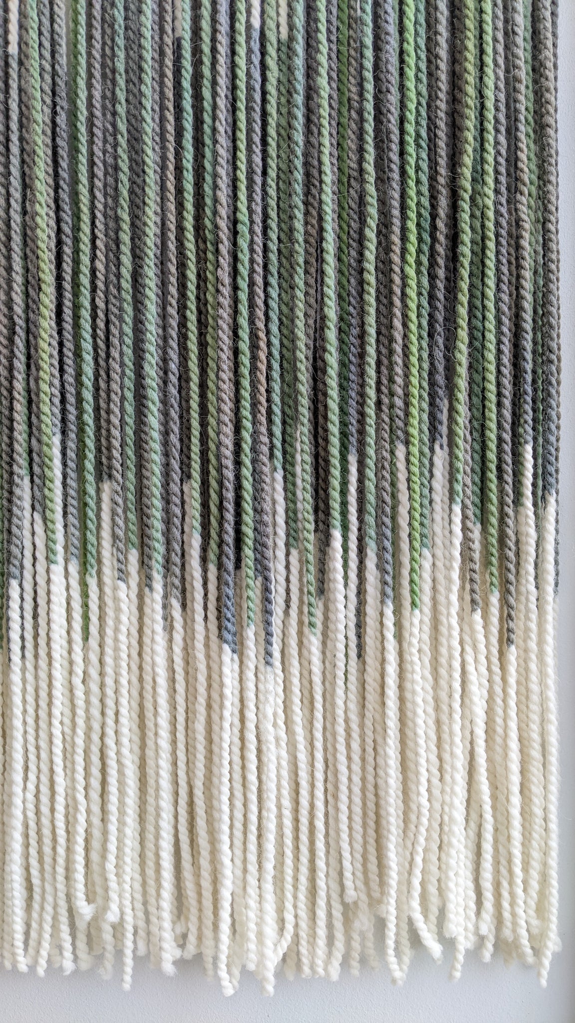 This large dip dyed wall hanging is made of soft wool, in shades of natural color wool (ecru/off white), green and black/chorcoal, finished with oak wood panel. Fiber art like this will suit perfectly a minimal living room, modern bedroom, and mid-century office.