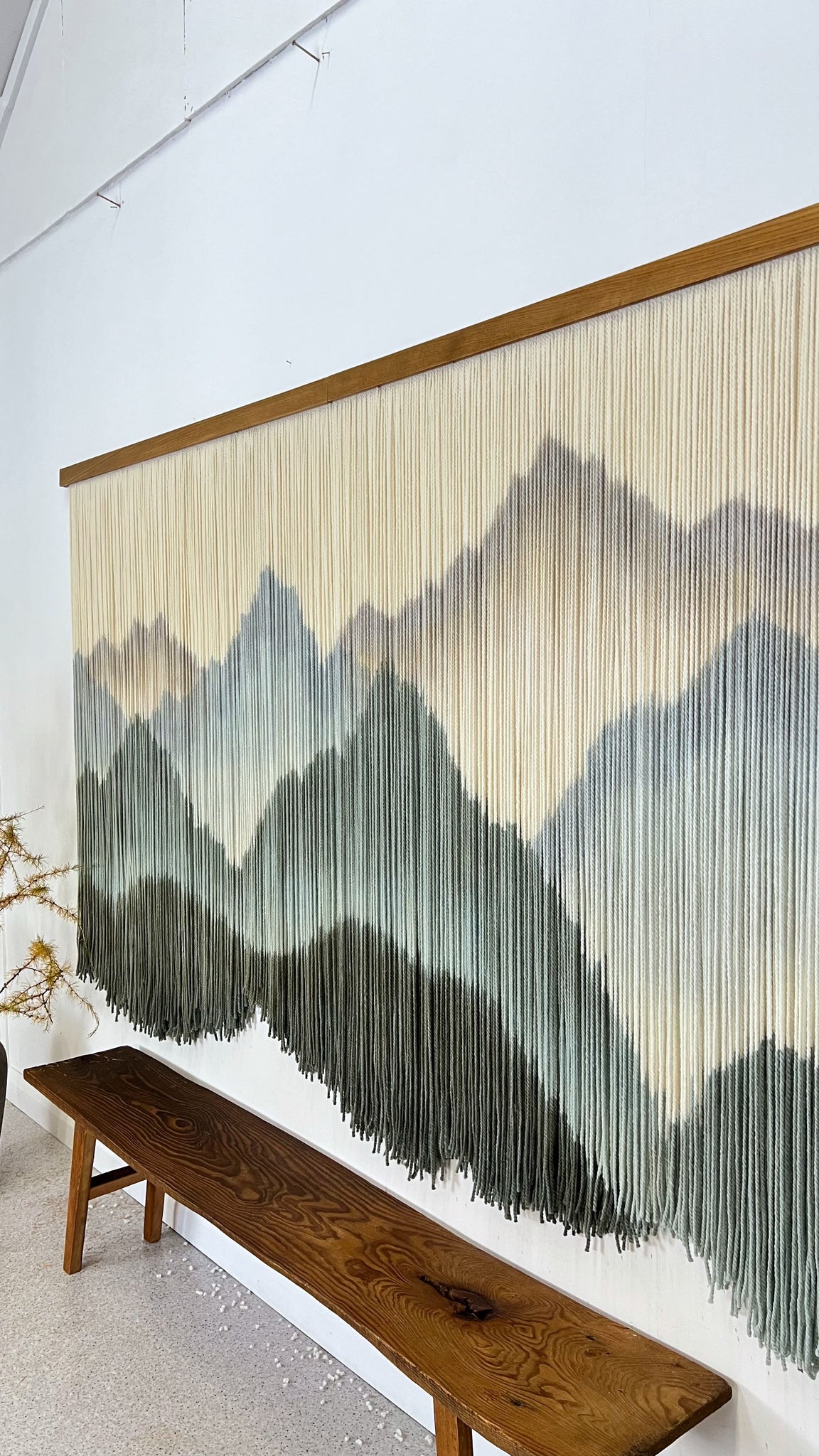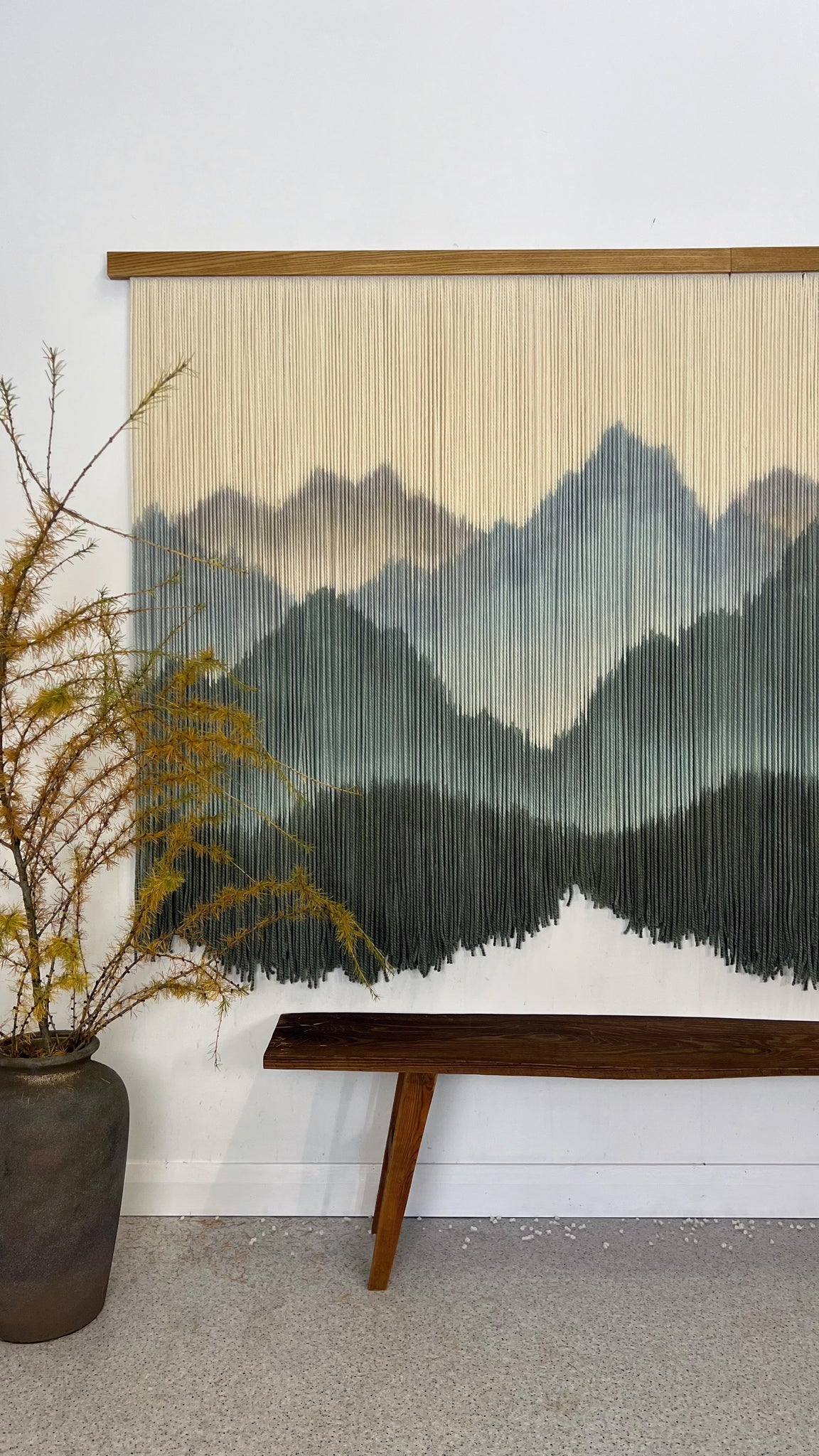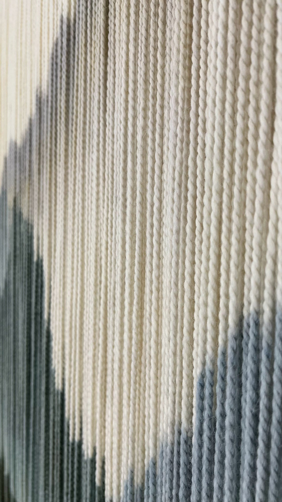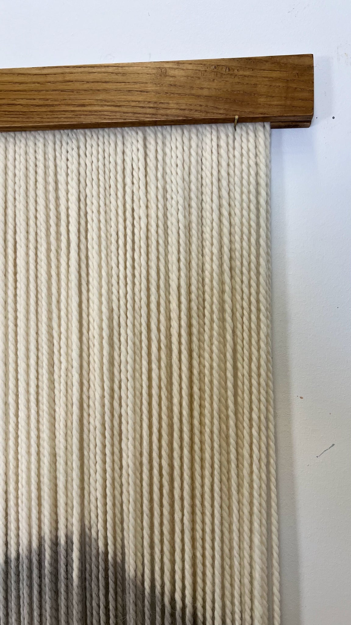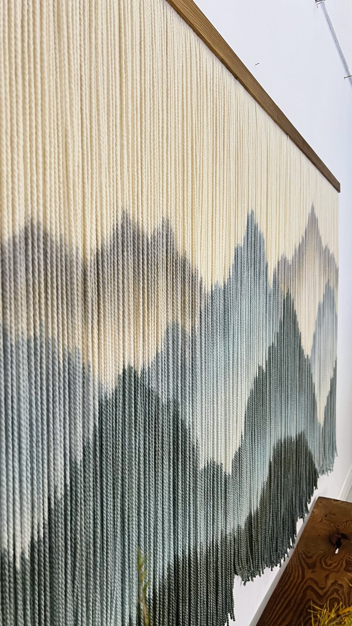 This dip dyed wall hanging is made of natural color soft wool, in shades of gray, beige, blue and navy finished with a stained oak wood panel. Fiber art like this will suit perfectly a minimalist living room, bohemian bedroom and warm office.