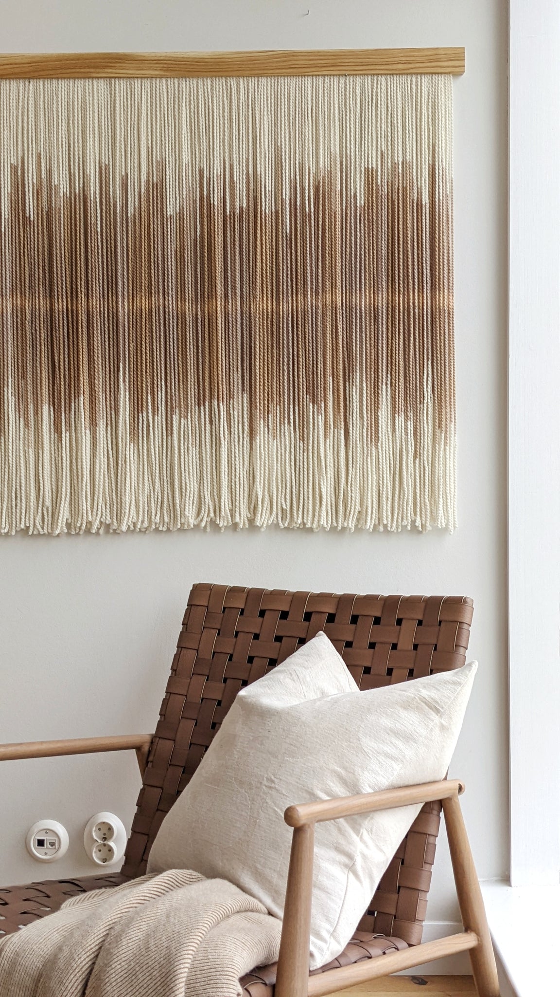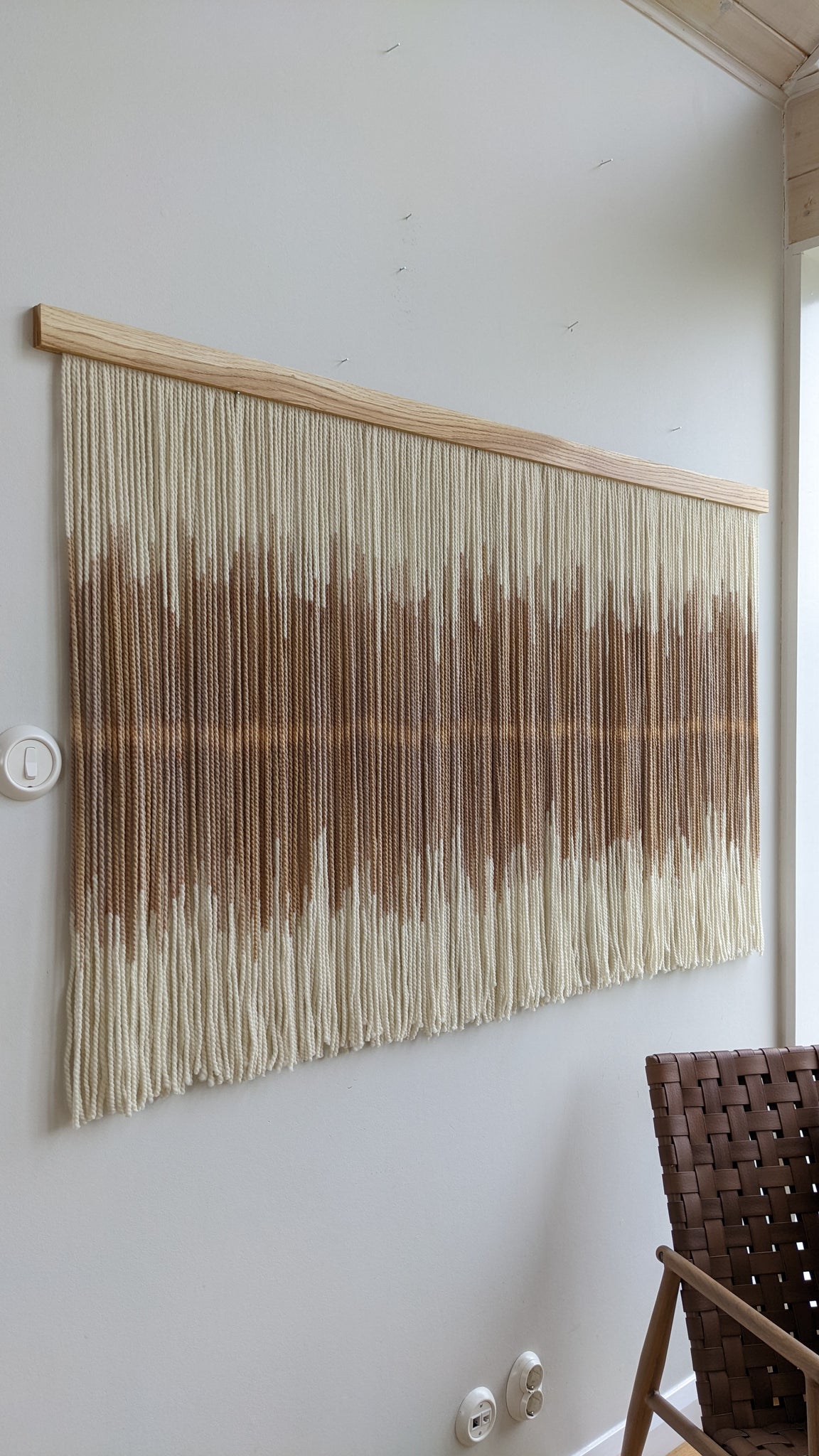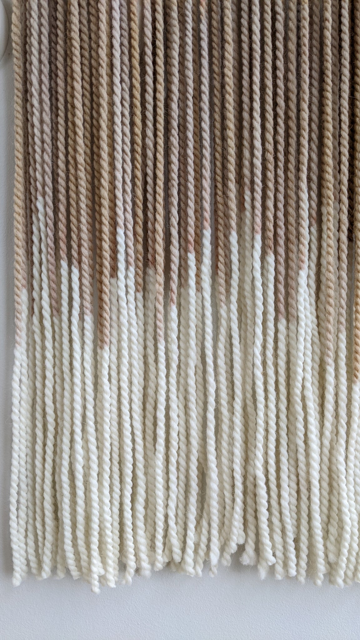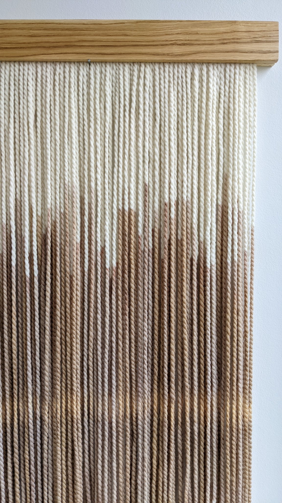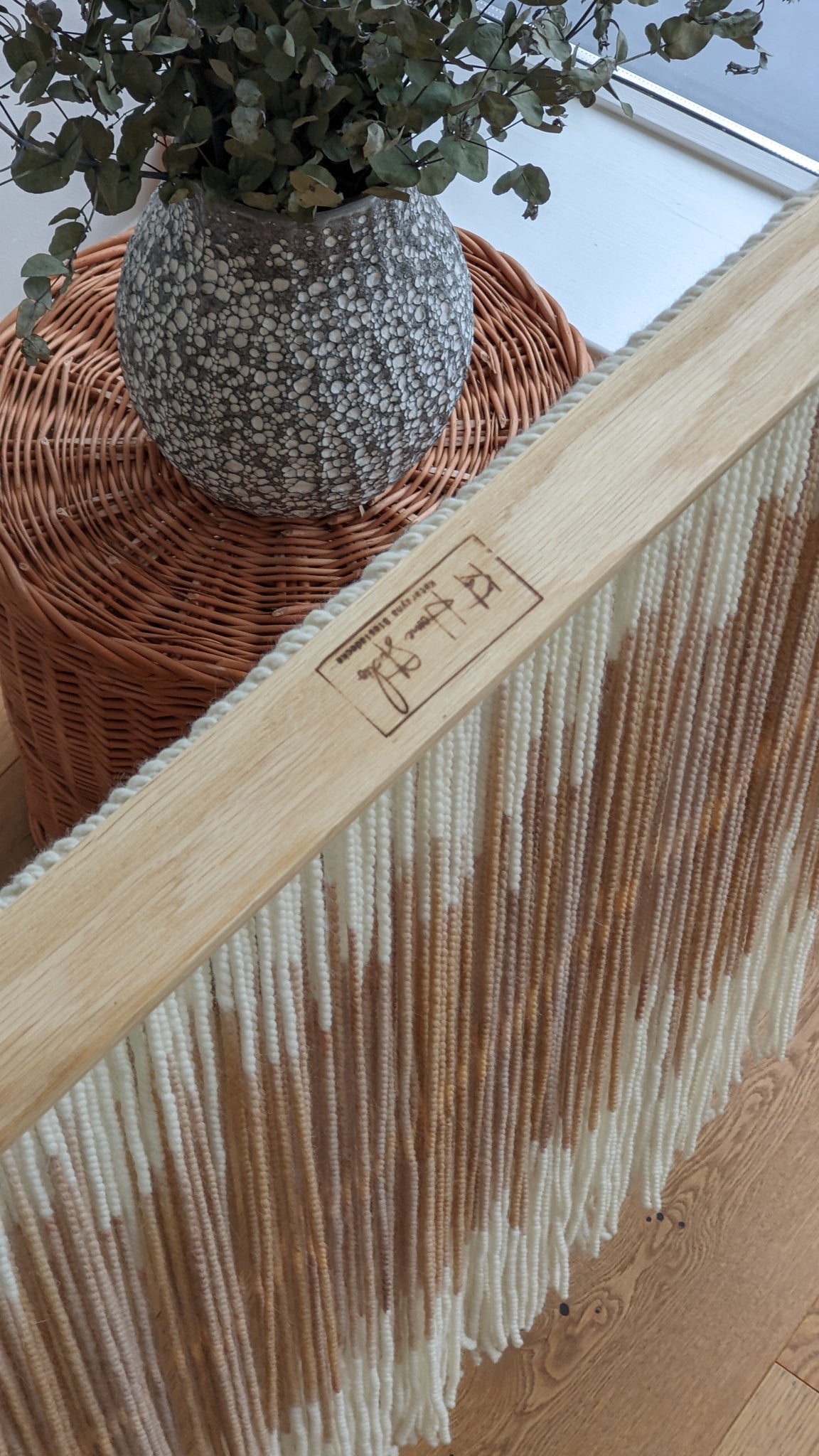 This dip dyed wall hanging is made of soft wool, in shades of beige, bronze, gold and brown, finished with an oak wood panel. Fiber art like this will suit perfectly a wabi sabi living room, bohemian bedroom and warm office.