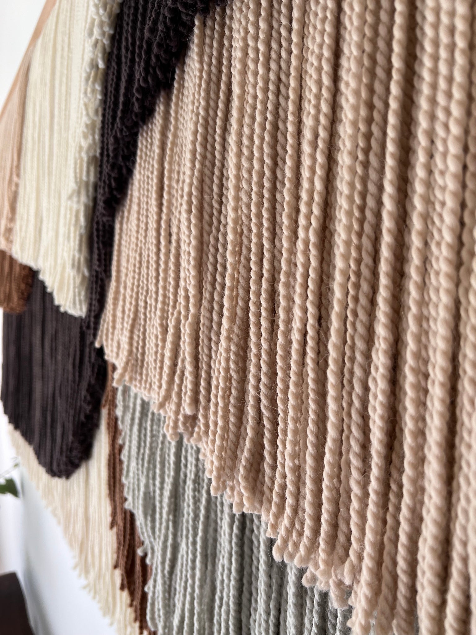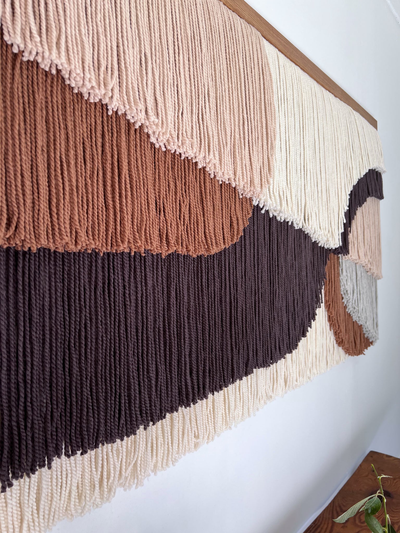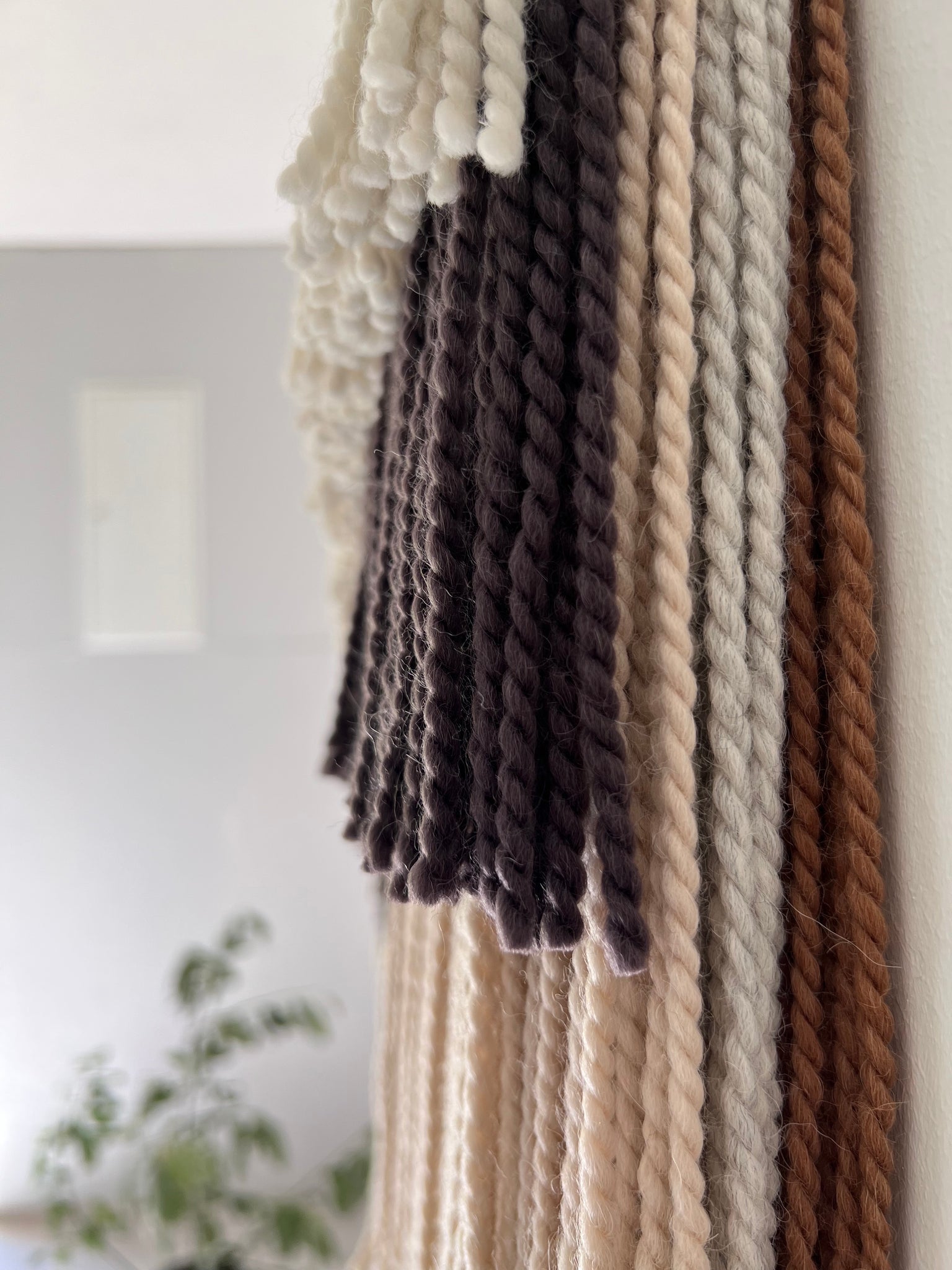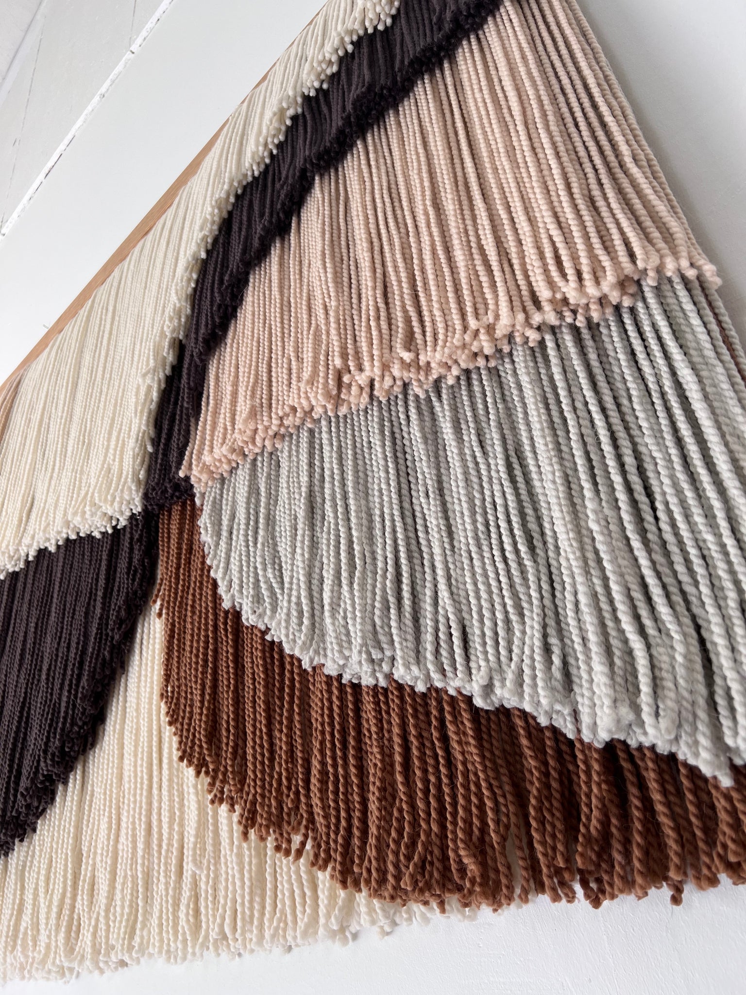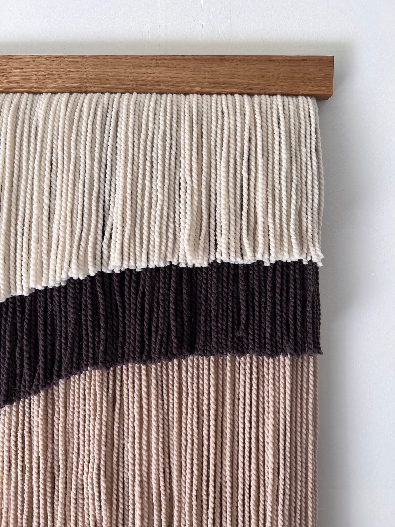 This large layered wall hanging is made of soft wool, in shades of natural color wool (ecru/off white), gray, beige, brown, finished with oak wood panel. Fiber art like this will suit perfectly a minimal living room, modern bedroom, and mid-century office.
