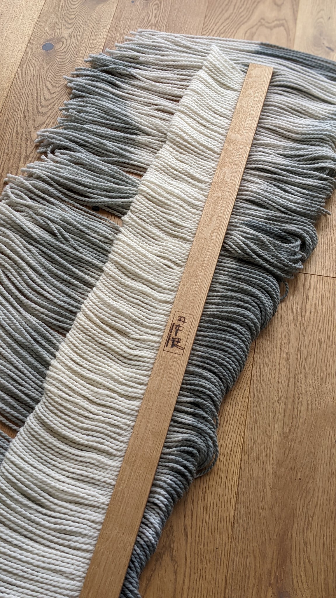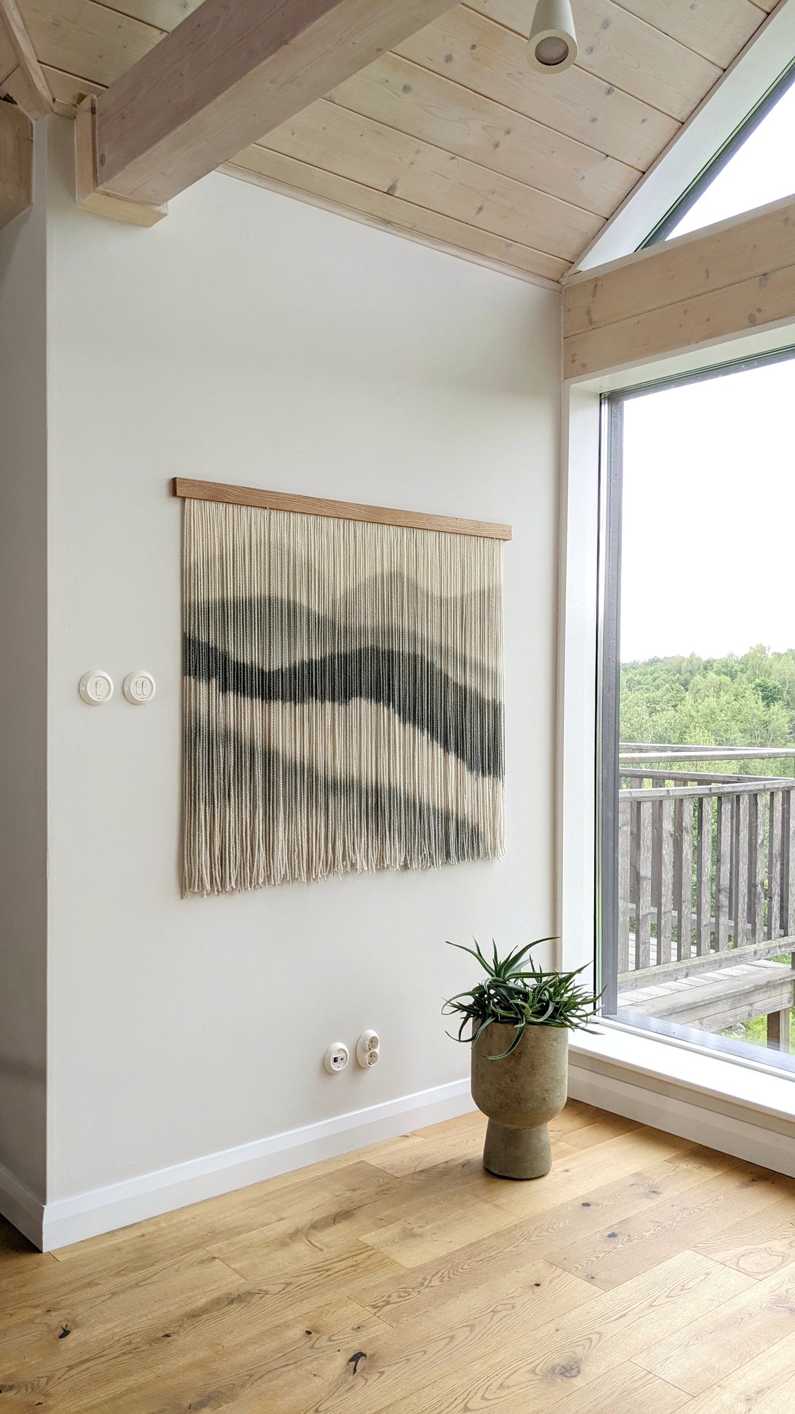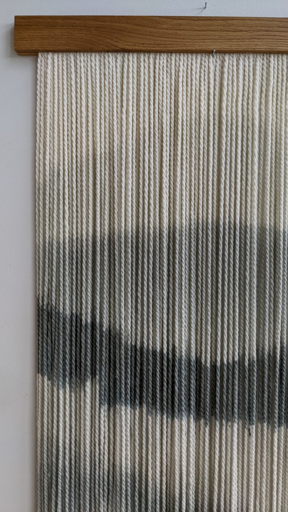 This dip dyed wall hanging is made of natural color soft wool, in shades of black, charcoal, graphite and gray, finished with an oak wood panel. Fiber art like this will suit perfectly a minimalist living room, bohemian bedroom and modern office.