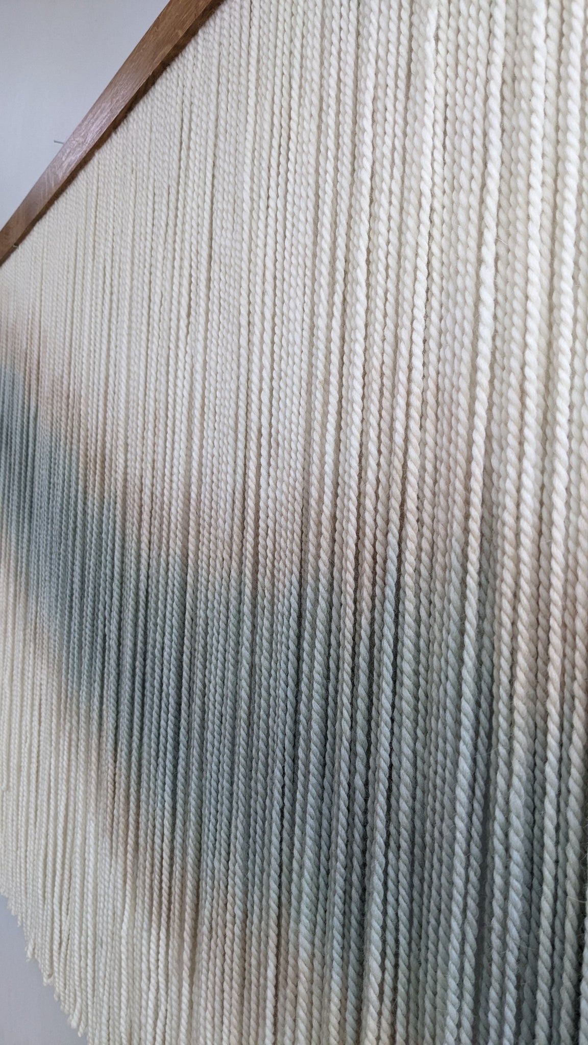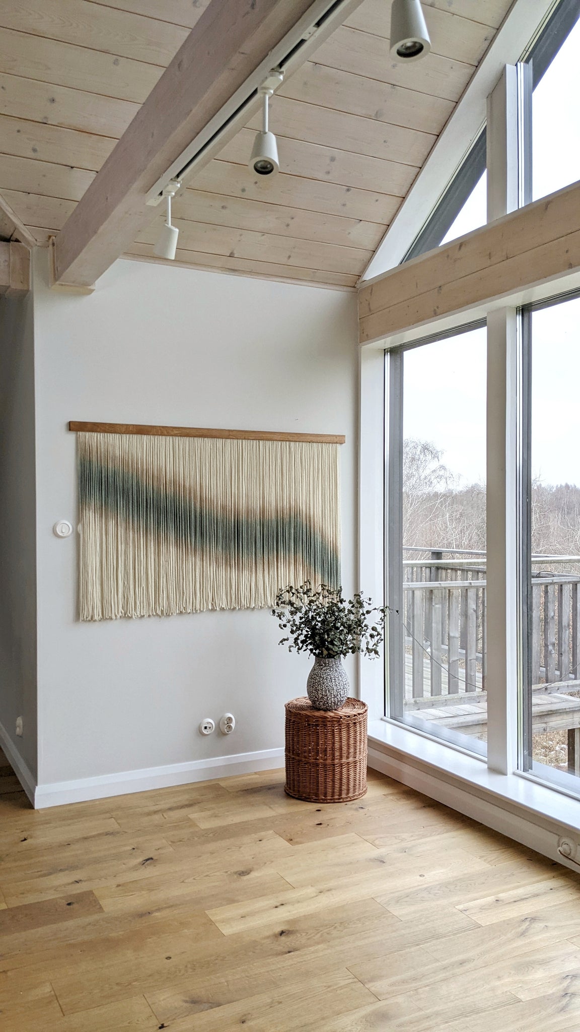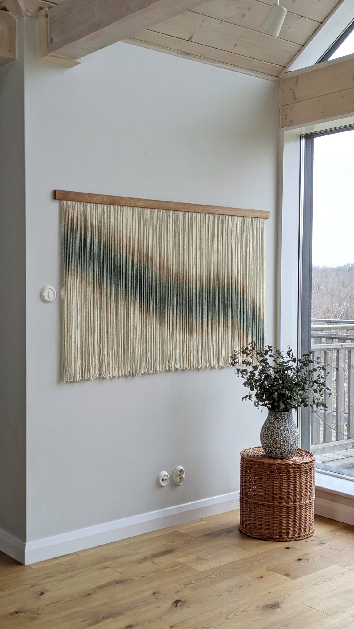 This large dip dyed wall hanging is made of soft wool, in shades of beige, gray and green, finished with an oak wood panel. Fiber art like this will suit perfectly a minimalistic living room, bedroom and nursery. This painting is soft and delicate, and also such a statement piece.