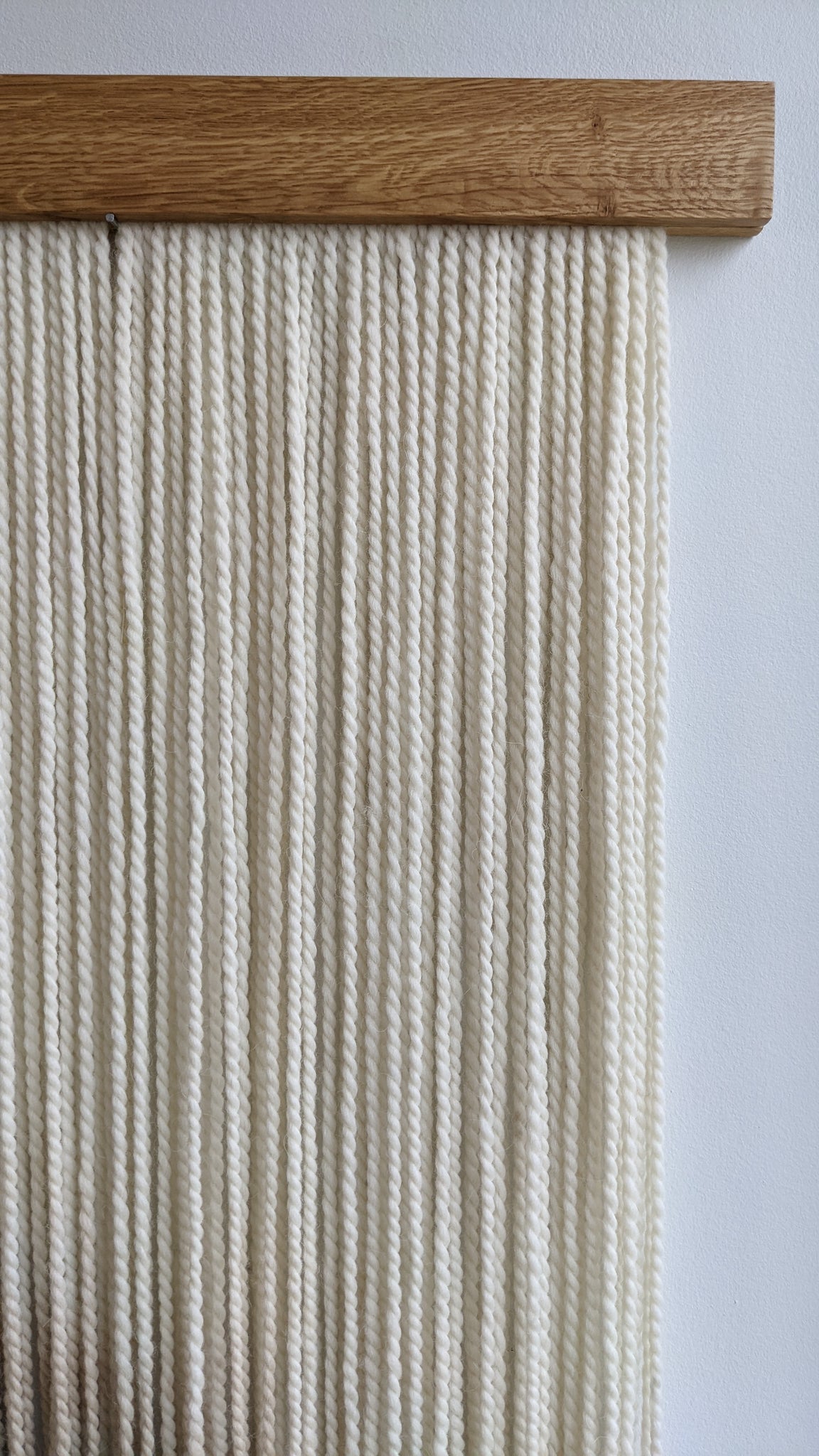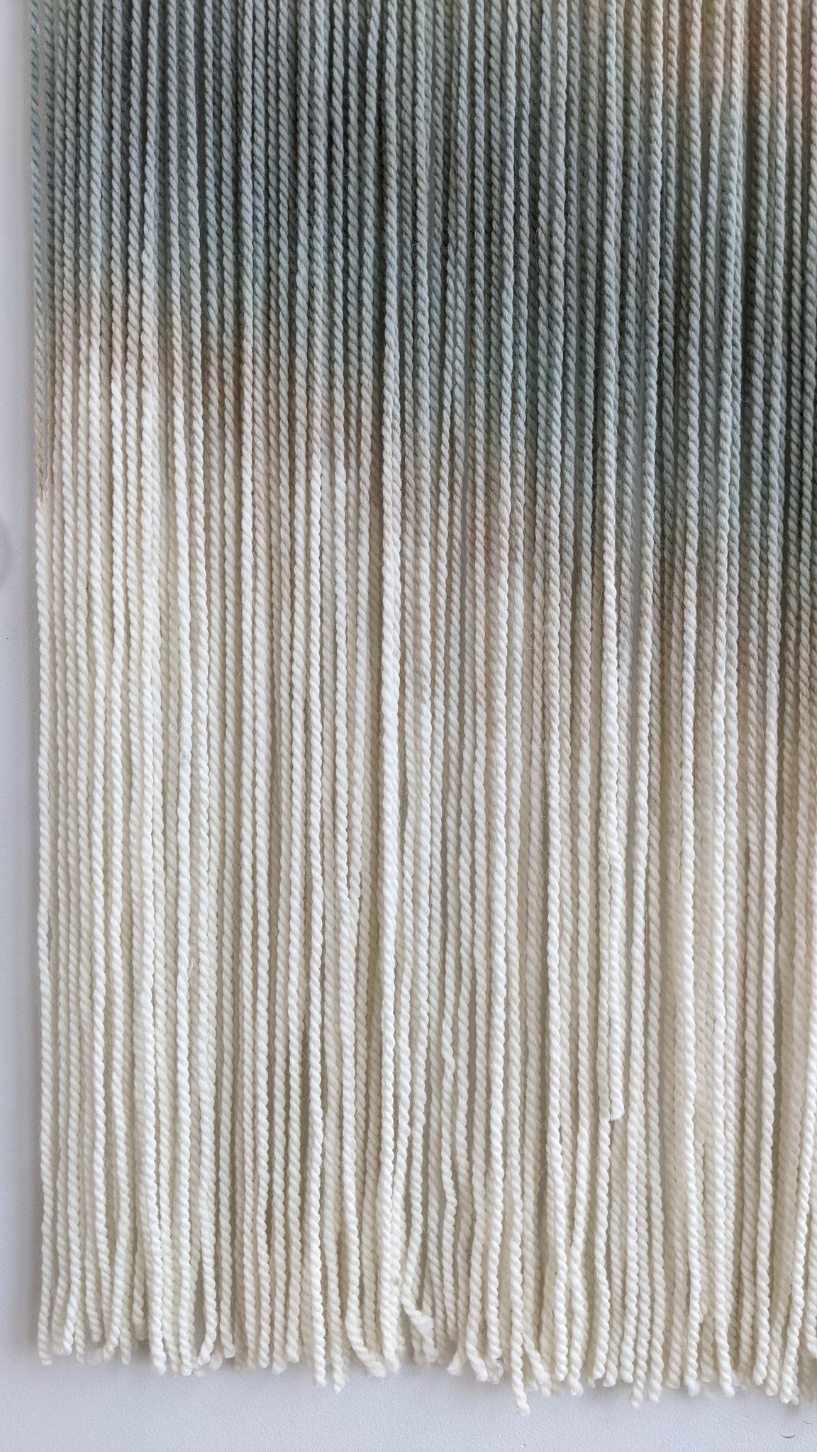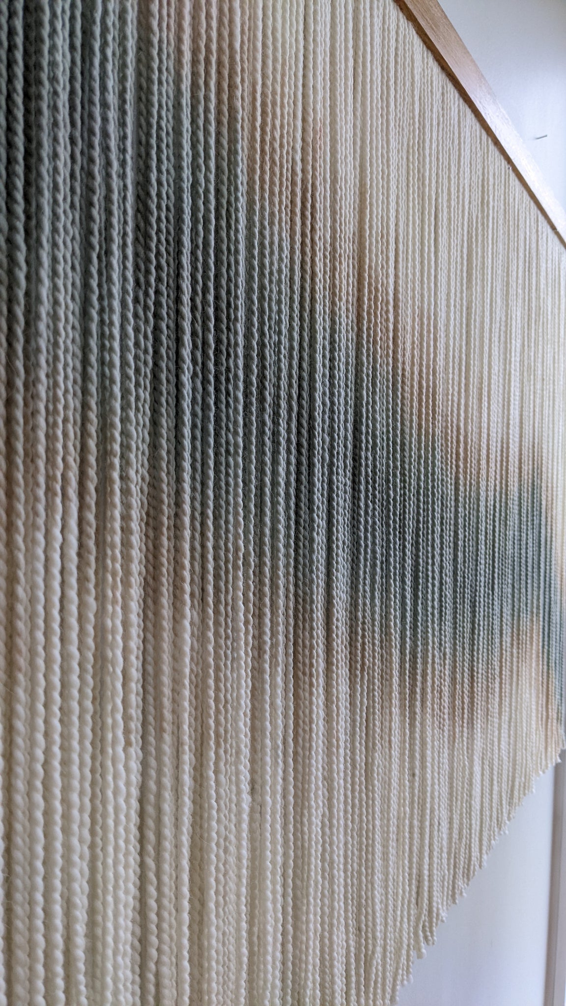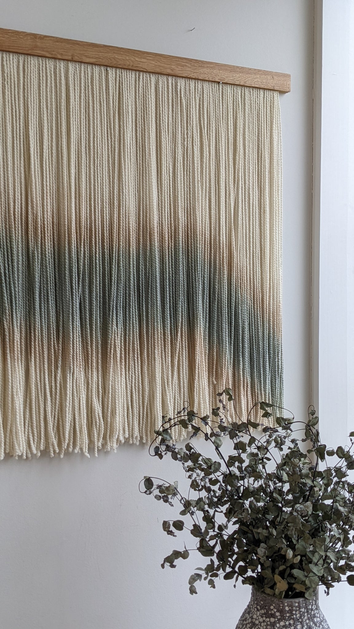 This large dip dyed wall hanging is made of soft wool, in shades of beige, gray and green, finished with an oak wood panel. Fiber art like this will suit perfectly a minimalistic living room, bedroom and nursery. This painting is soft and delicate, and also such a statement piece.