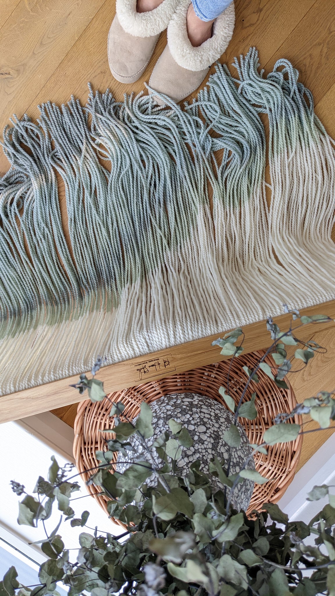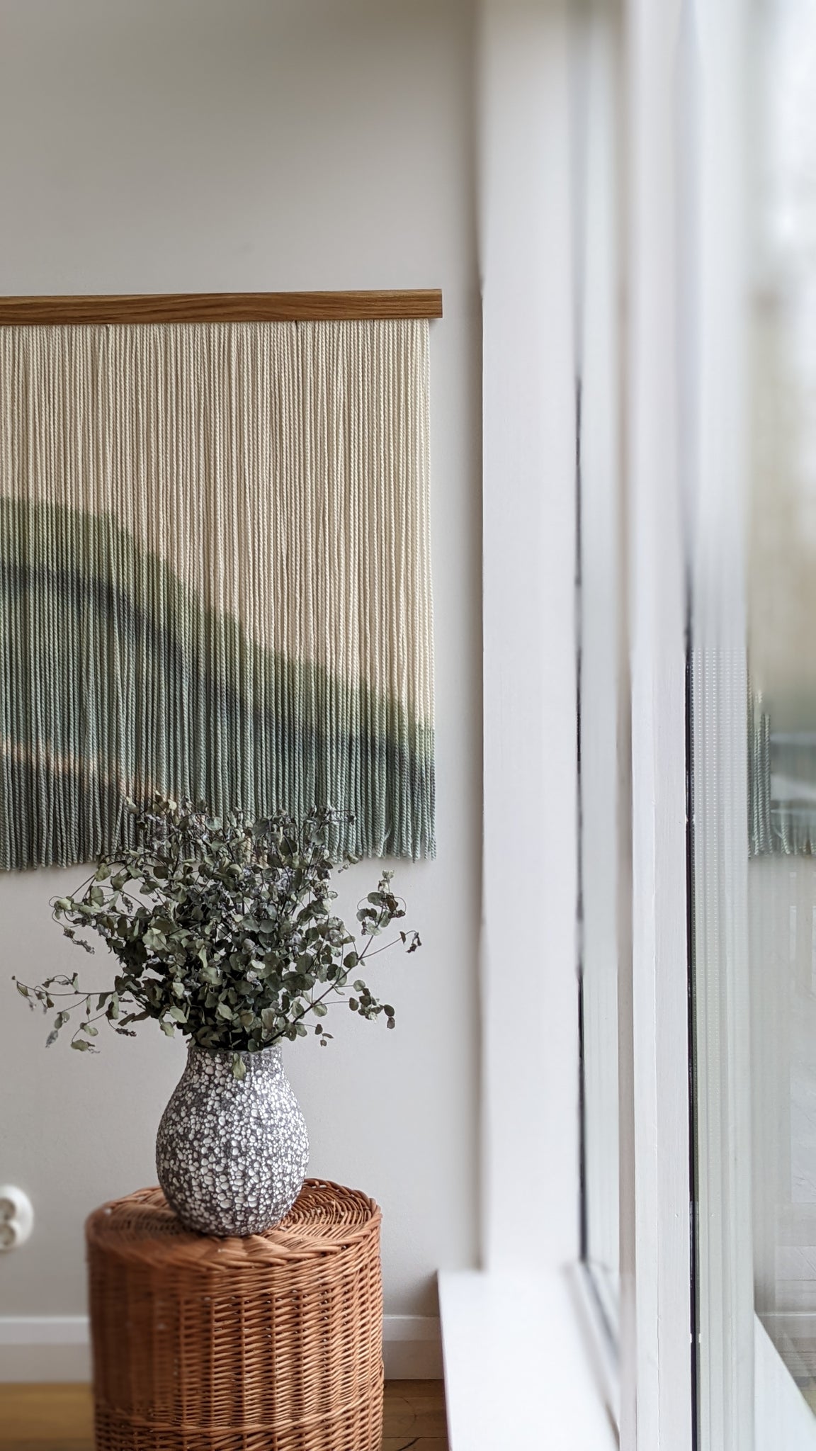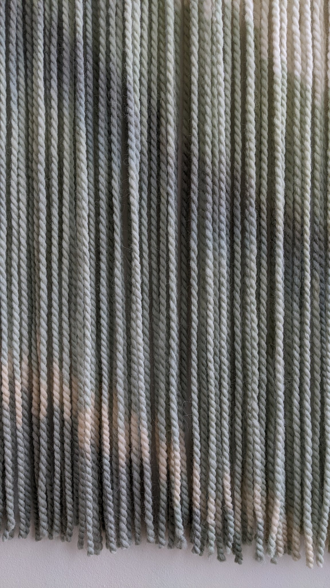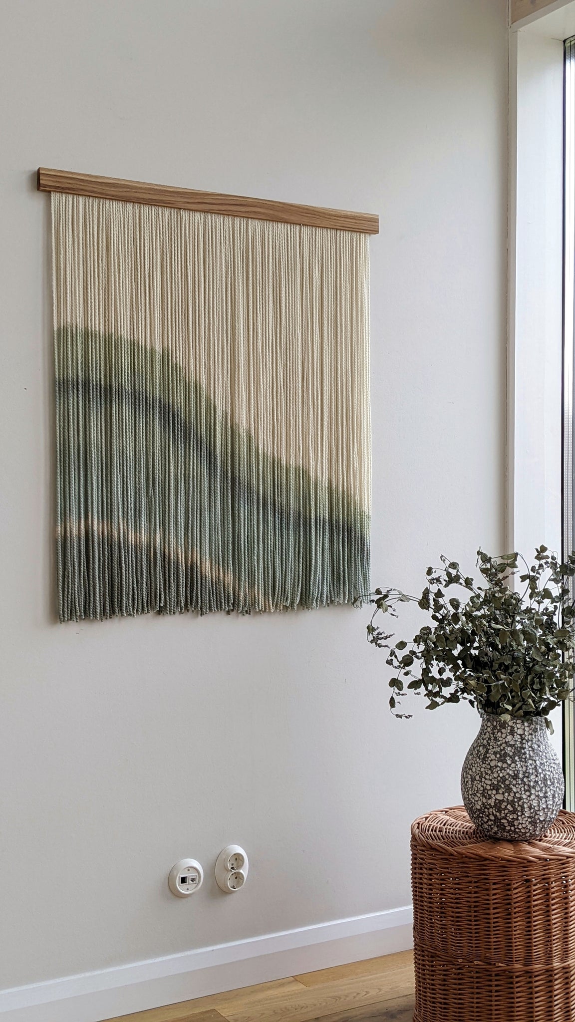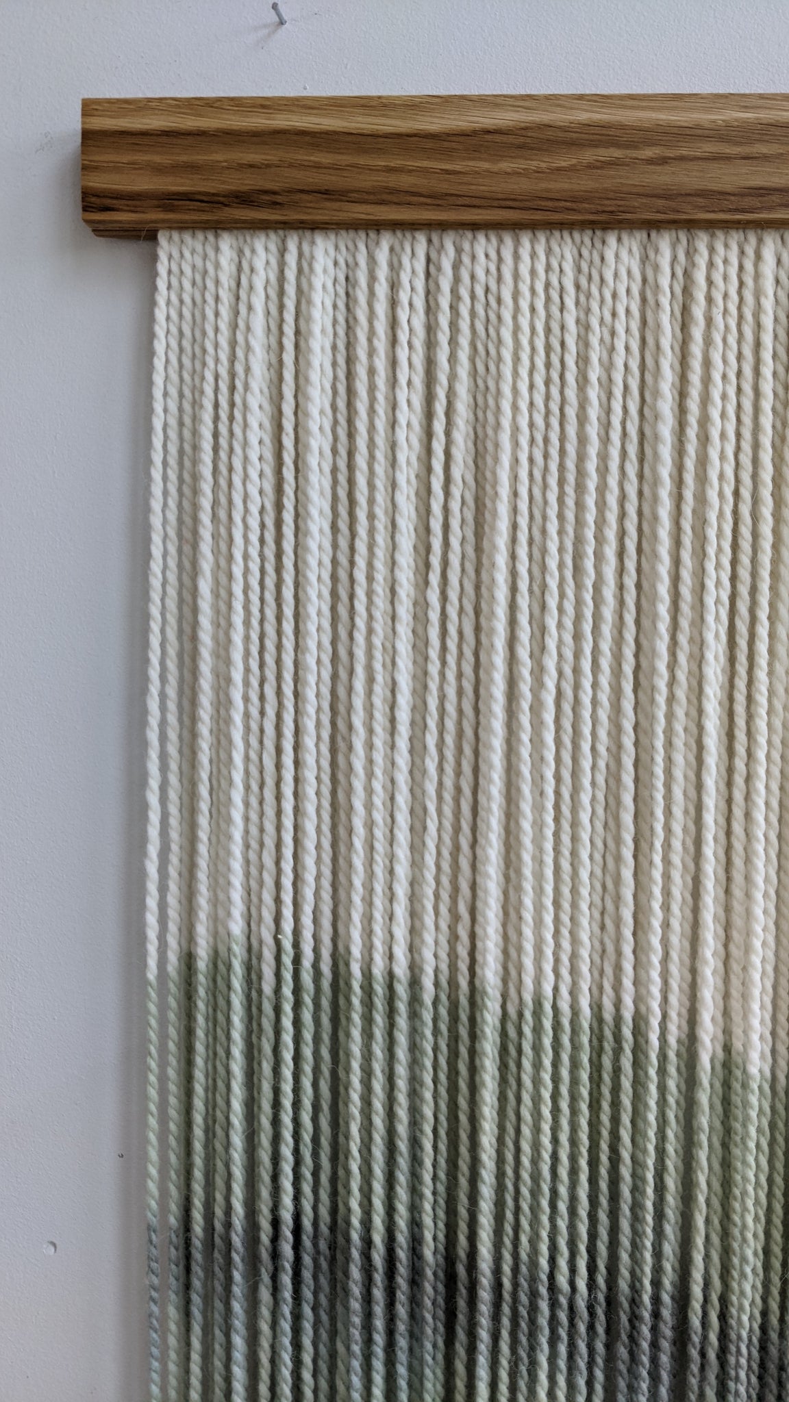 This large dip dyed wall hanging is made of soft wool, in shades of gray, olive and green, finished with an oak wood panel. Fiber art like this will suit perfectly a contemporary living room, office wall, and bedroom.