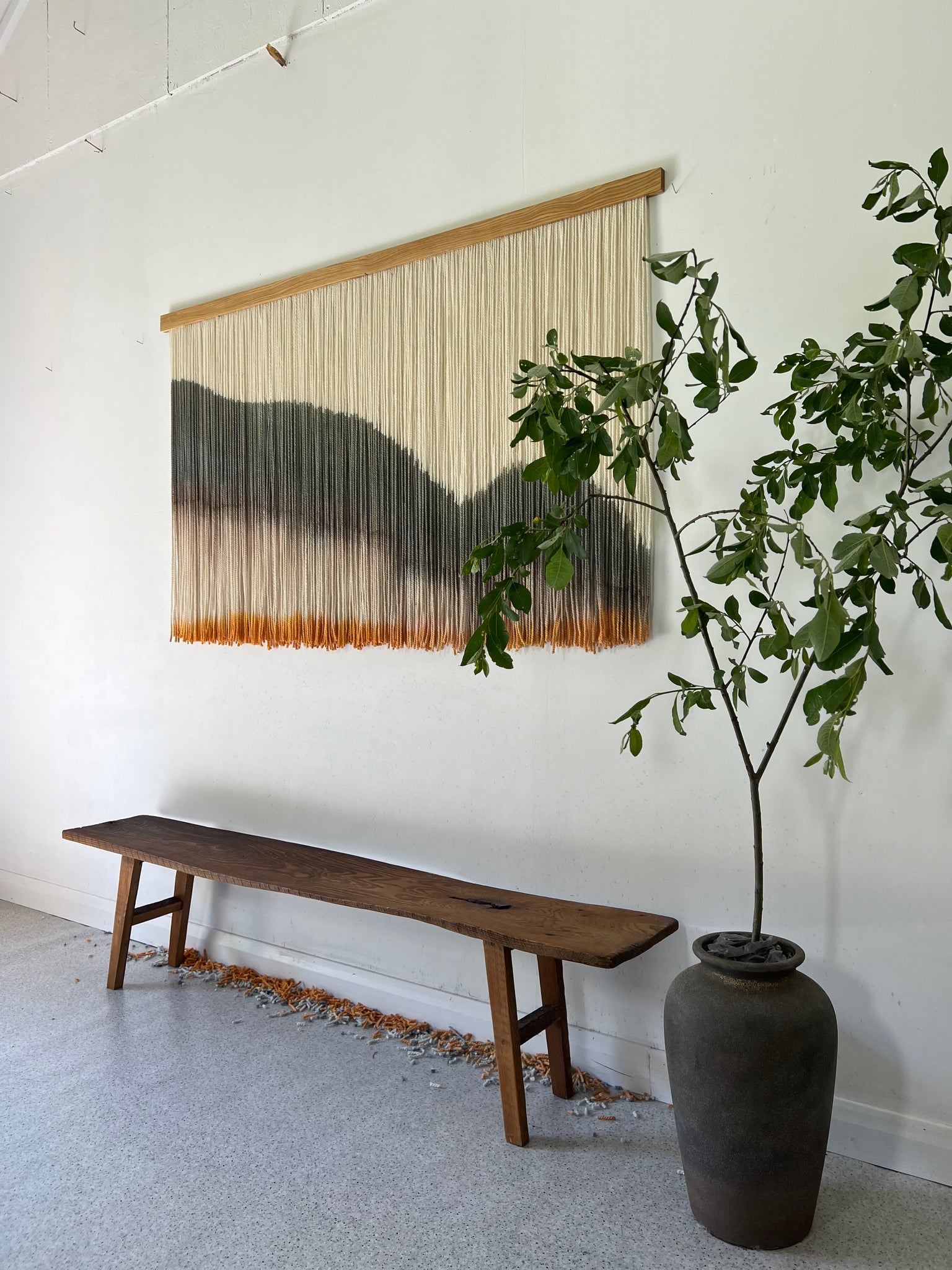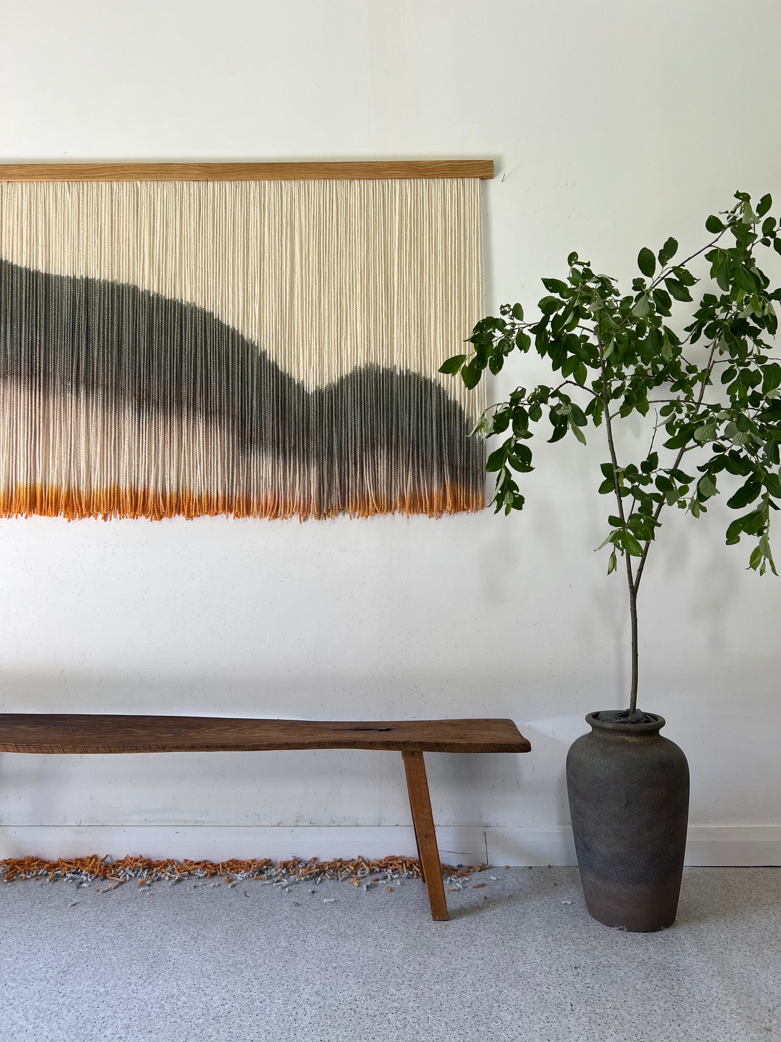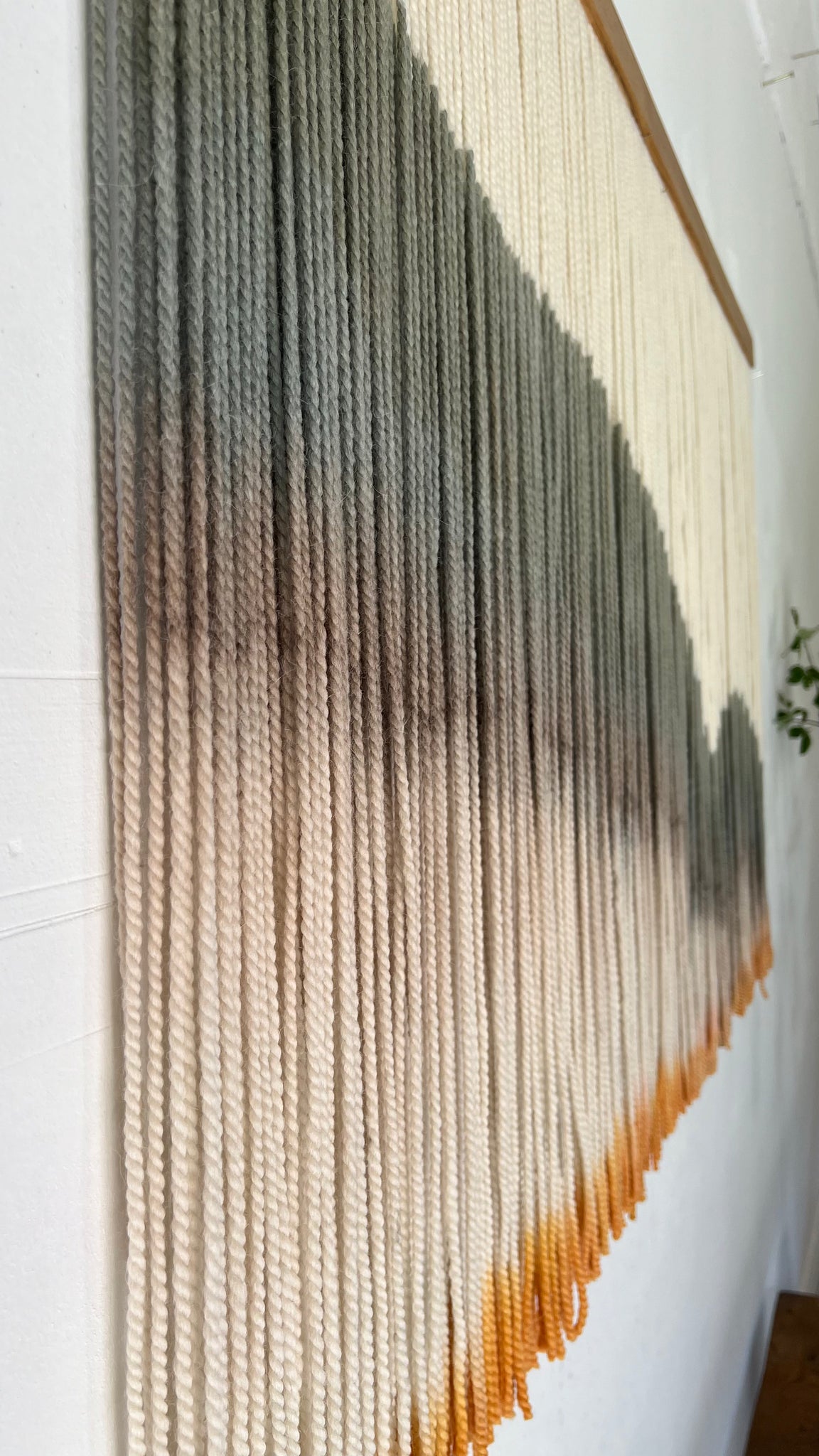 This dip dye wall hanging is made of natural color soft wool in shades of gray, charcoal, and ginger finished with an oak wood panel. Fiber art like this will suit perfectly a minimalist living room, bohemian bedroom and warm office.