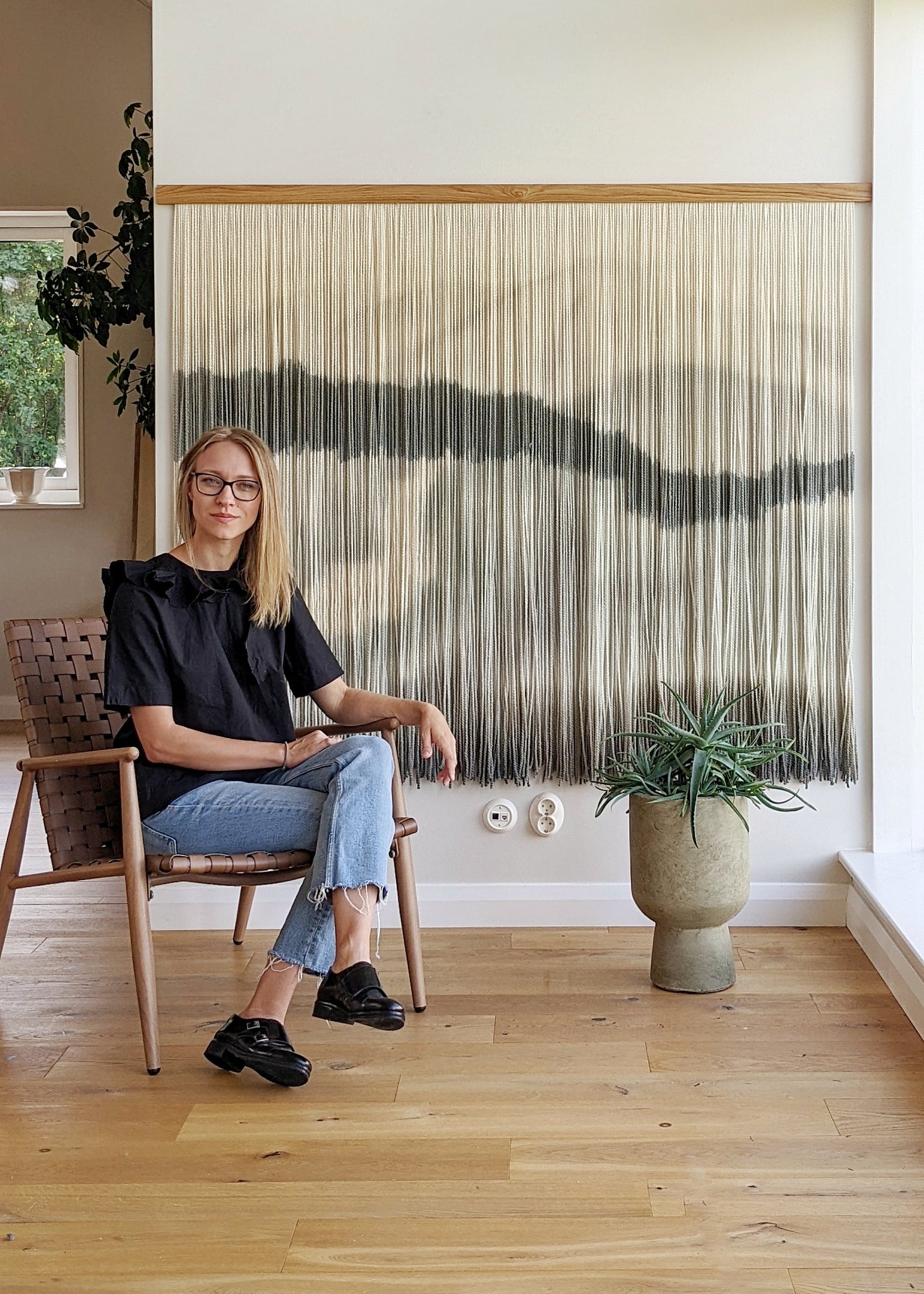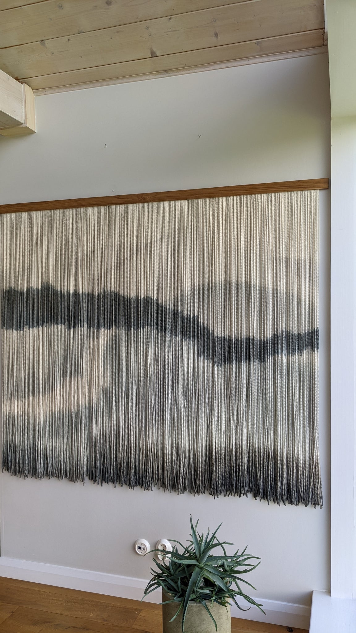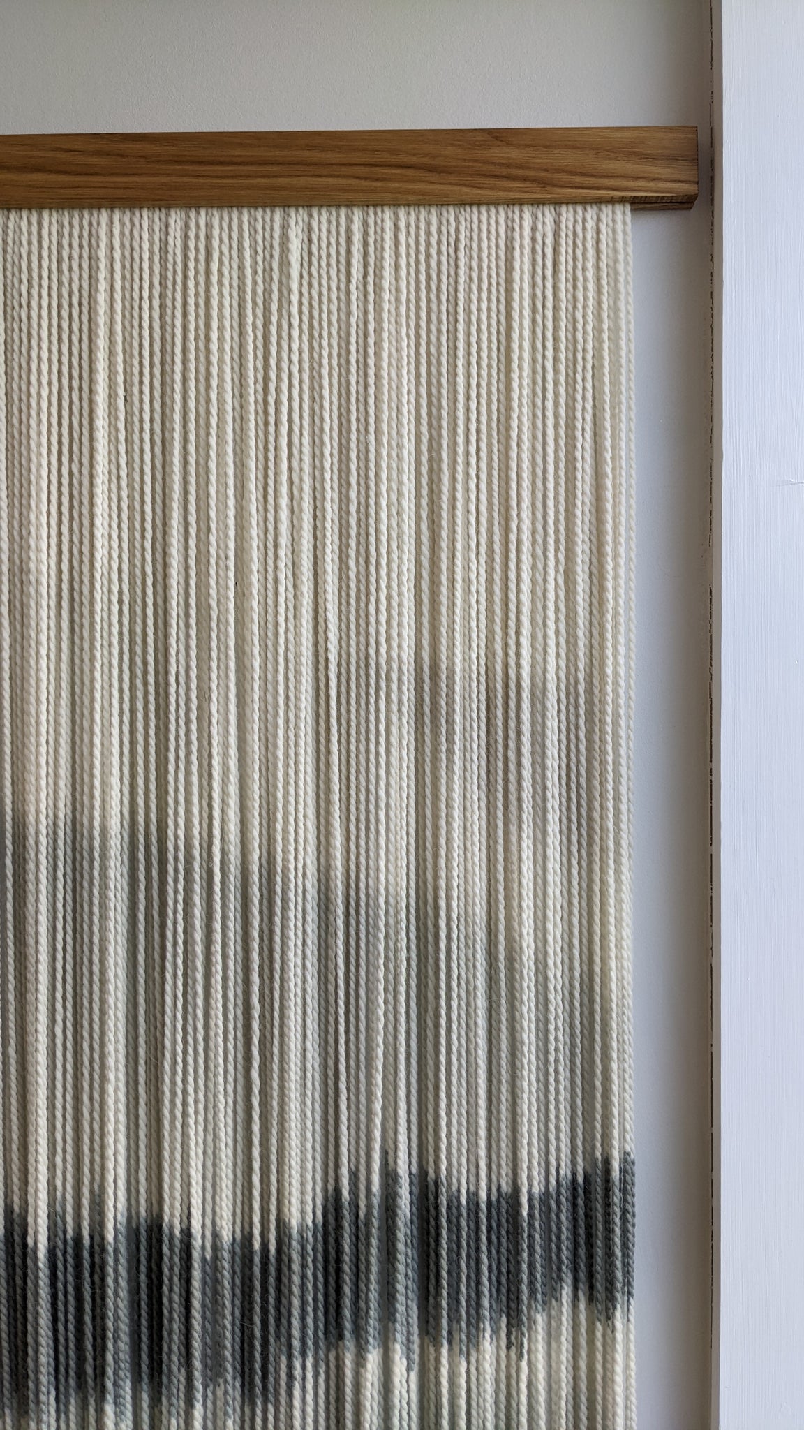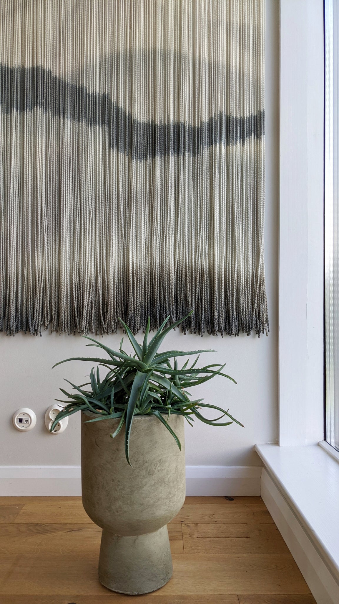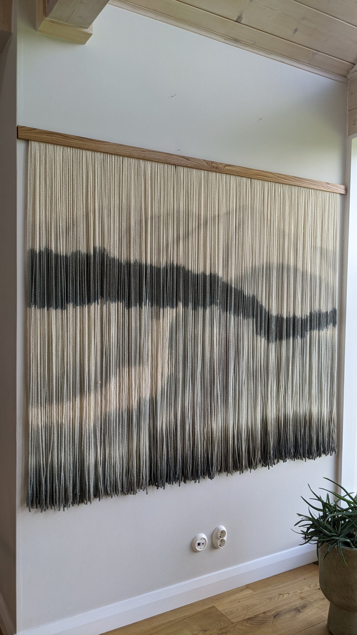 This dip dyed wall hanging is made of natural color soft wool, in shades of black, charcoal, graphite and gray, finished with an oak wood panel. Fiber art like this will suit perfectly a wabi-sabi living room, bohemian bedroom and warm office.