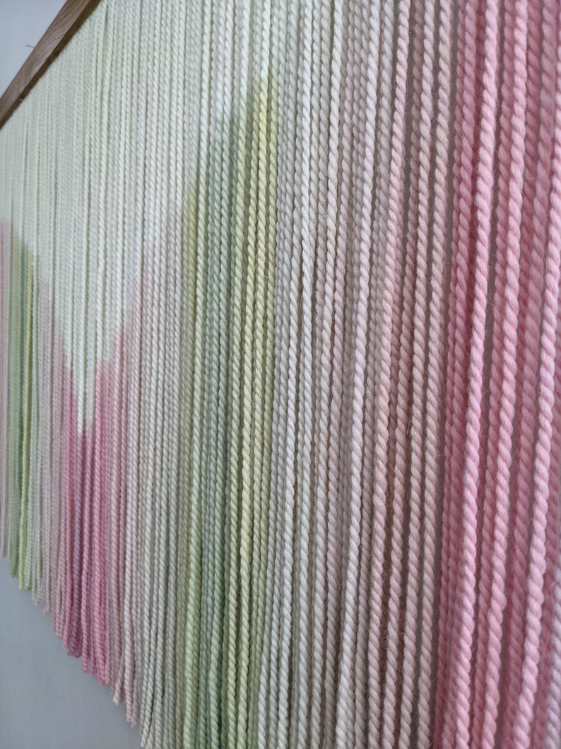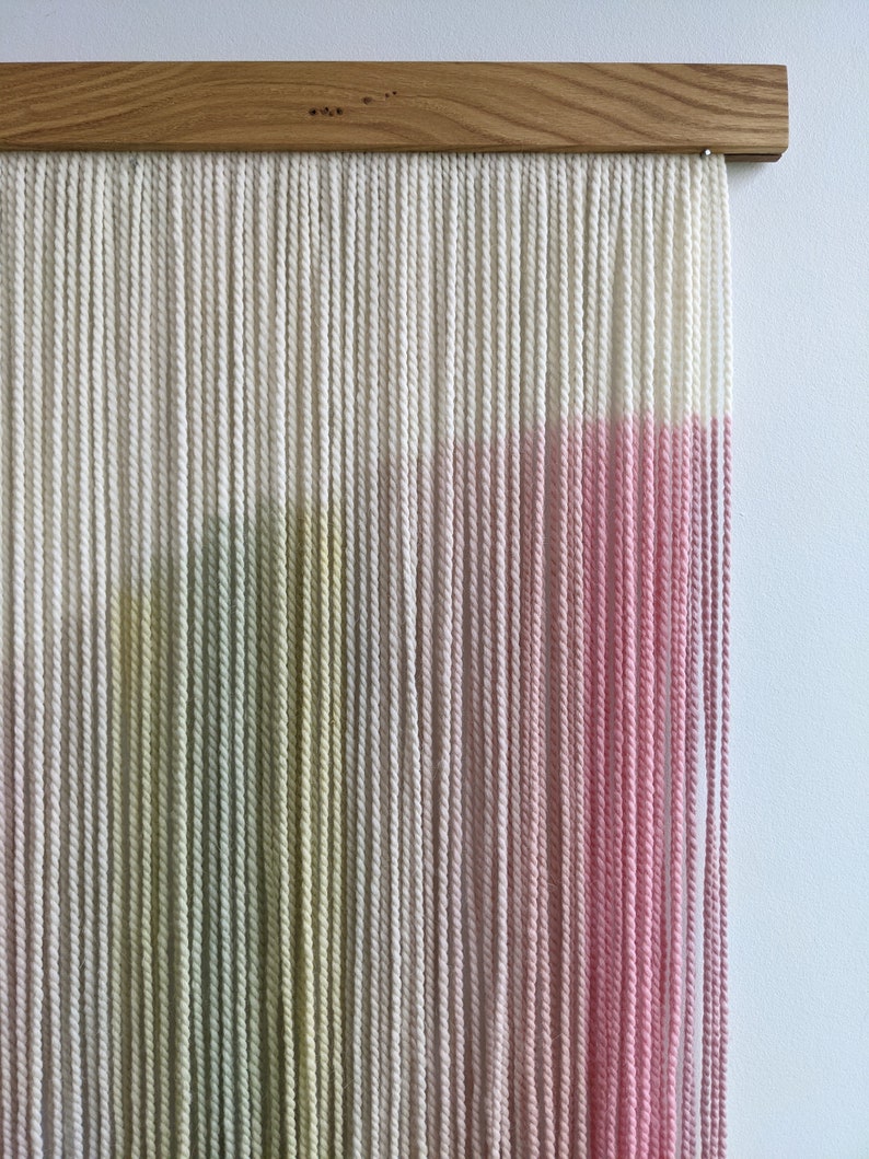 This large dip dyed wall hanging is made of soft wool, in shades of pink, blush, and green, finished with an oak wood panel. Fiber art like this will suit perfectly a bohemian living room, kids bedroom, and nursery.