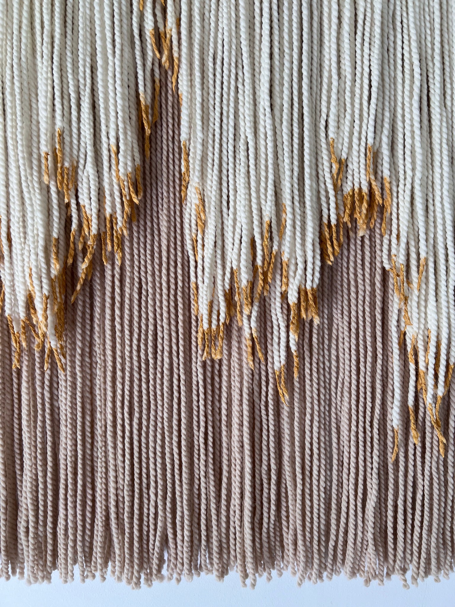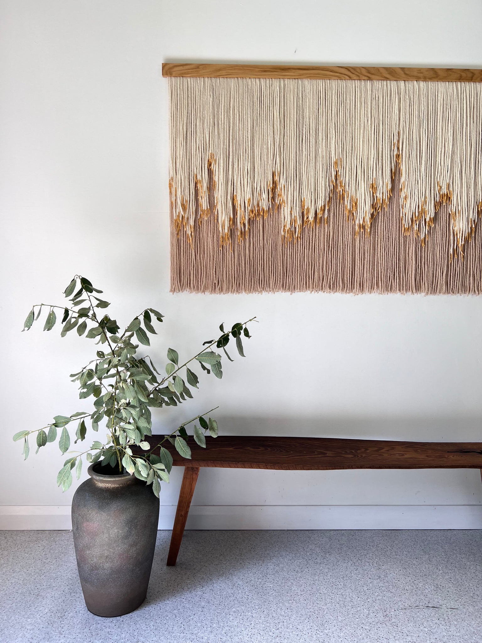 This two-layered wall hanging is made of natural color soft wool dyed beige, with the addition of gold acrylic paint (Kat's signature addition), finished with an oak/ash wood panel. Fiber art like this will suit perfectly a minimal living room, glamour bedroom, and elegant office space.