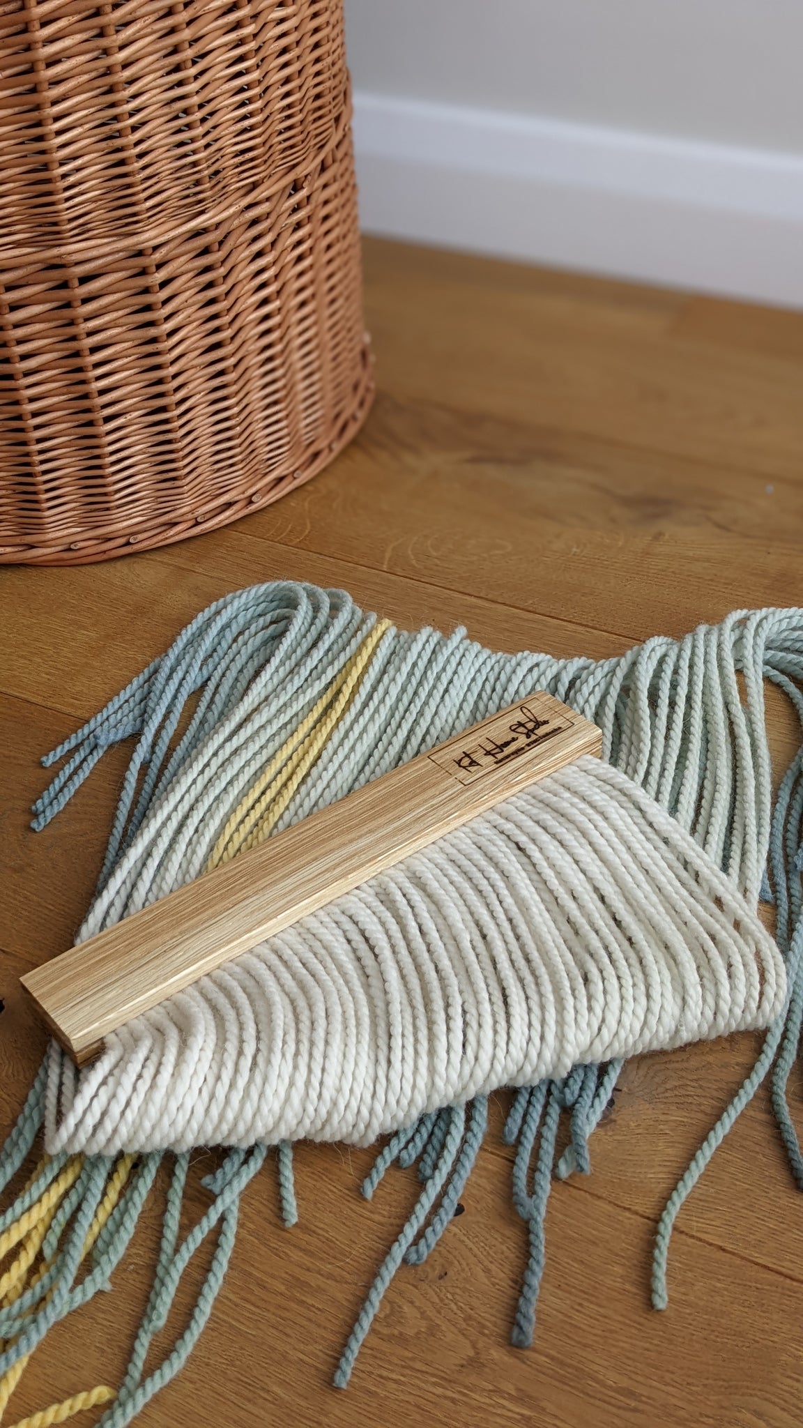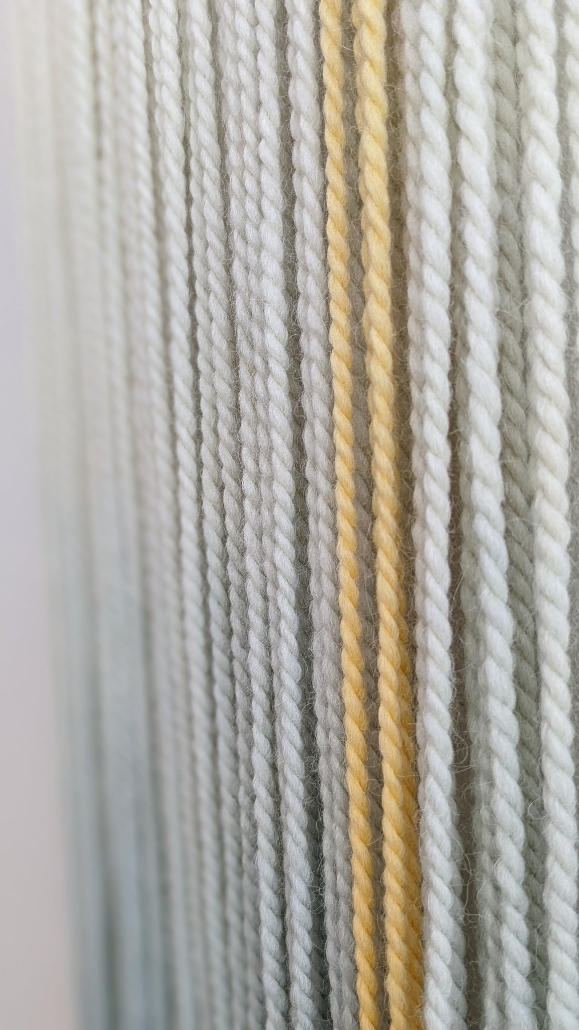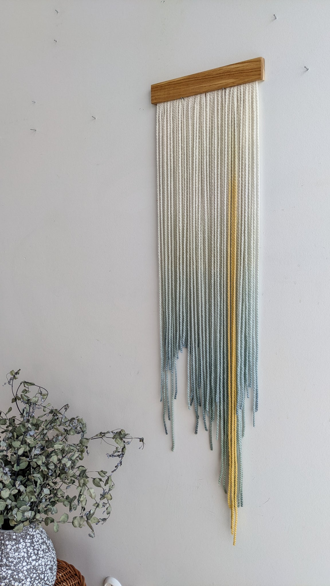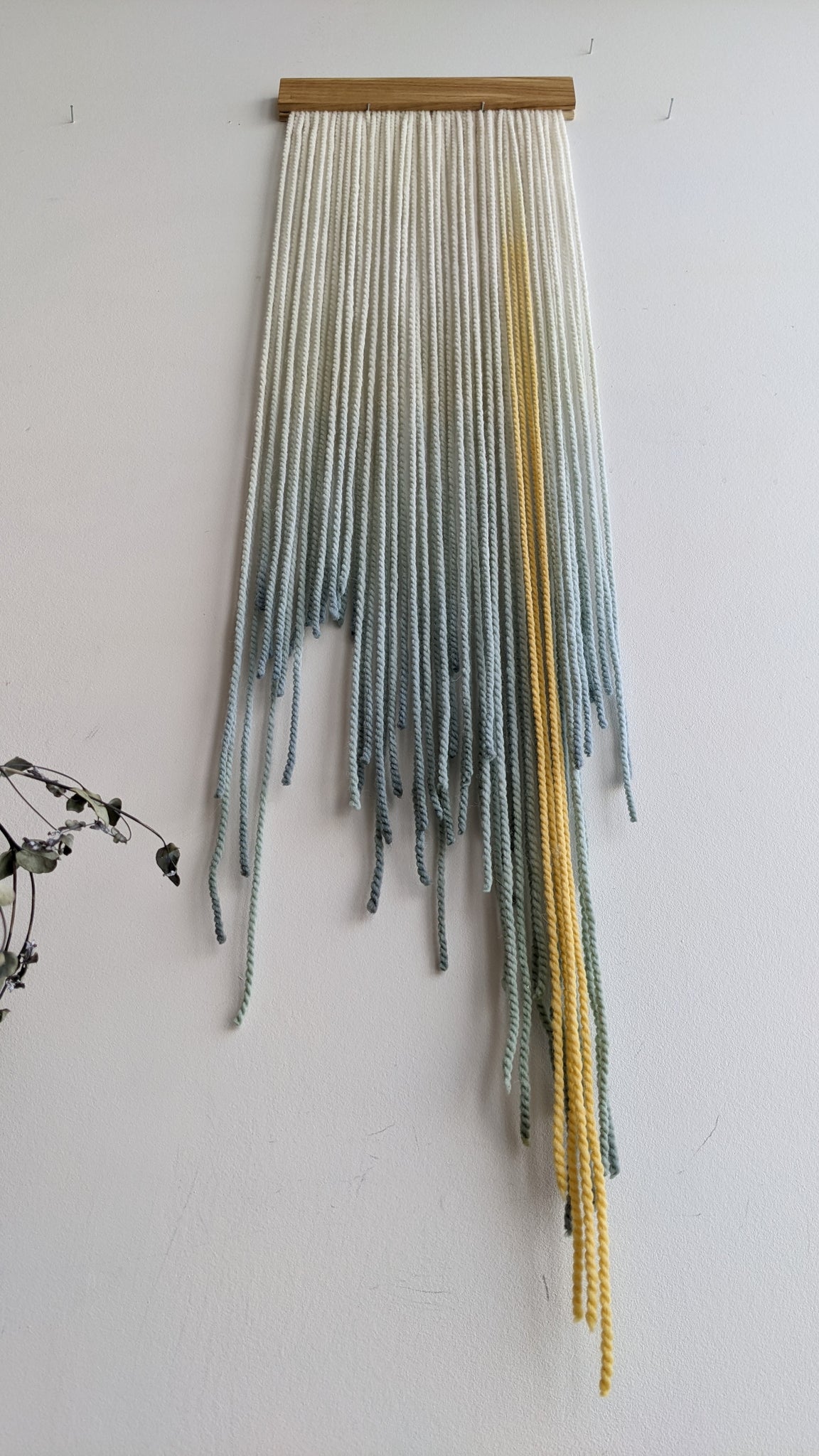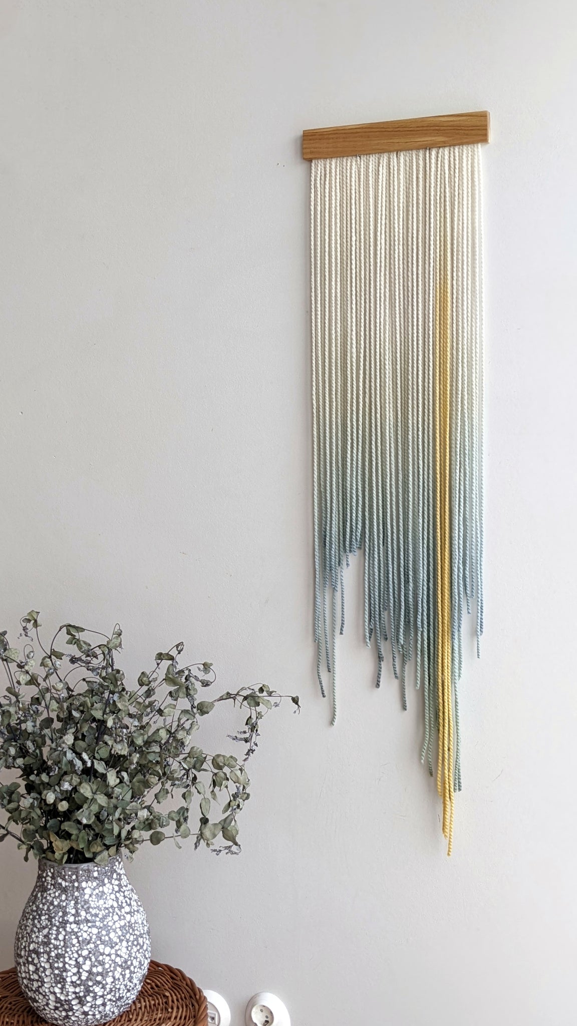 This small dip dyed wall hanging is made of soft wool, in shades of gray, green, yellow and blue, finished with an oak wood panel. Fiber art like this will suit perfectly a contemporary living room, sweet nursery, staircase and bedroom.