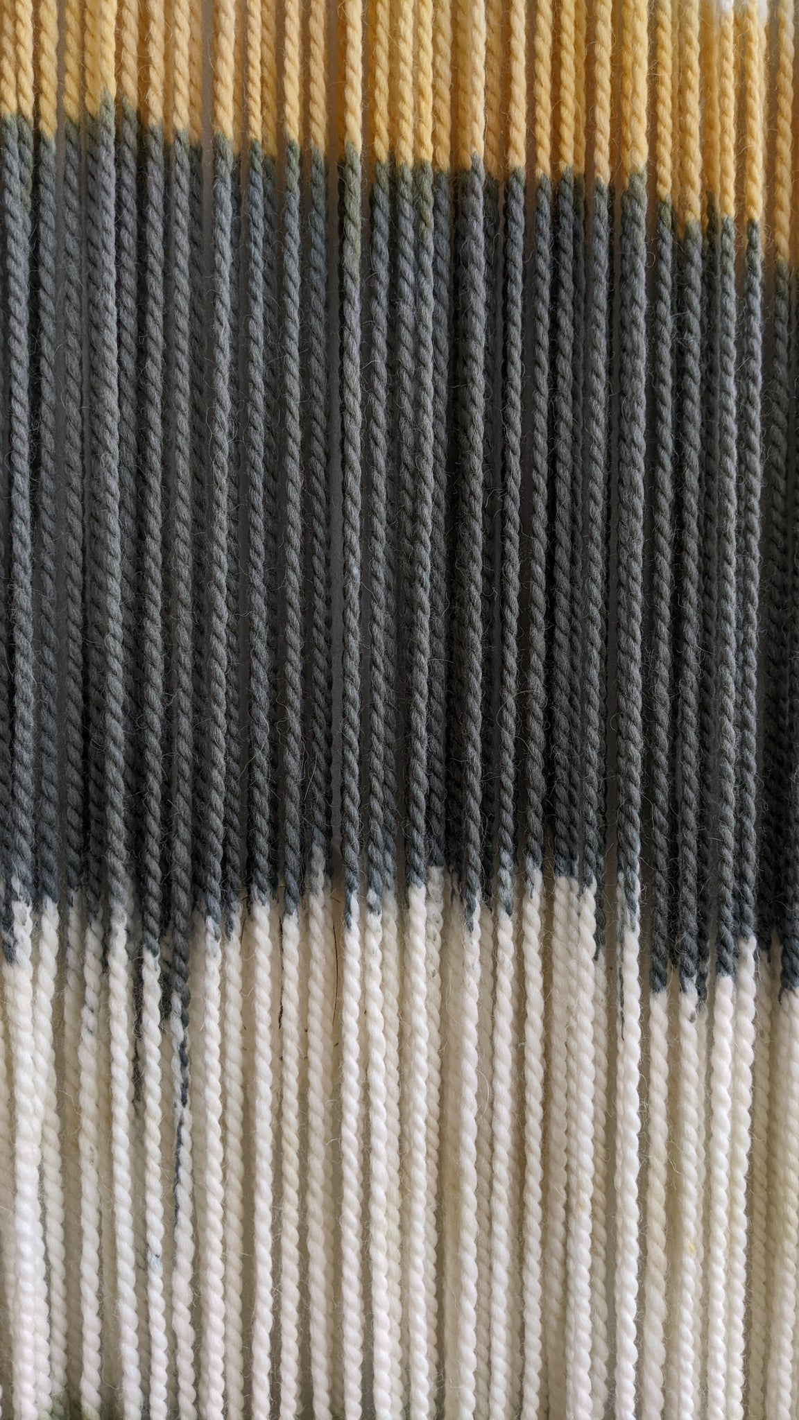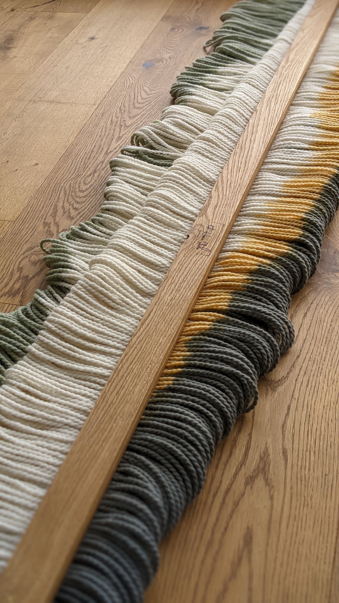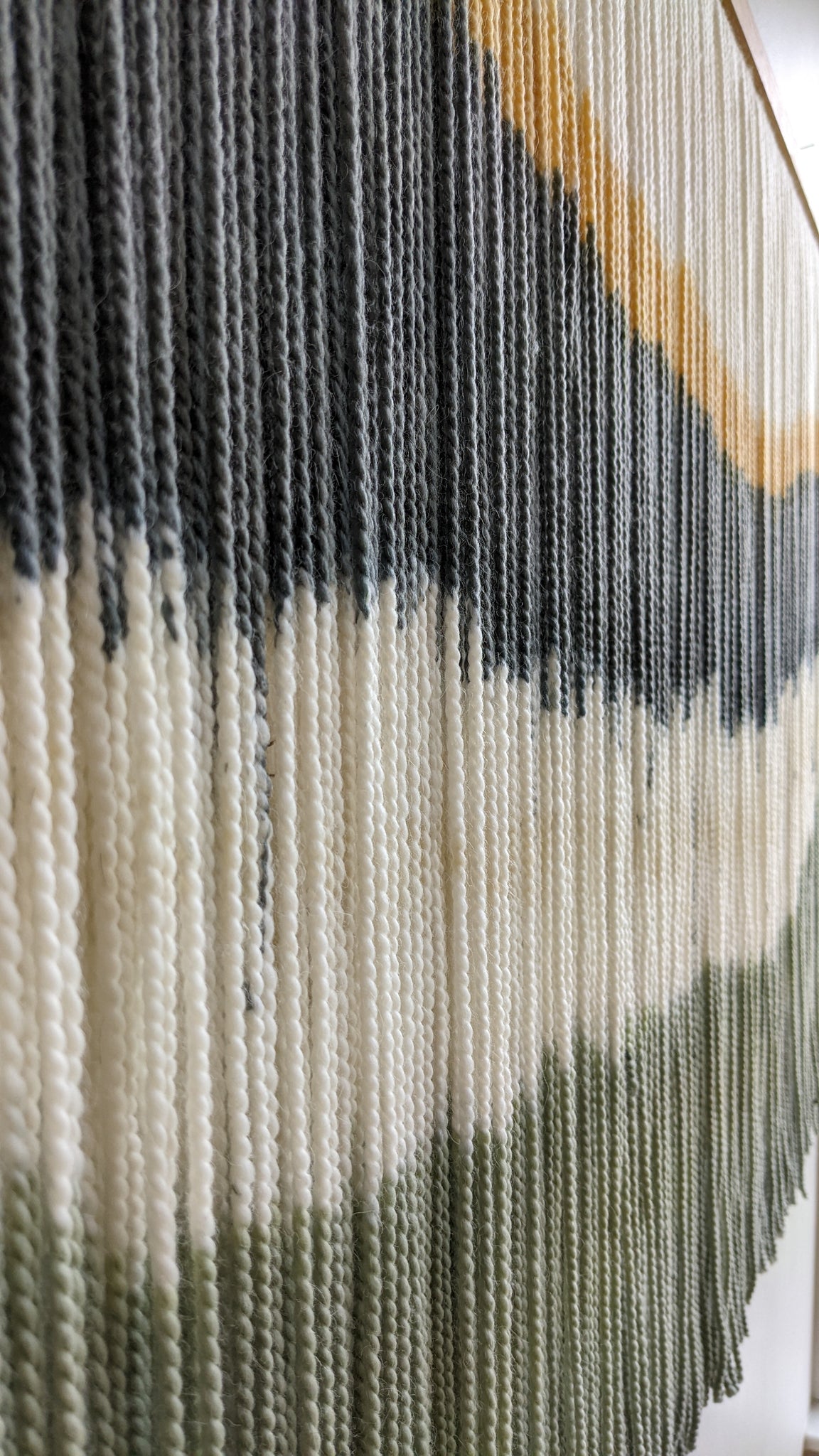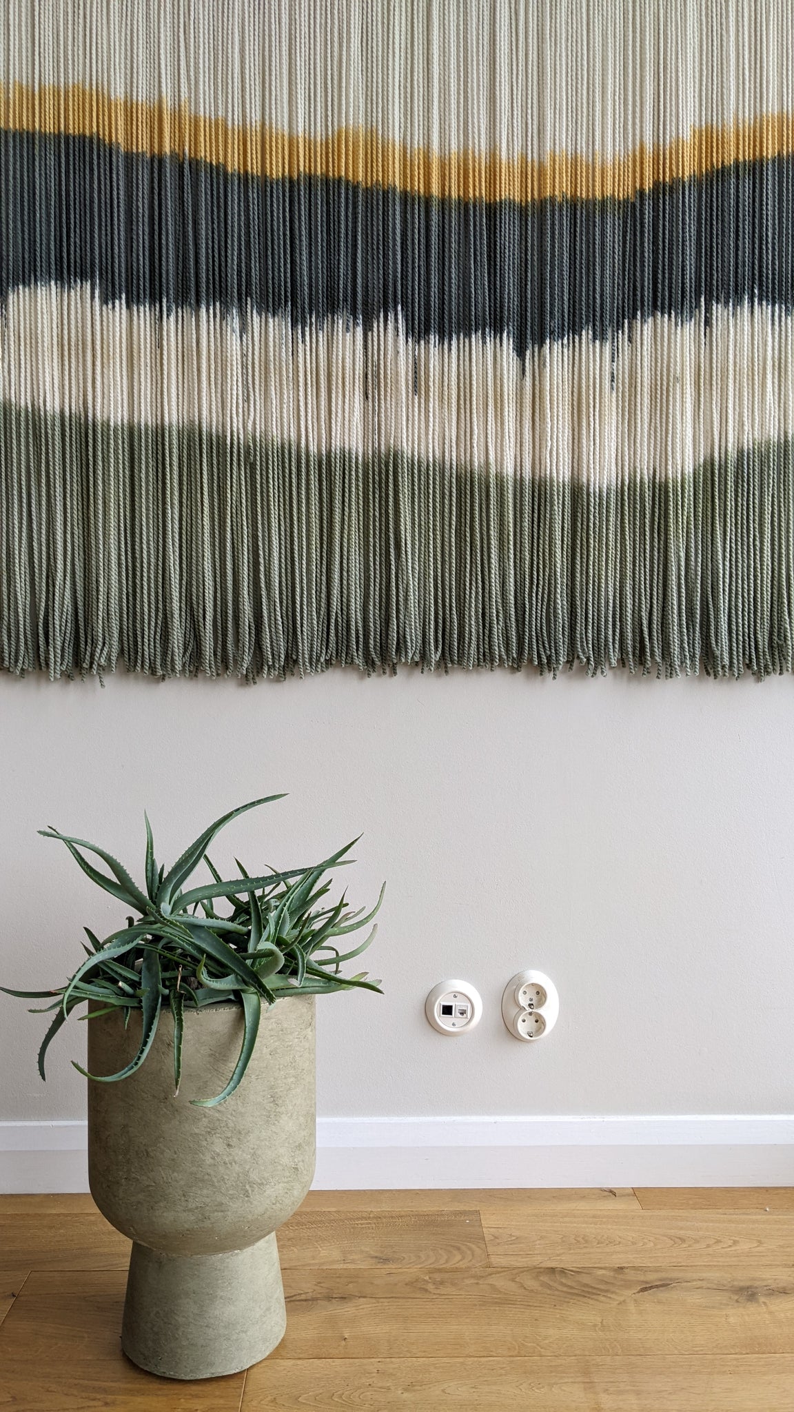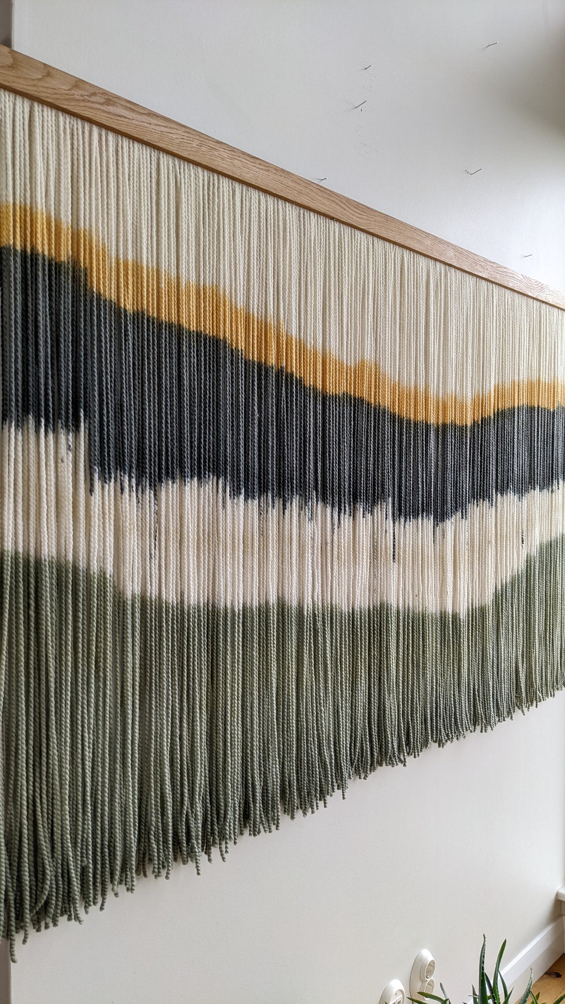 This dip dyed wall hanging is made of natural color soft wool, in shades of honey, green, beige and black, with the addition of gold acrylic paint, finished with an oak wood panel. Fiber art like this will suit perfectly a colorful living room, bohemian bedroom and contemporary office.
