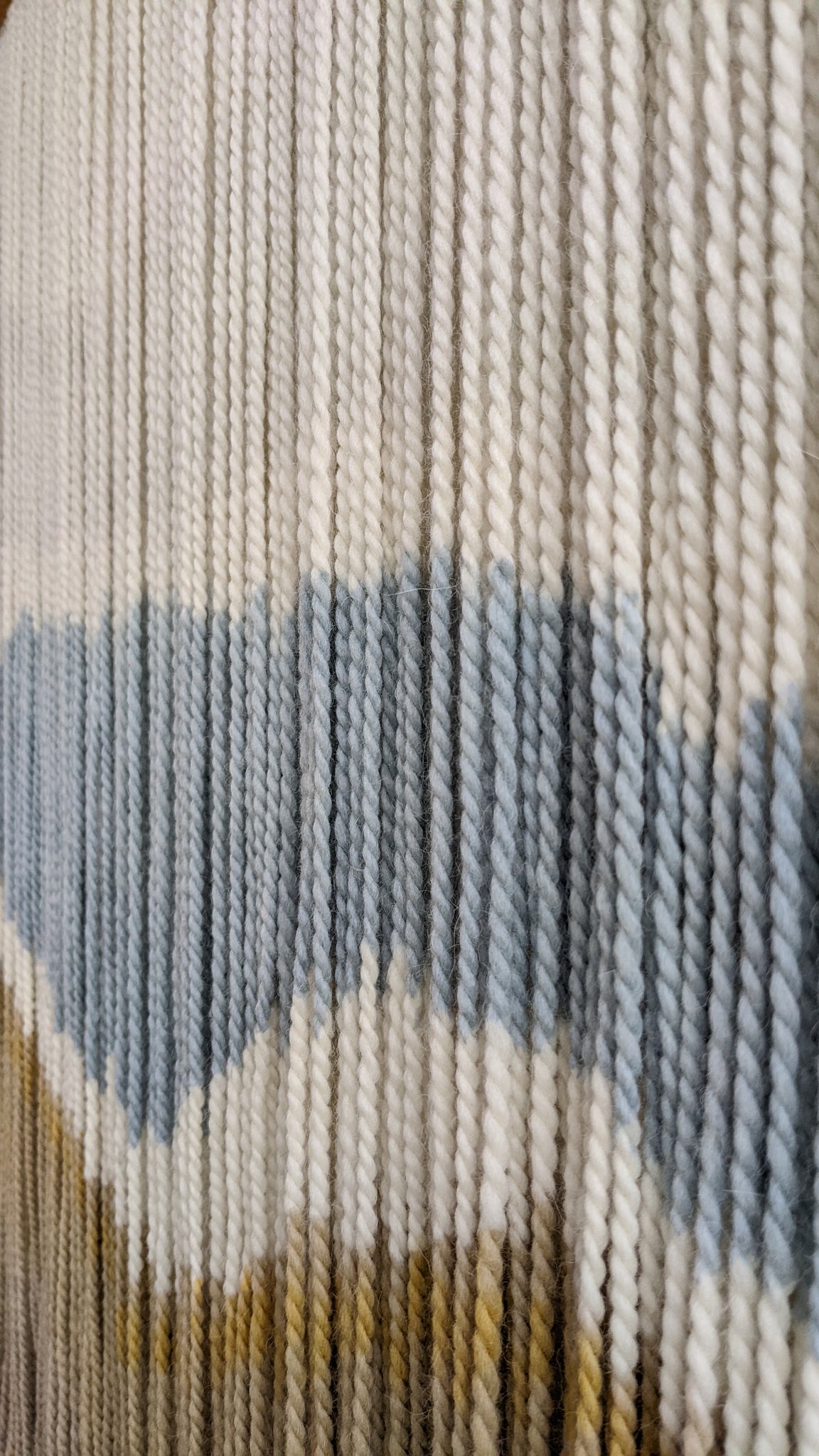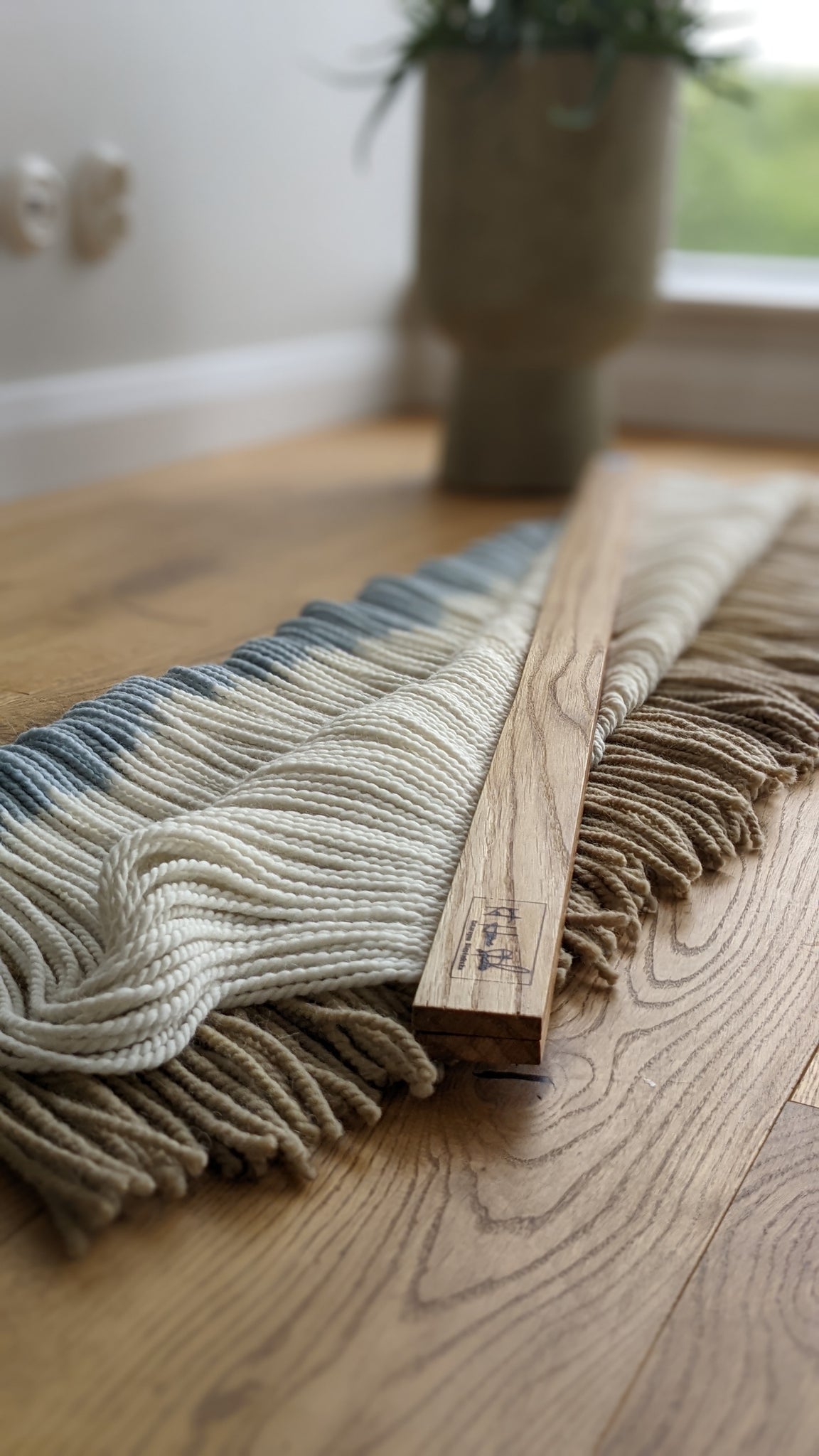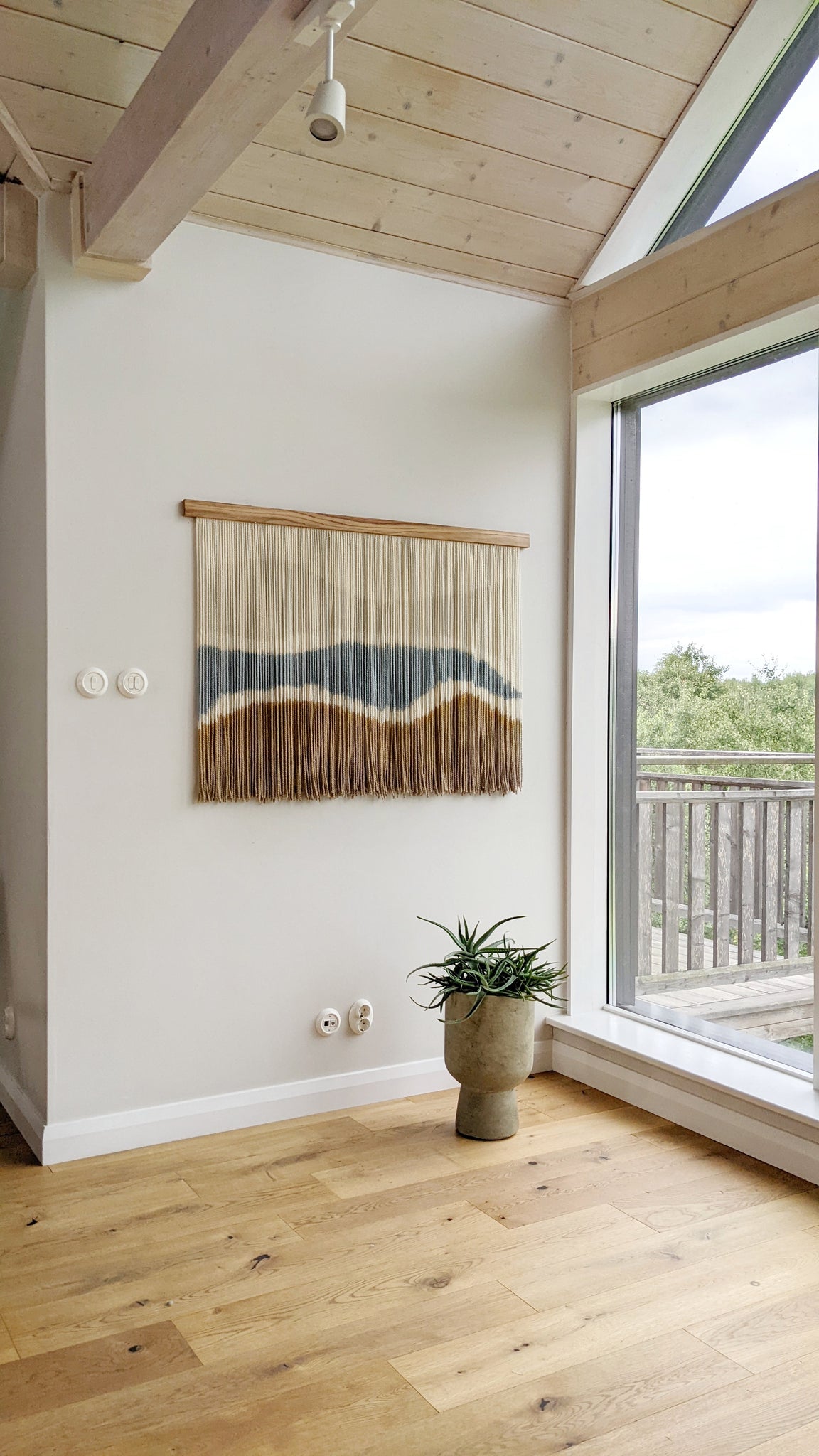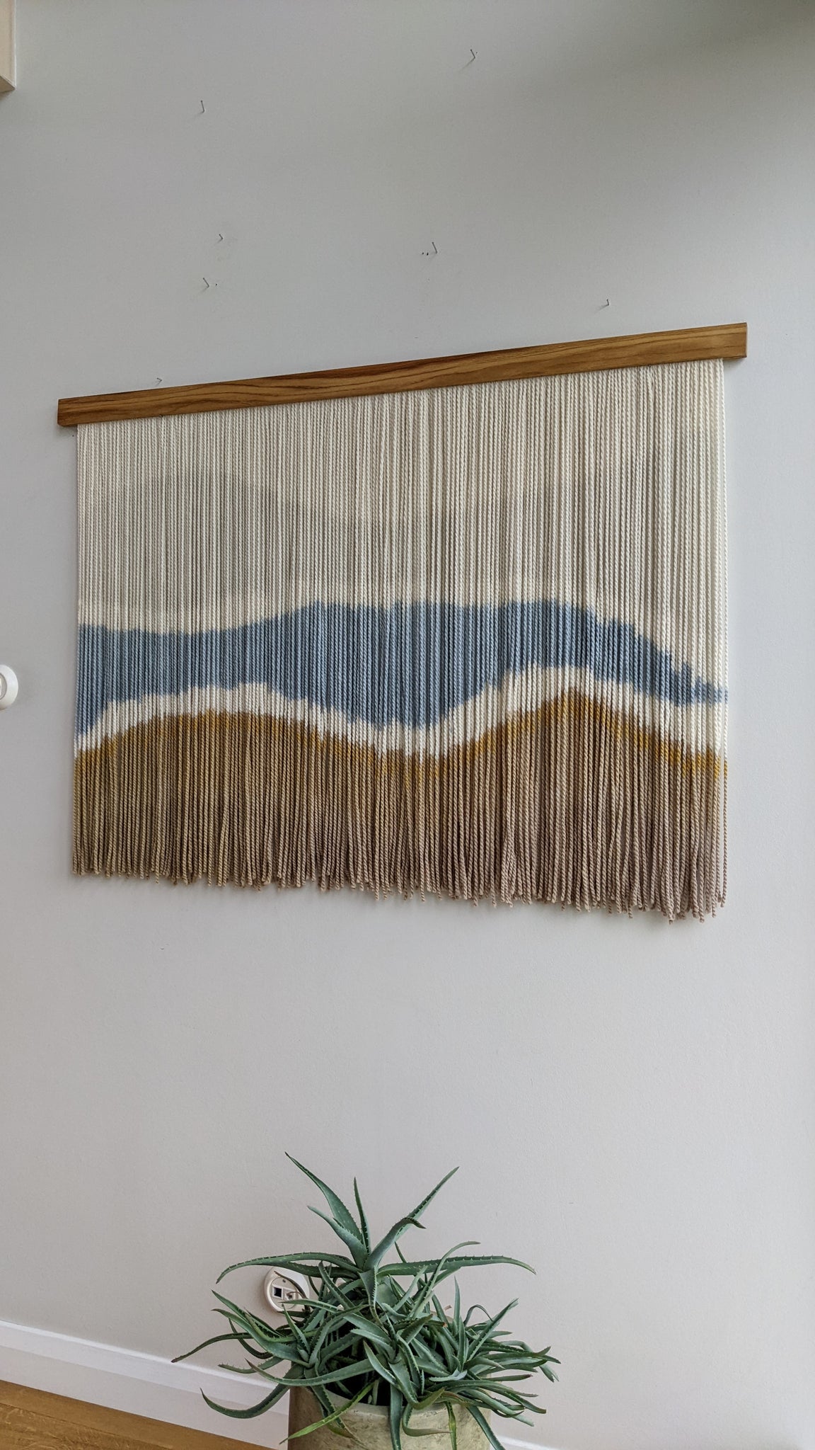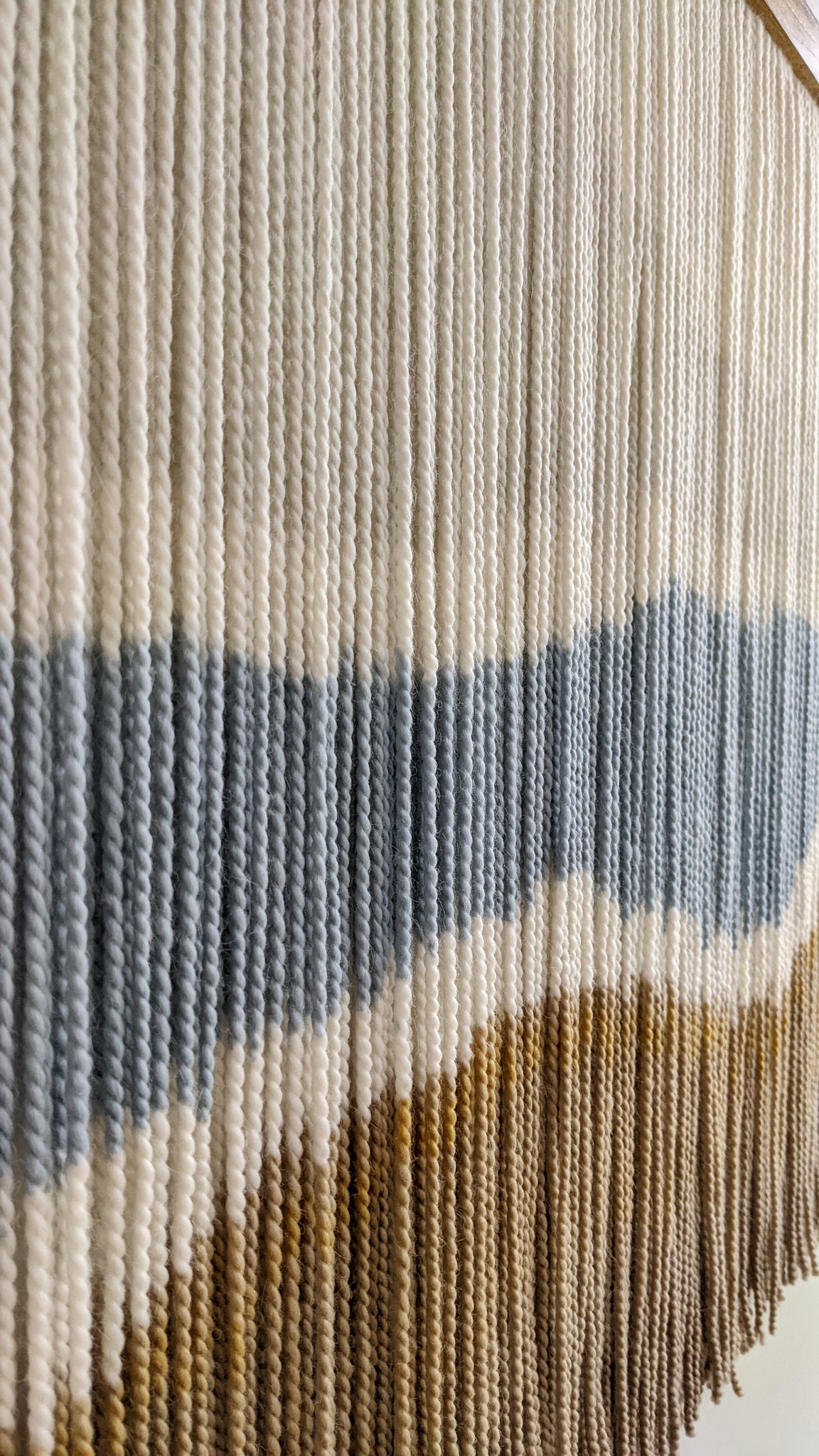 This dip dyed wall hanging is made of natural color soft wool, in shades of gray, blue, honey and brown, finished with an oak wood panel. Fiber art like this will suit perfectly a minimalist living room, bohemian bedroom and warm office.
