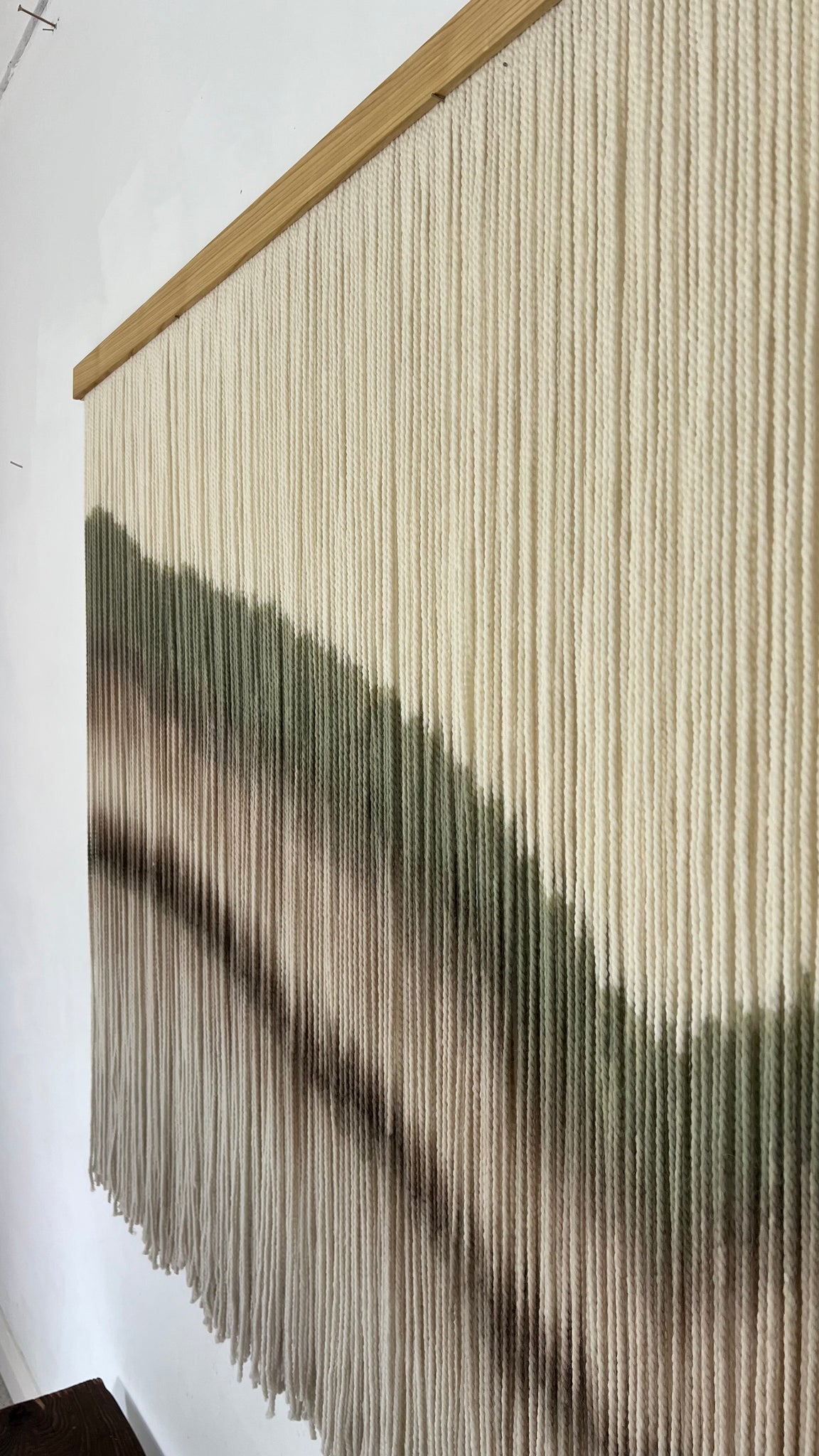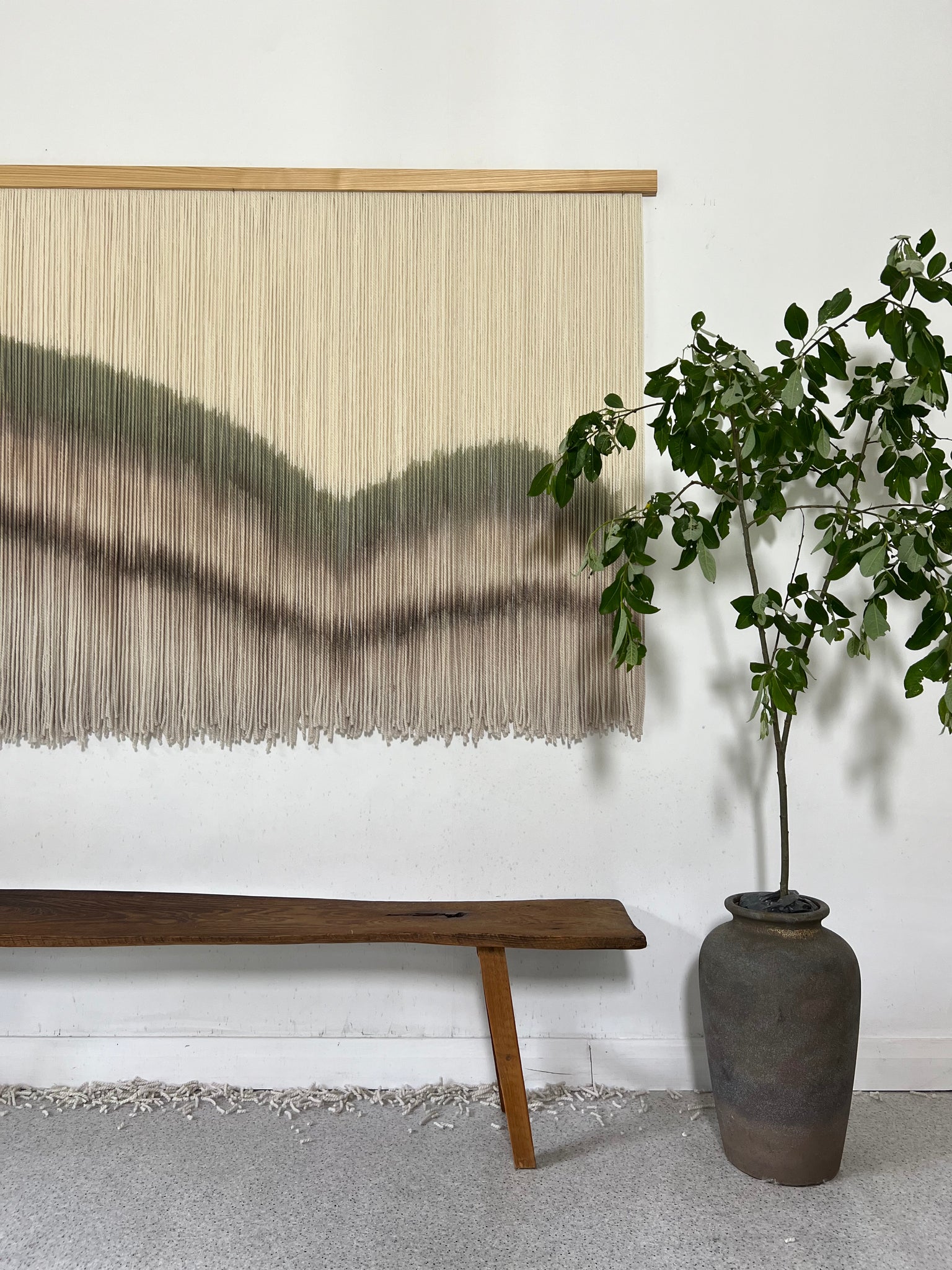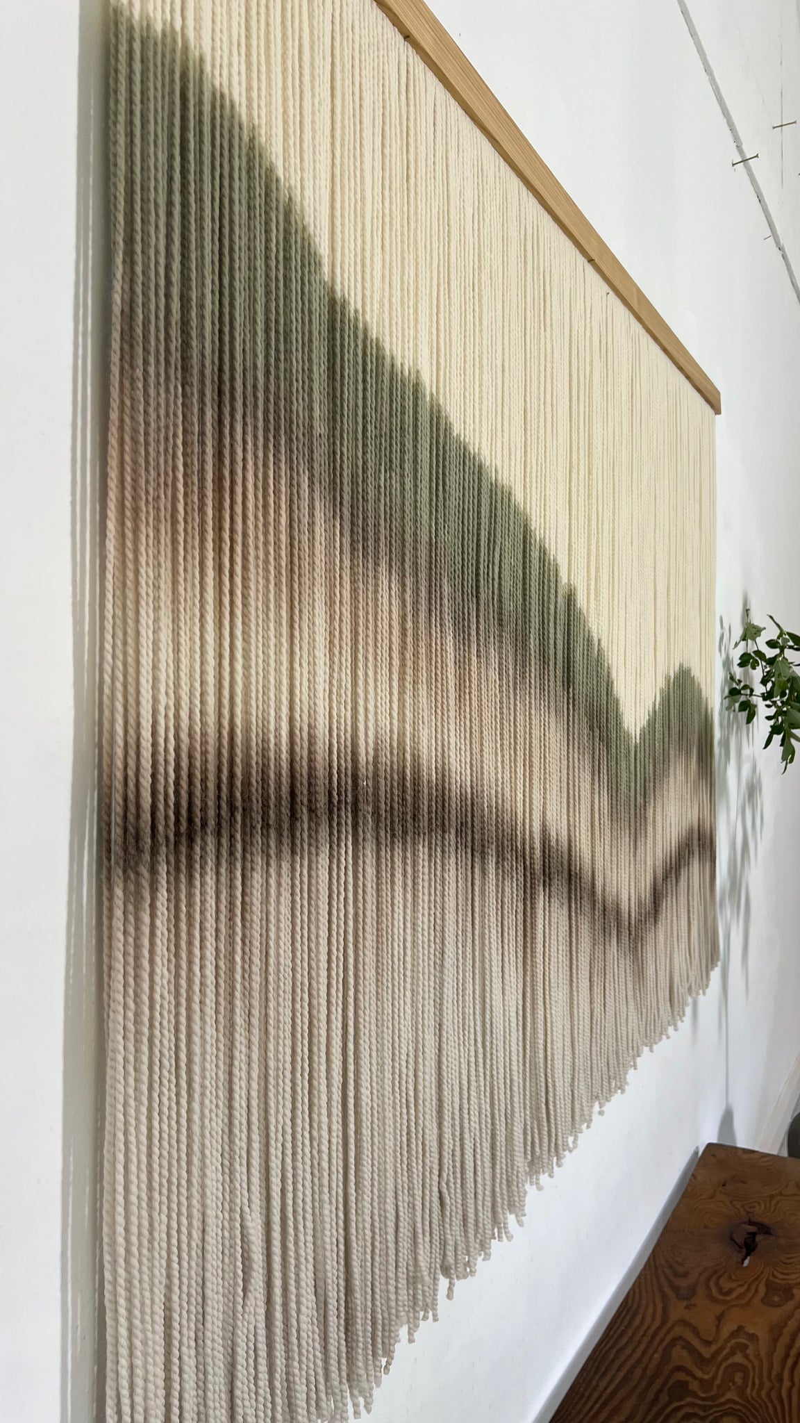 This dip dye wall hanging is made of natural color soft wool in shades of gray, green and brown finished with an oak wood panel. Fiber art like this will suit perfectly a minimalist living room, bohemian bedroom and warm office.