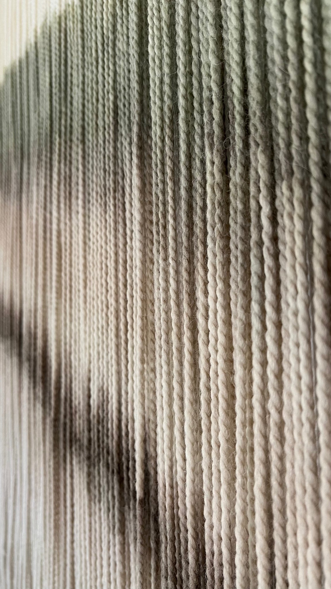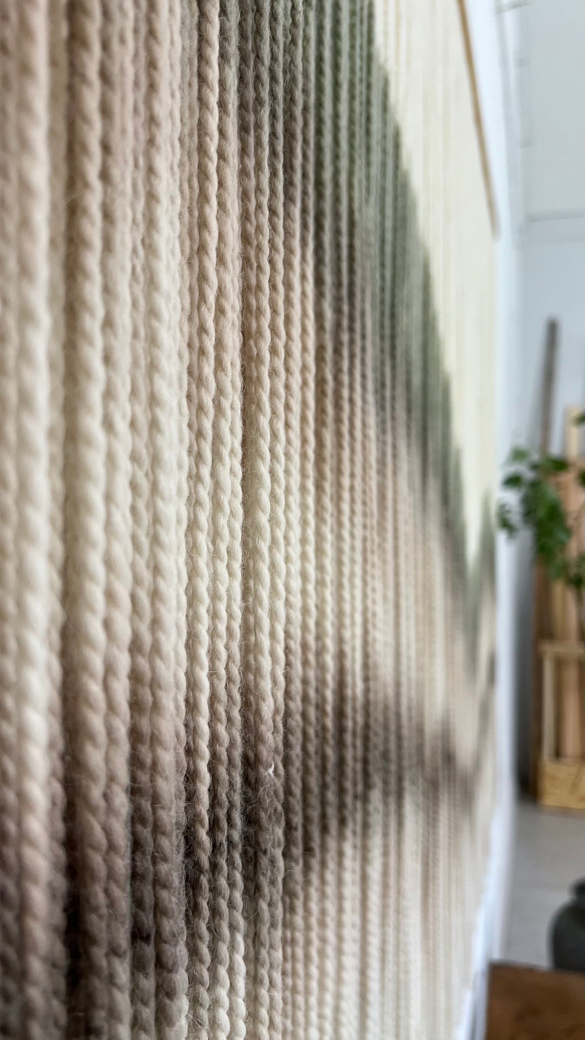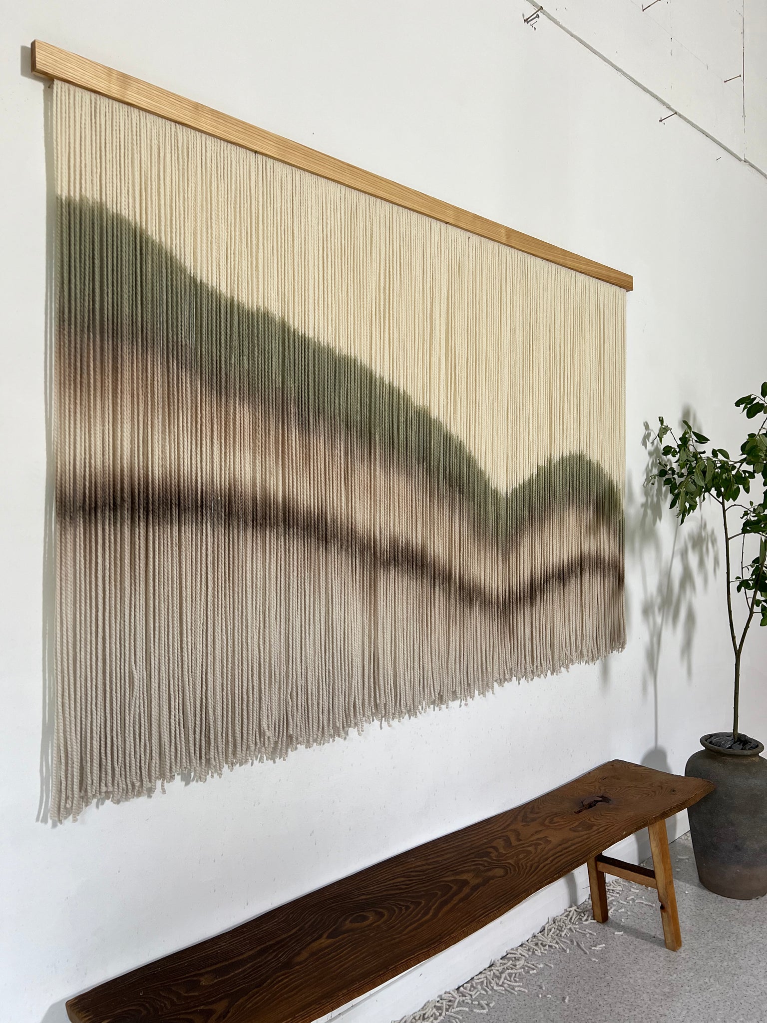 This dip dye wall hanging is made of natural color soft wool in shades of gray, green and brown finished with an oak wood panel. Fiber art like this will suit perfectly a minimalist living room, bohemian bedroom and warm office.