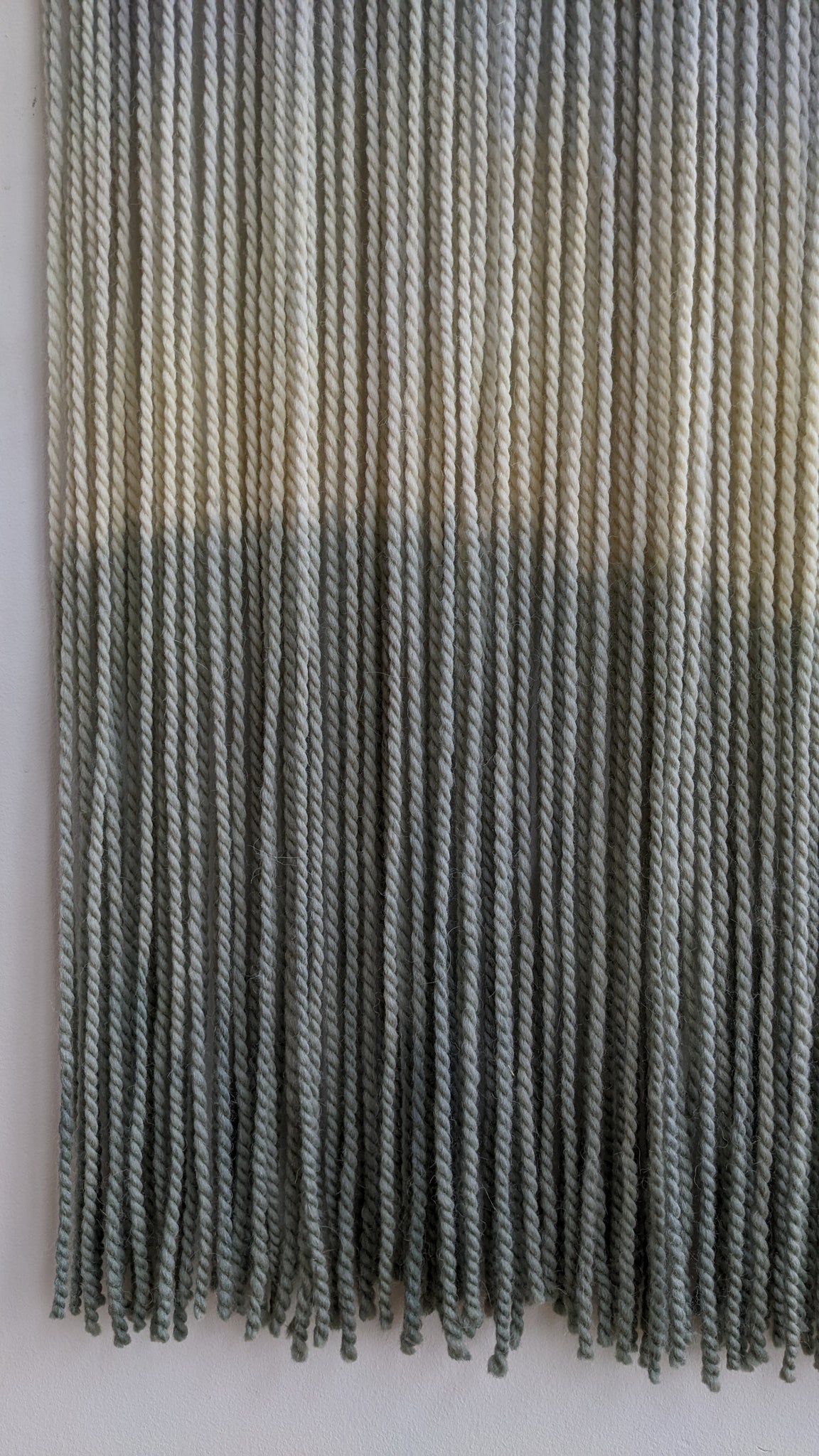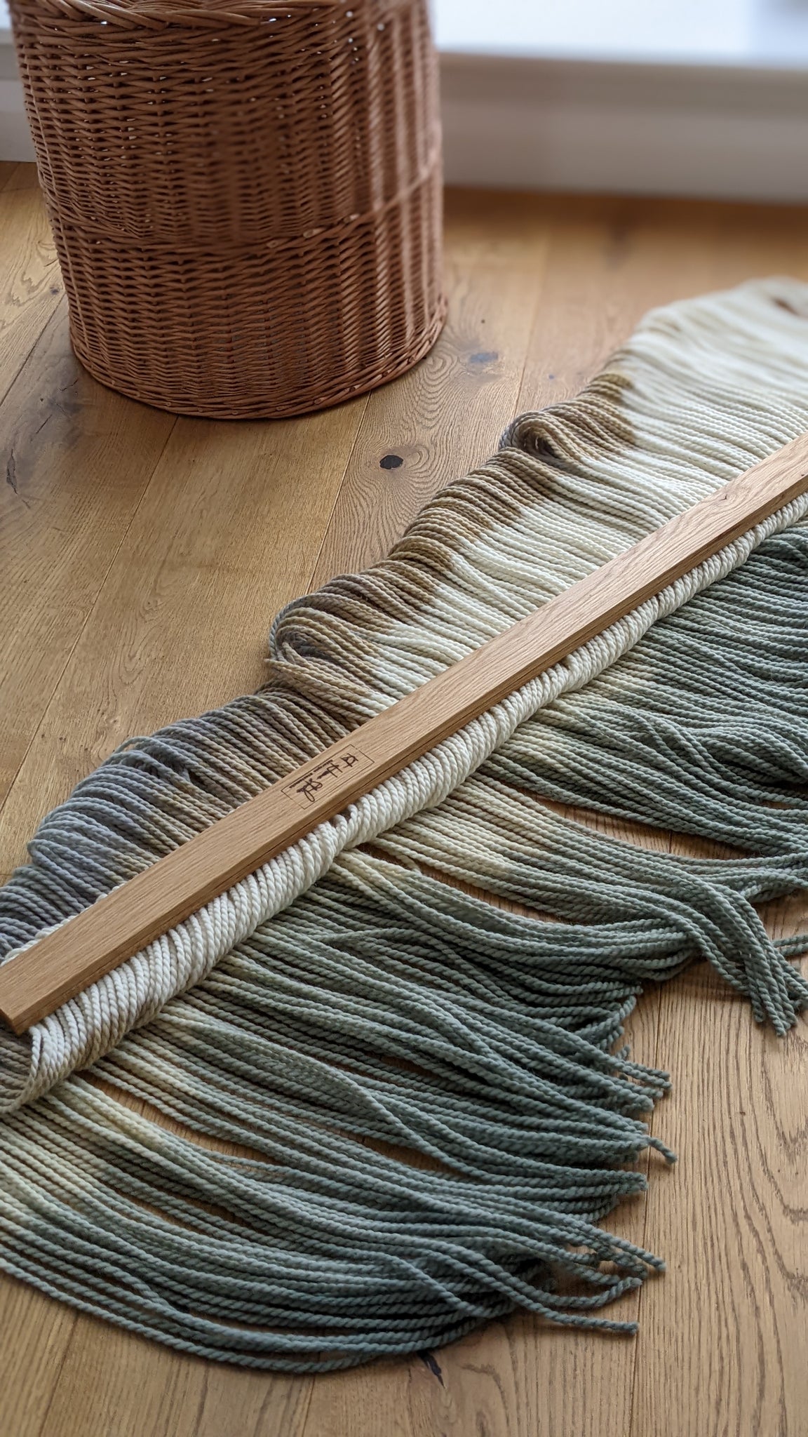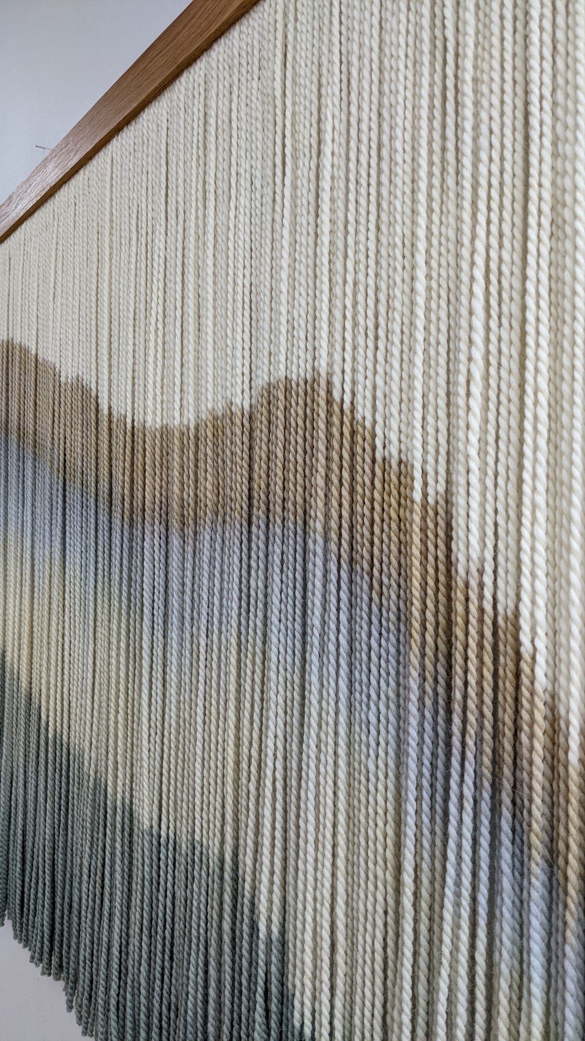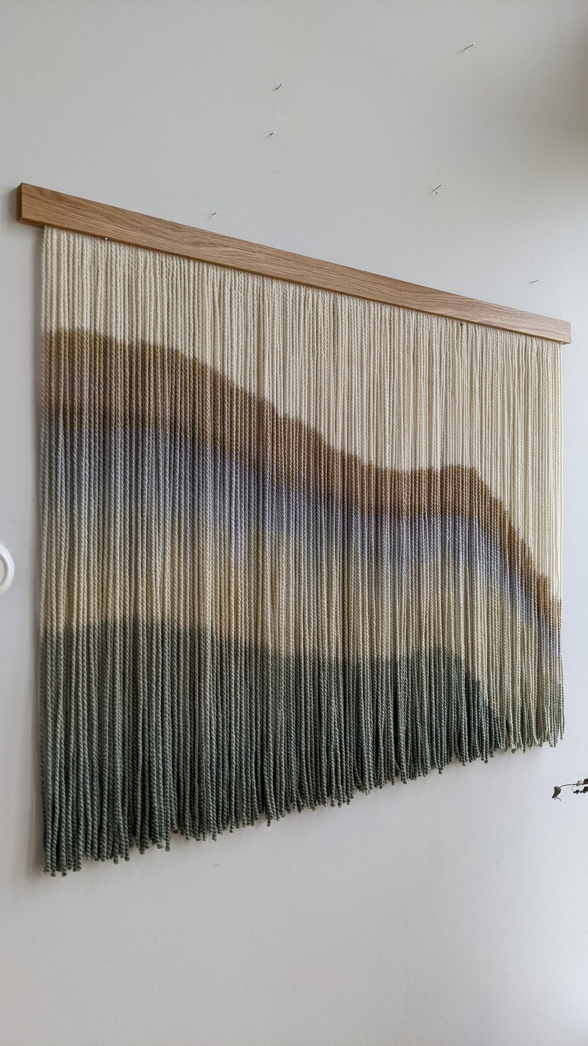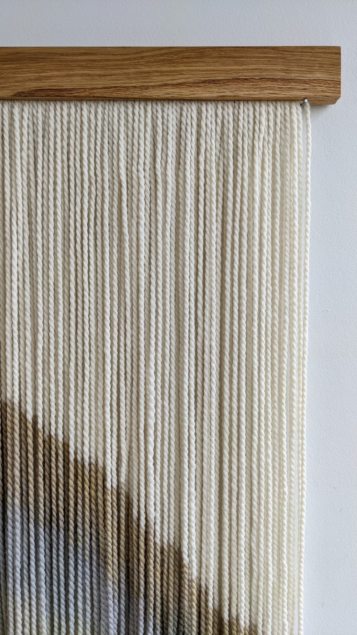 This dip dyed wall hanging is made of soft wool, in shades of bronze, gray, sand and green, finished with an oak wood panel. Fiber art like this will suit perfectly a small living room, bohemian bedroom and entryway.