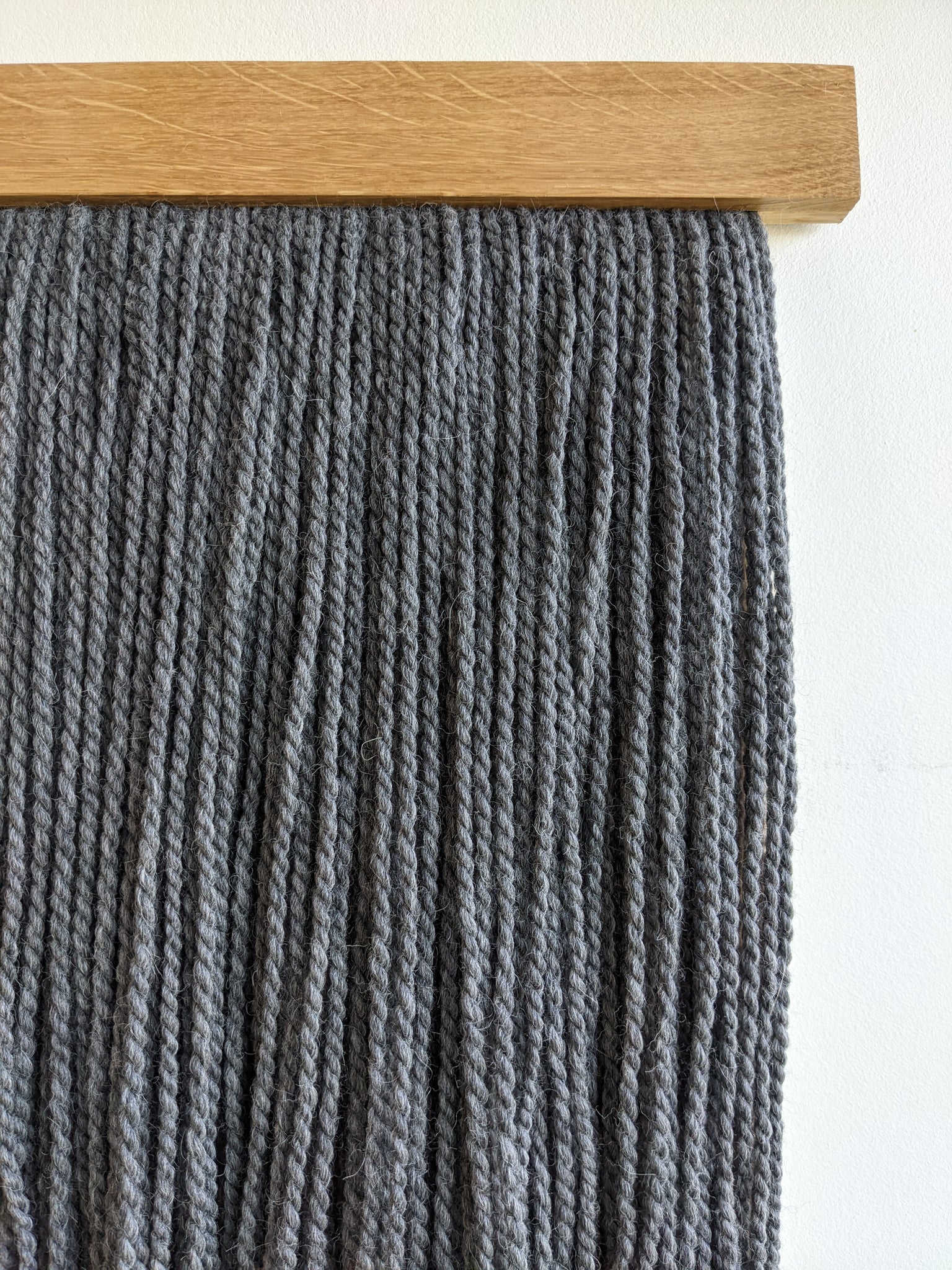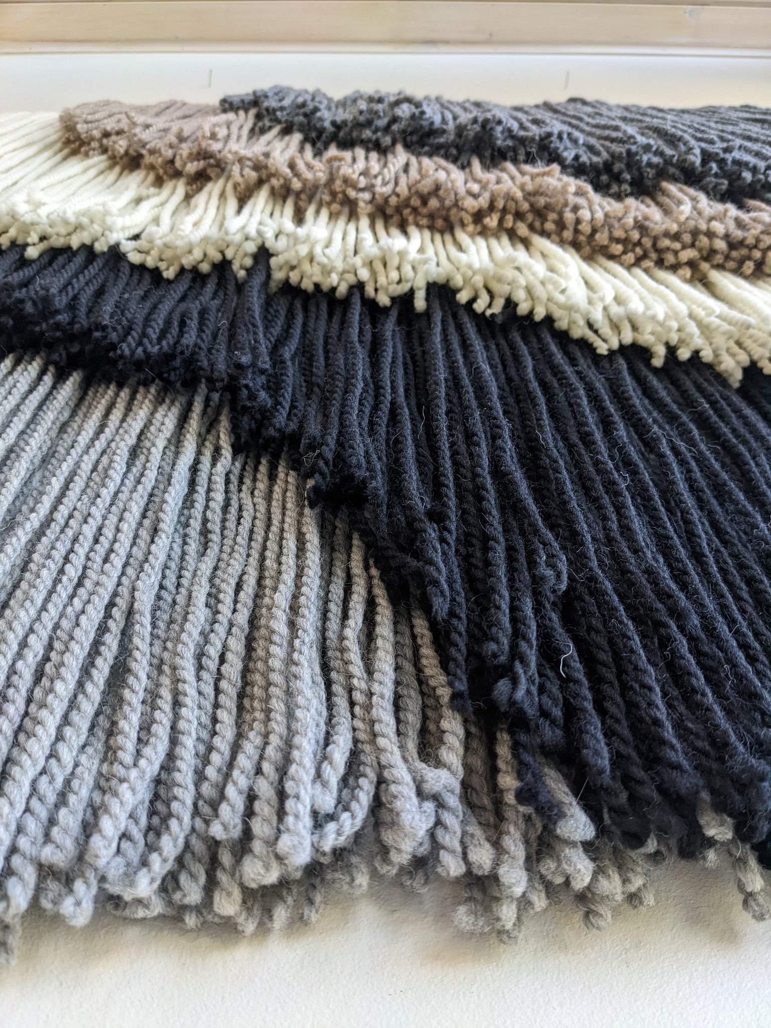 This layered tapestry is made of soft wool, in shades of natural color wool (ecru/off white), gray, beige, and black finished with oak wood panel. Fiber art like this will suit perfectly a minimal living room, modern bedroom, and mid-century office.