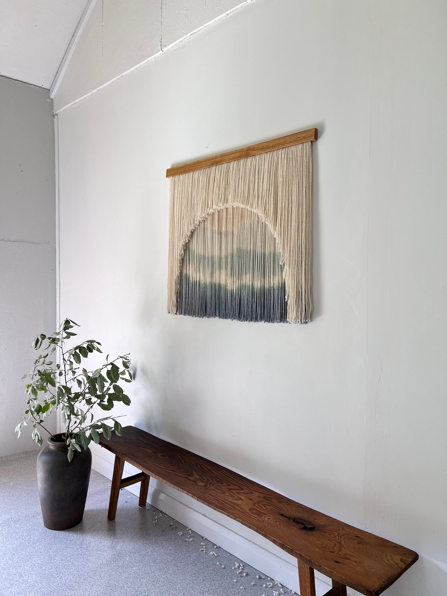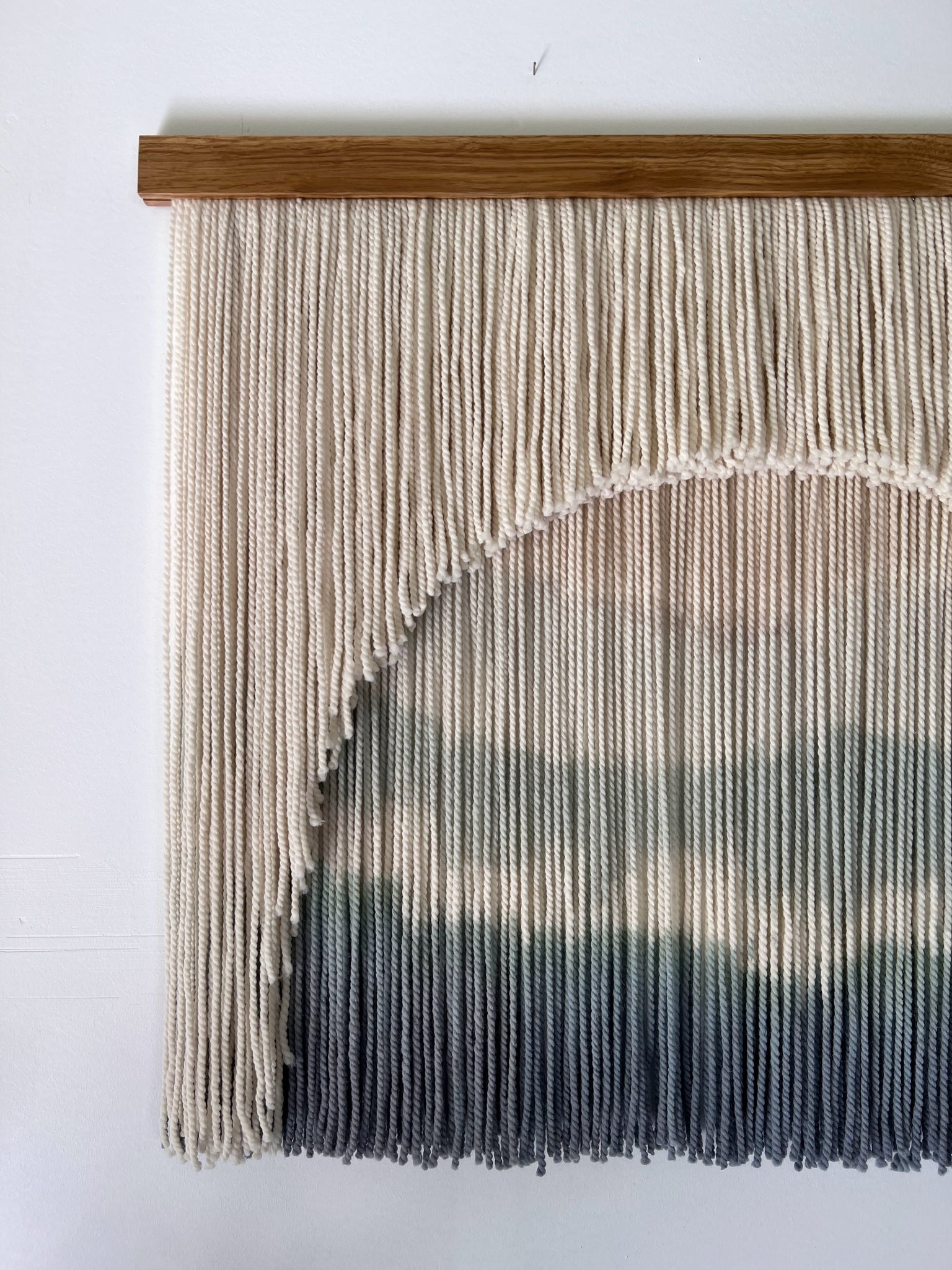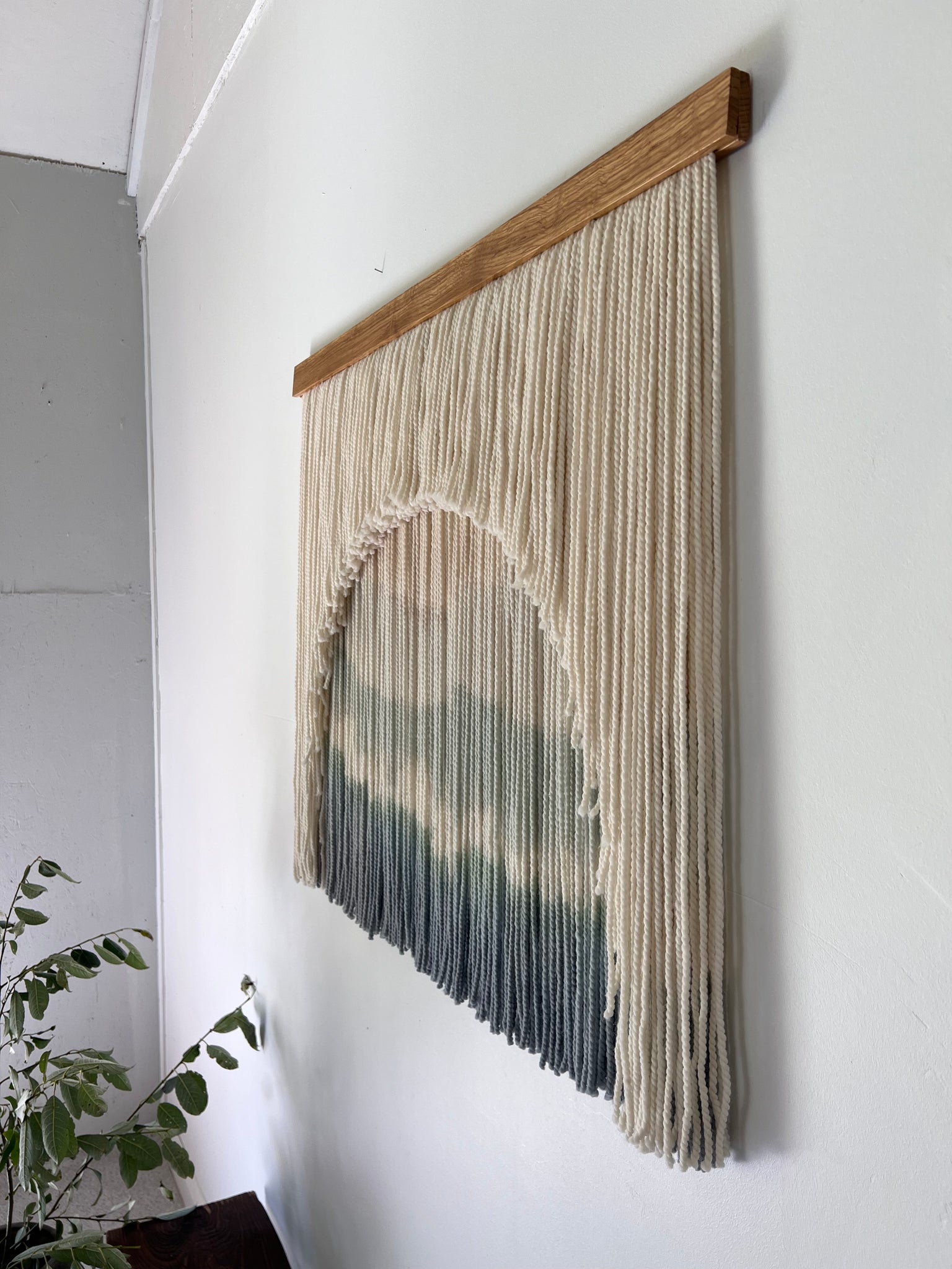 This minimal dip dyed wall hanging is made of natural color soft wool (ecru/off-white), in shades of beige and blue finished with an oak wood panel. Fiber art like this will suit perfectly a minimal living room, modern bedroom, and mid-century office.