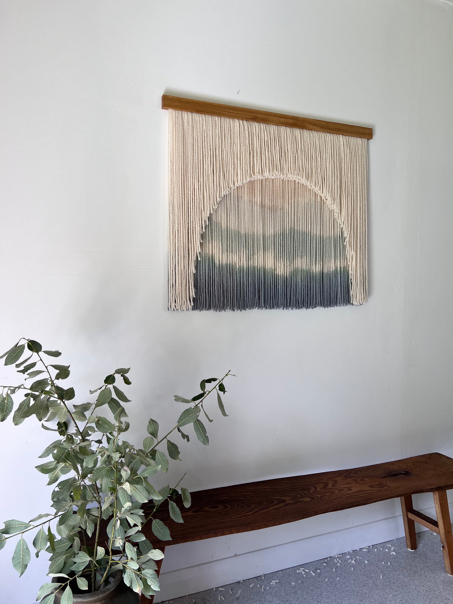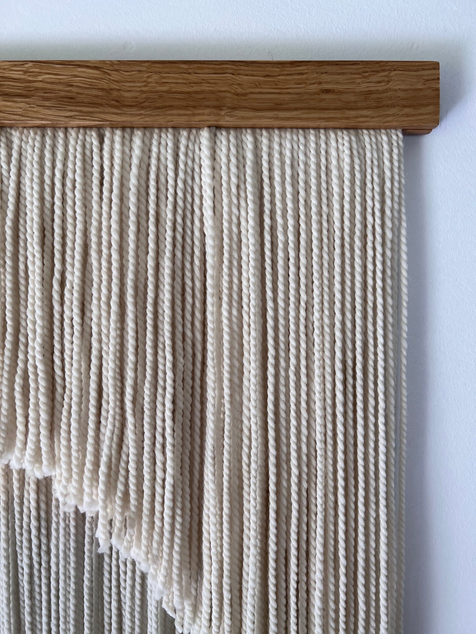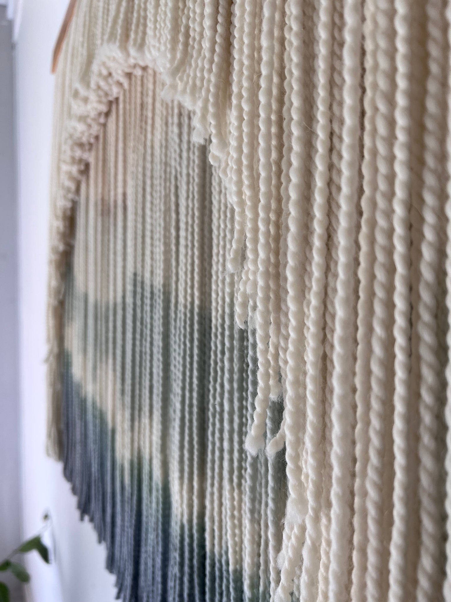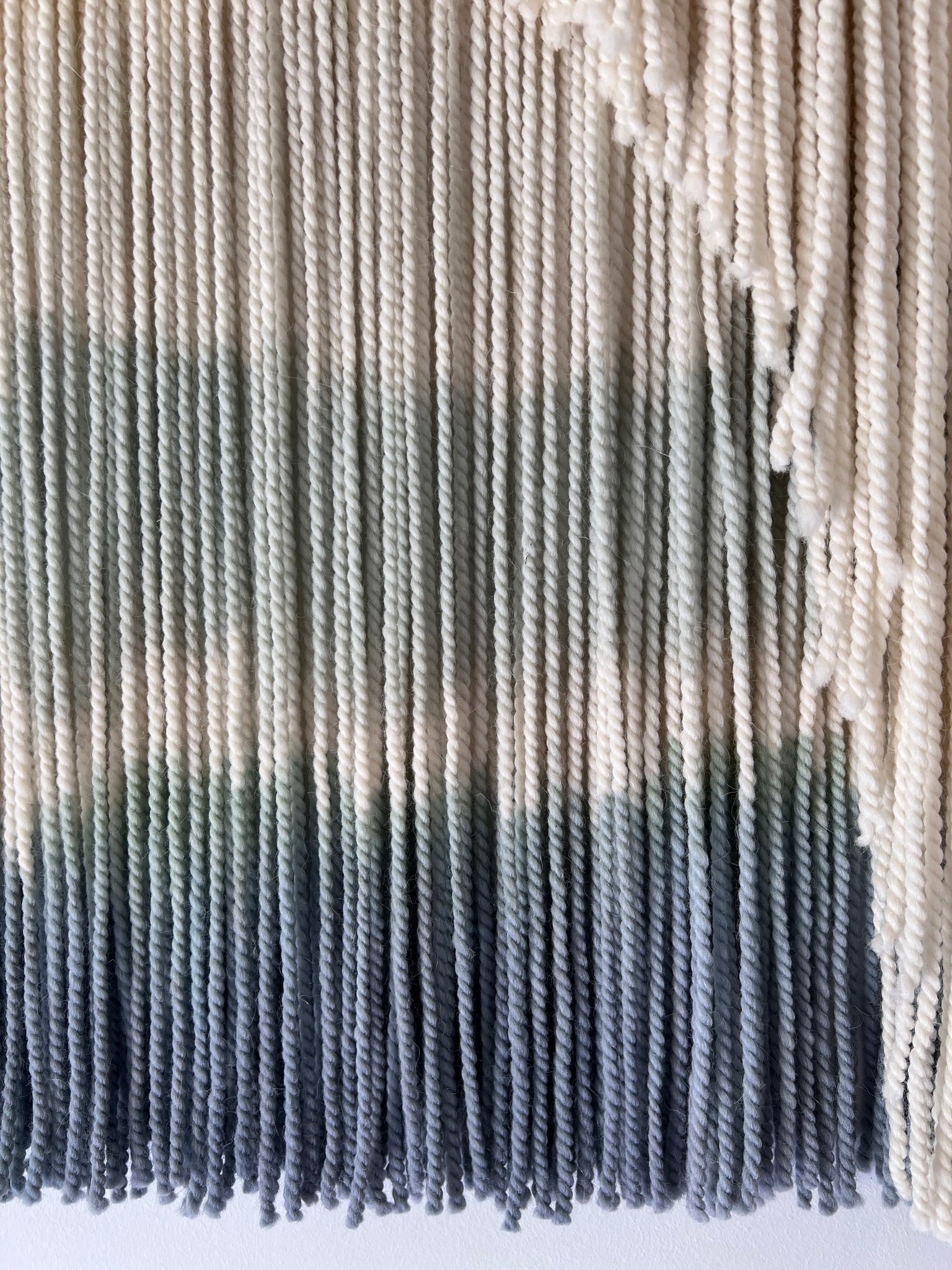 This minimal dip dyed wall hanging is made of natural color soft wool (ecru/off-white), in shades of beige and blue finished with an oak wood panel. Fiber art like this will suit perfectly a minimal living room, modern bedroom, and mid-century office.