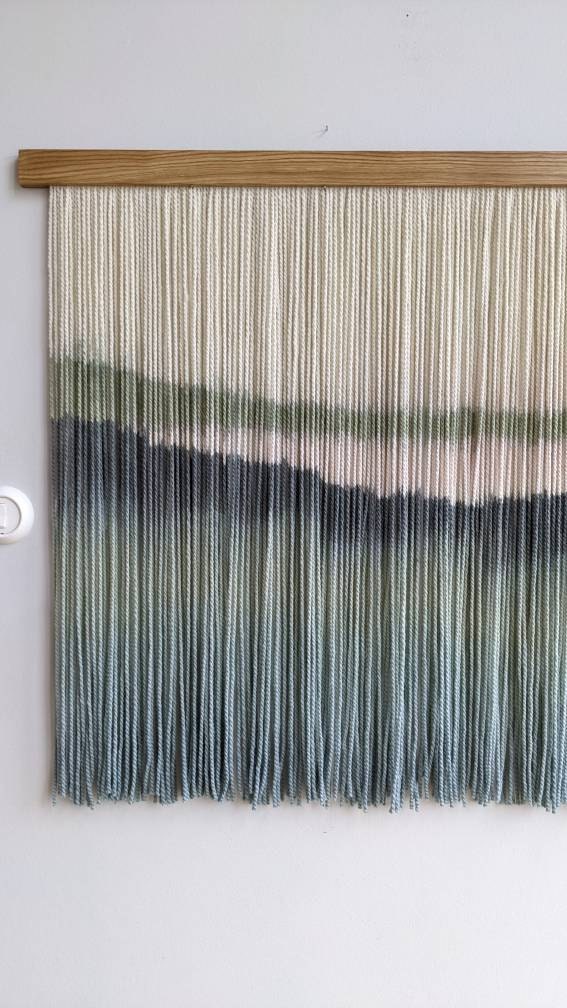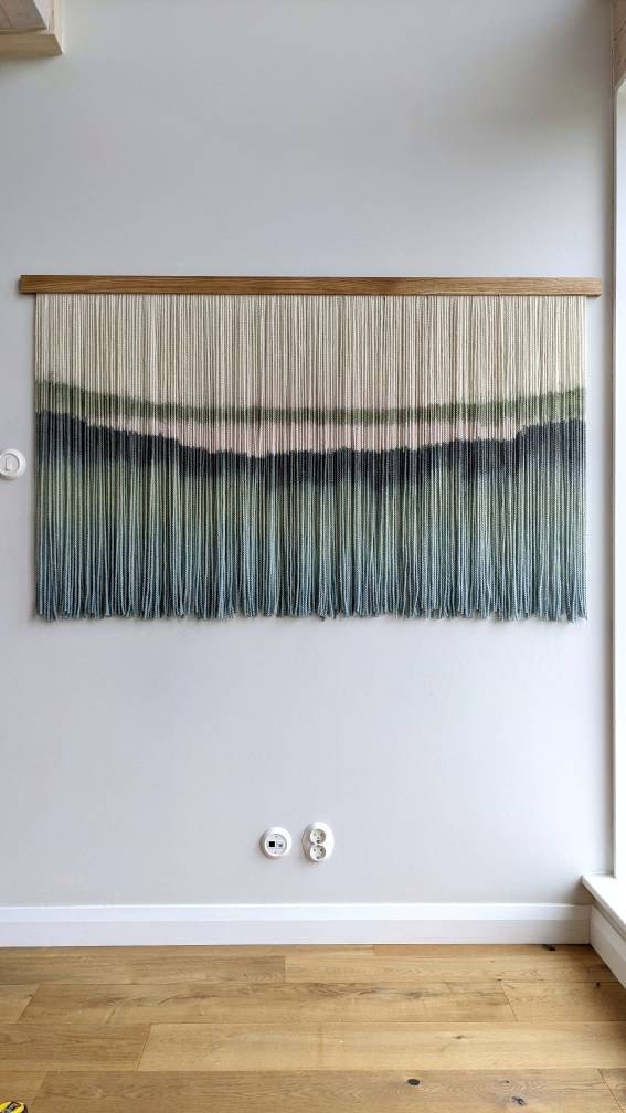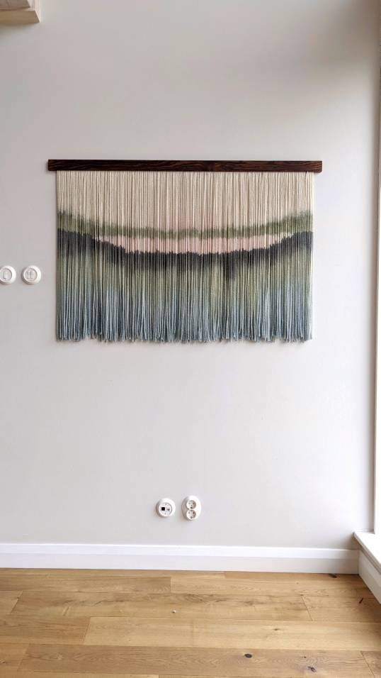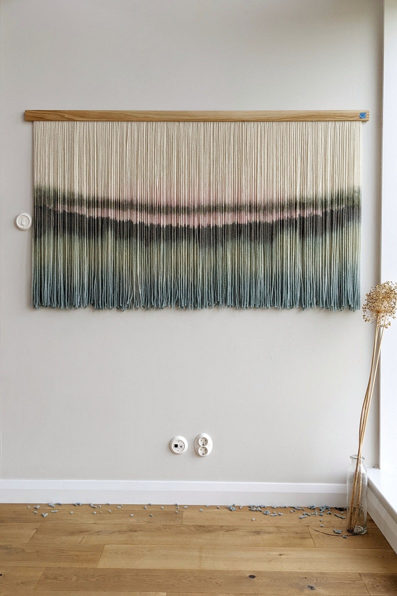 This dip dyed wall hanging is made of soft wool, in shades of pink, black, green, and blue, finished with an oak wood panel. Fiber art like this will suit perfectly a modern living room, bohemian bedroom, and mid-century office.