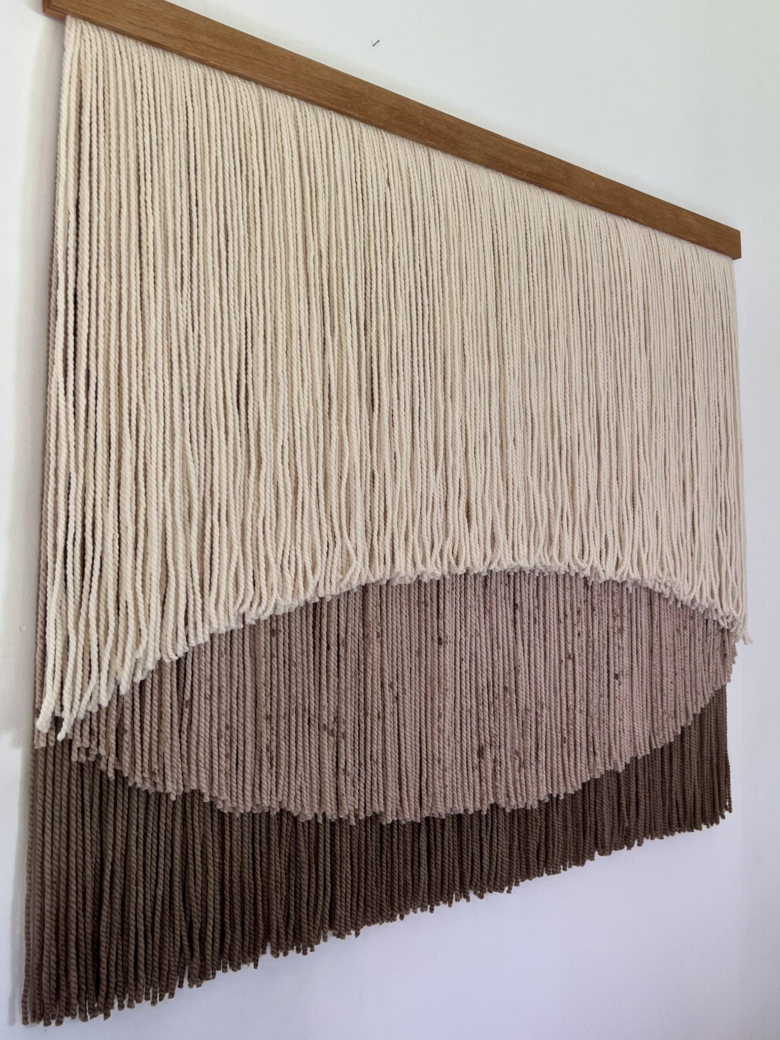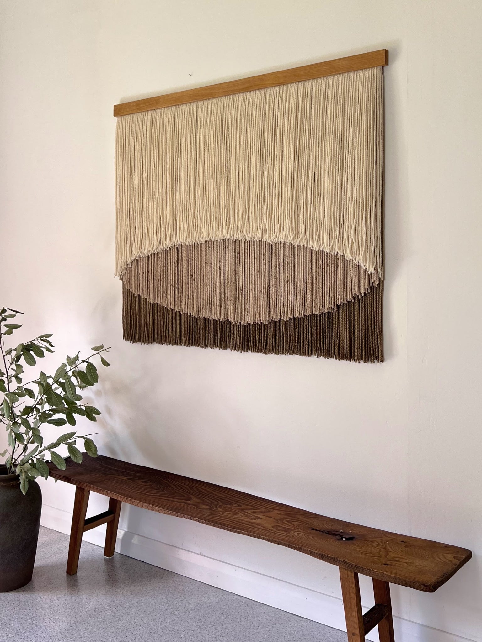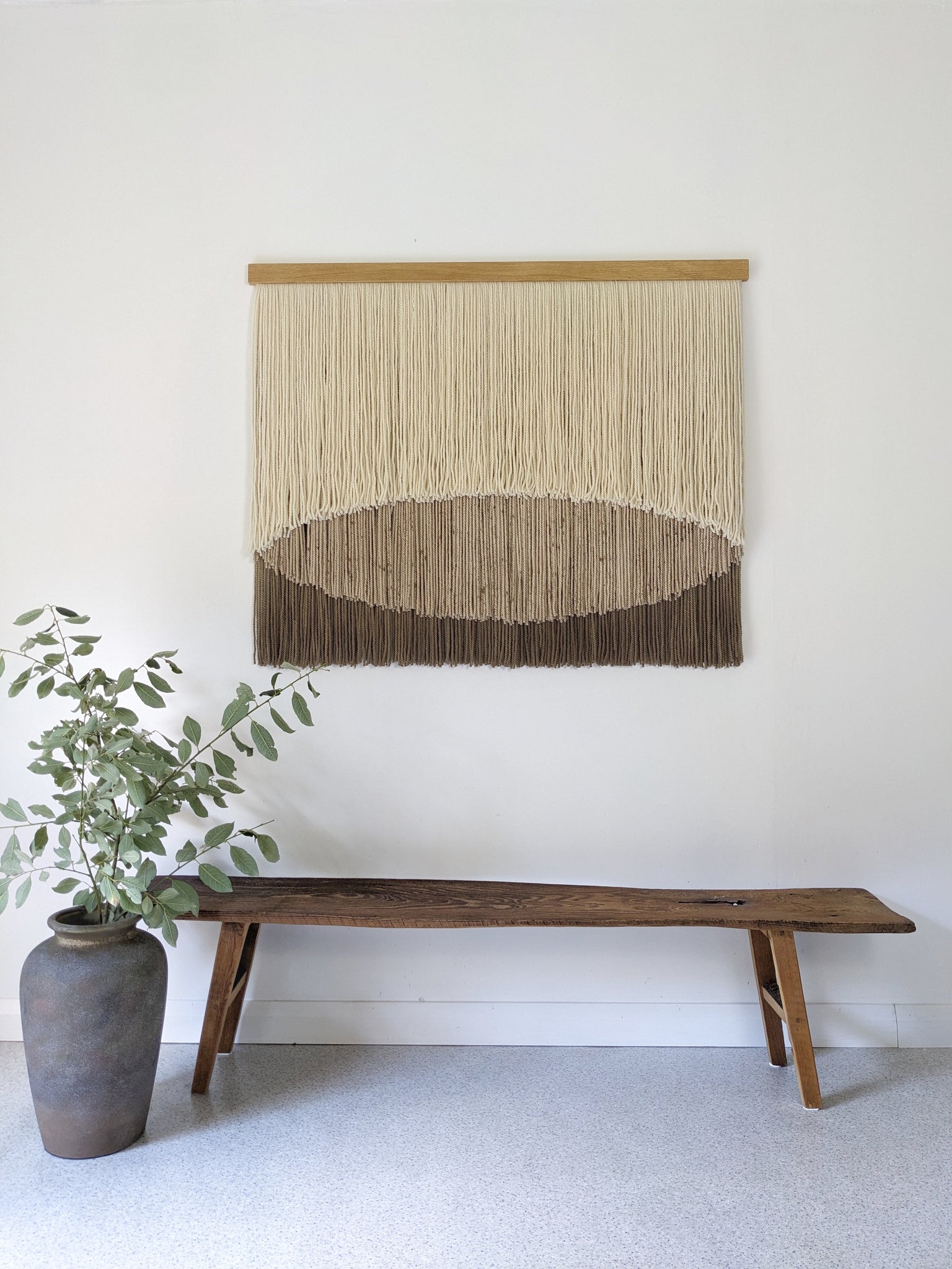 This minimal dip dyed wall hanging is made of natural color soft wool (ecru/off-white), in shades of beige and bronze/brown finished with an oak wood panel. Fiber art like this will suit perfectly a minimal living room, modern bedroom, and mid-century office.