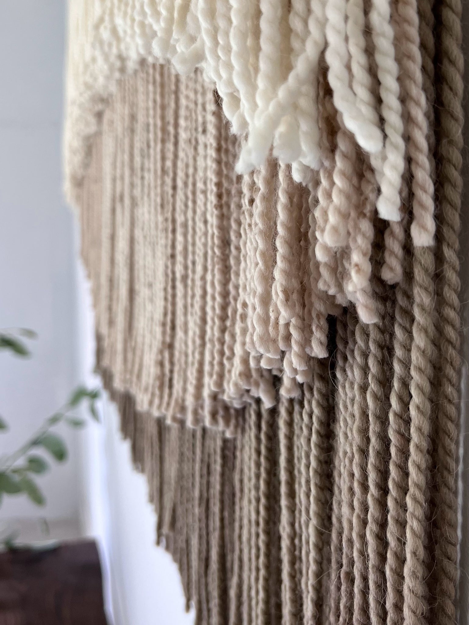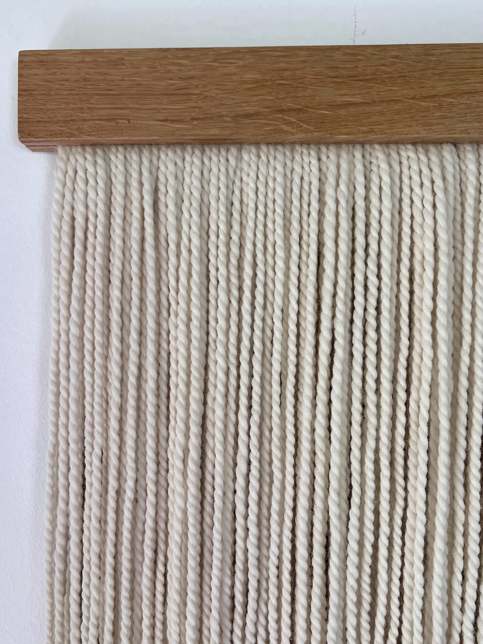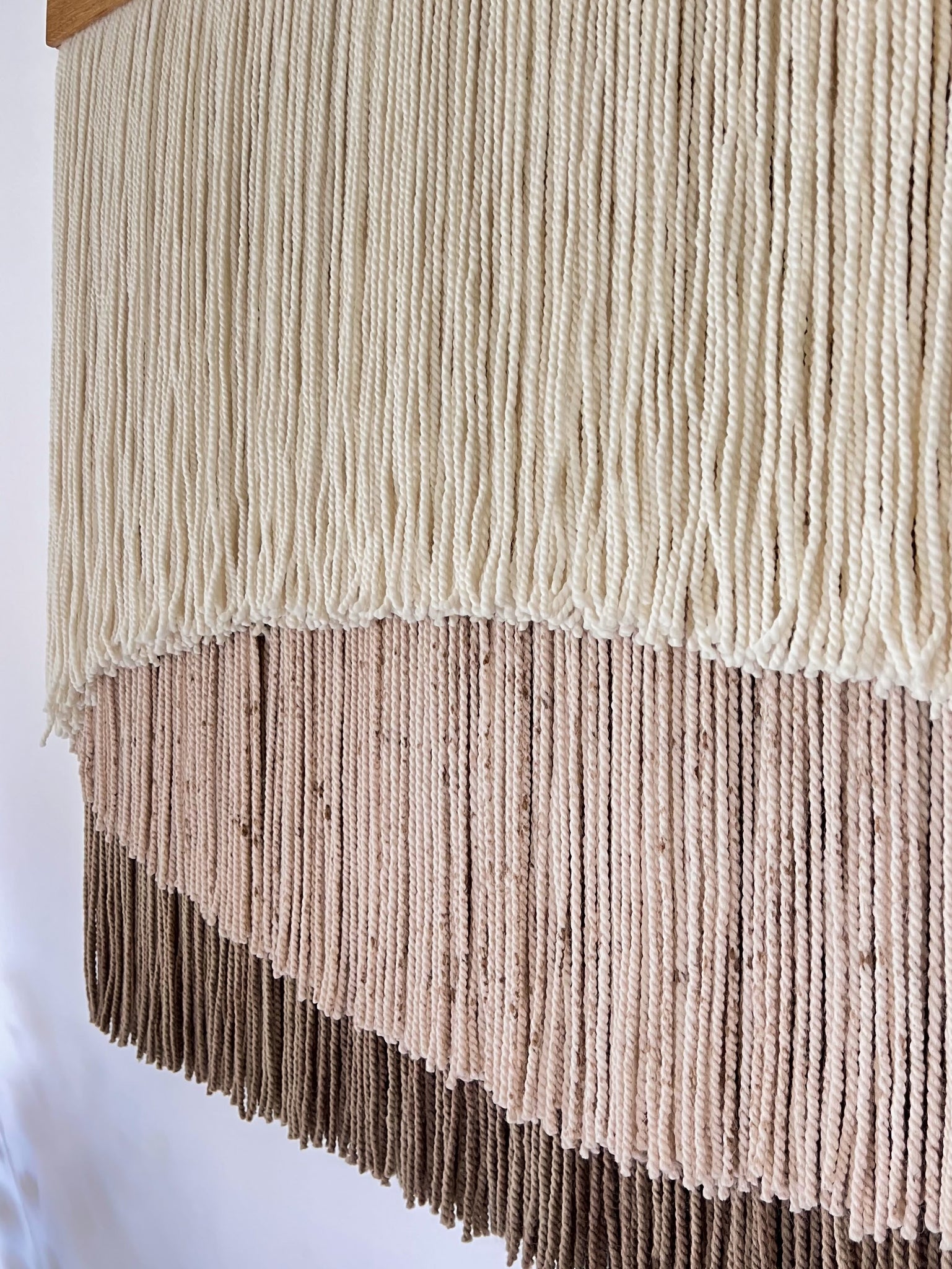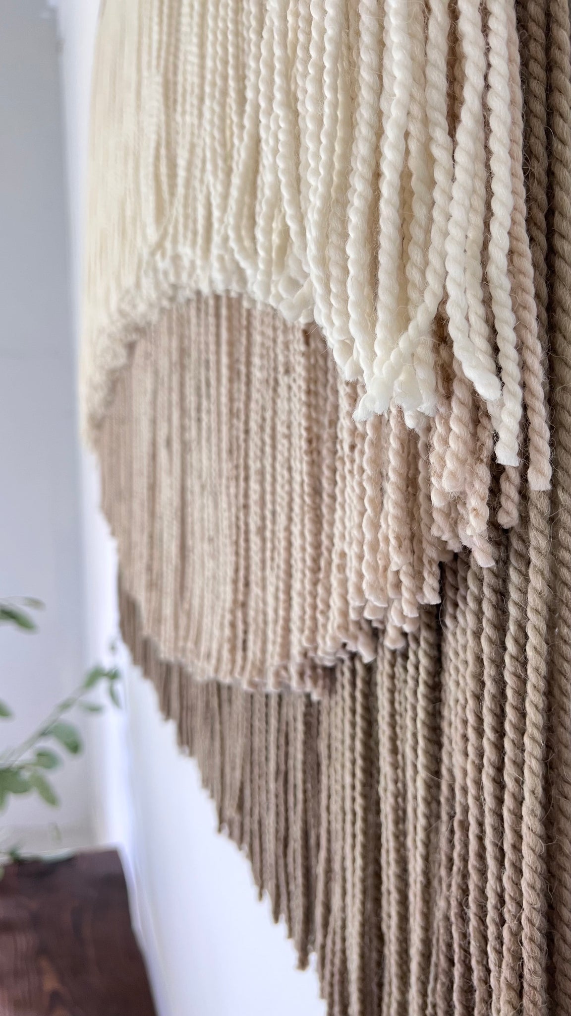 This minimal dip dyed wall hanging is made of natural color soft wool (ecru/off-white), in shades of beige and bronze/brown finished with an oak wood panel. Fiber art like this will suit perfectly a minimal living room, modern bedroom, and mid-century office.