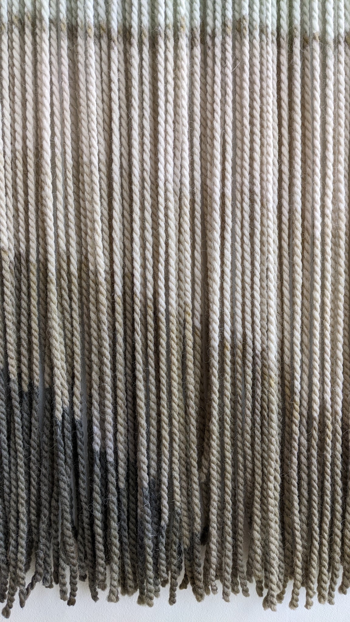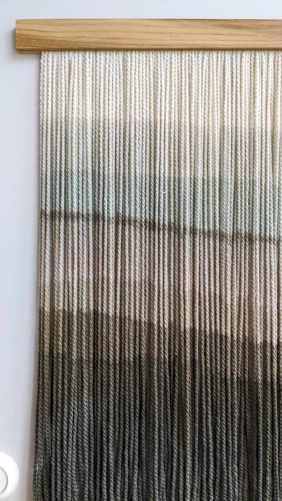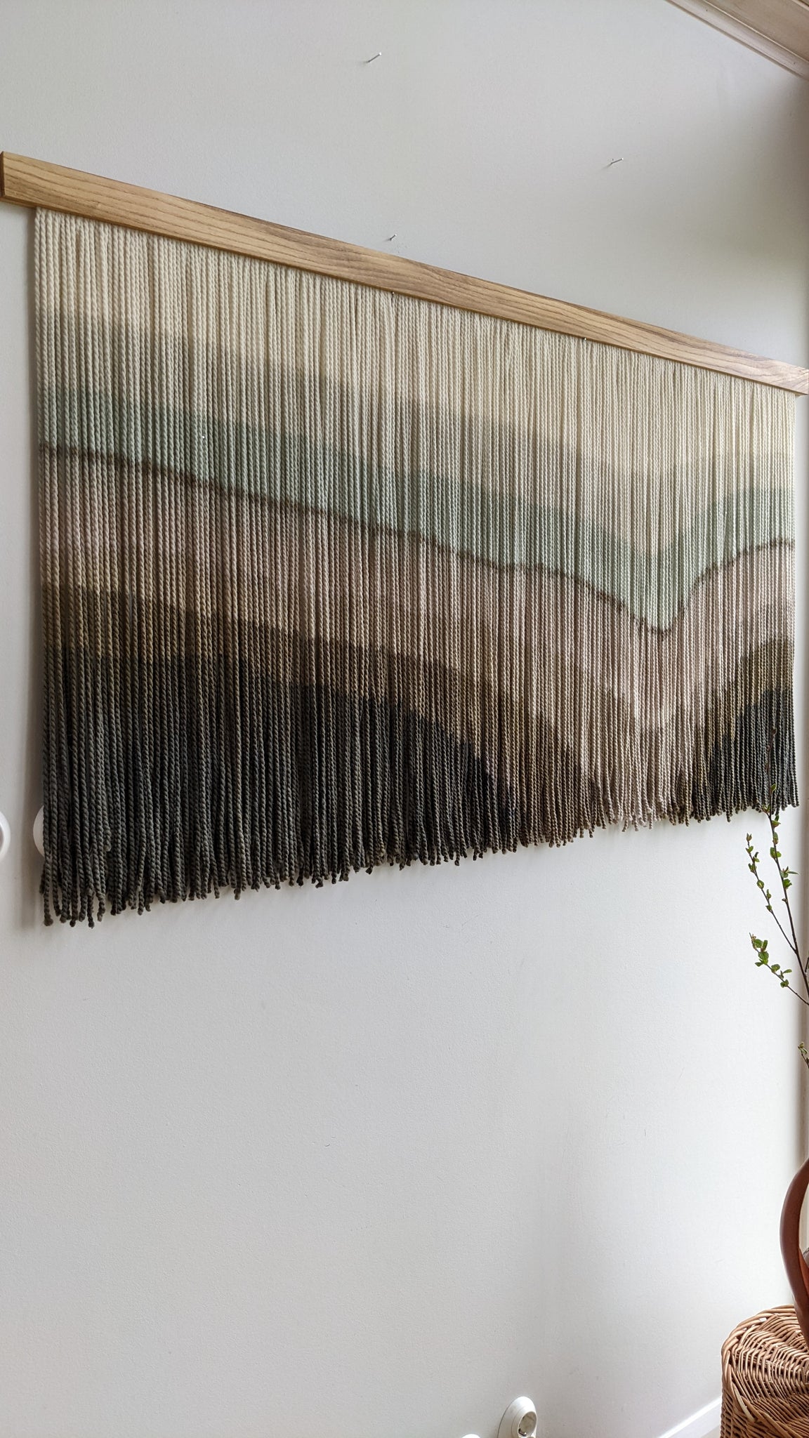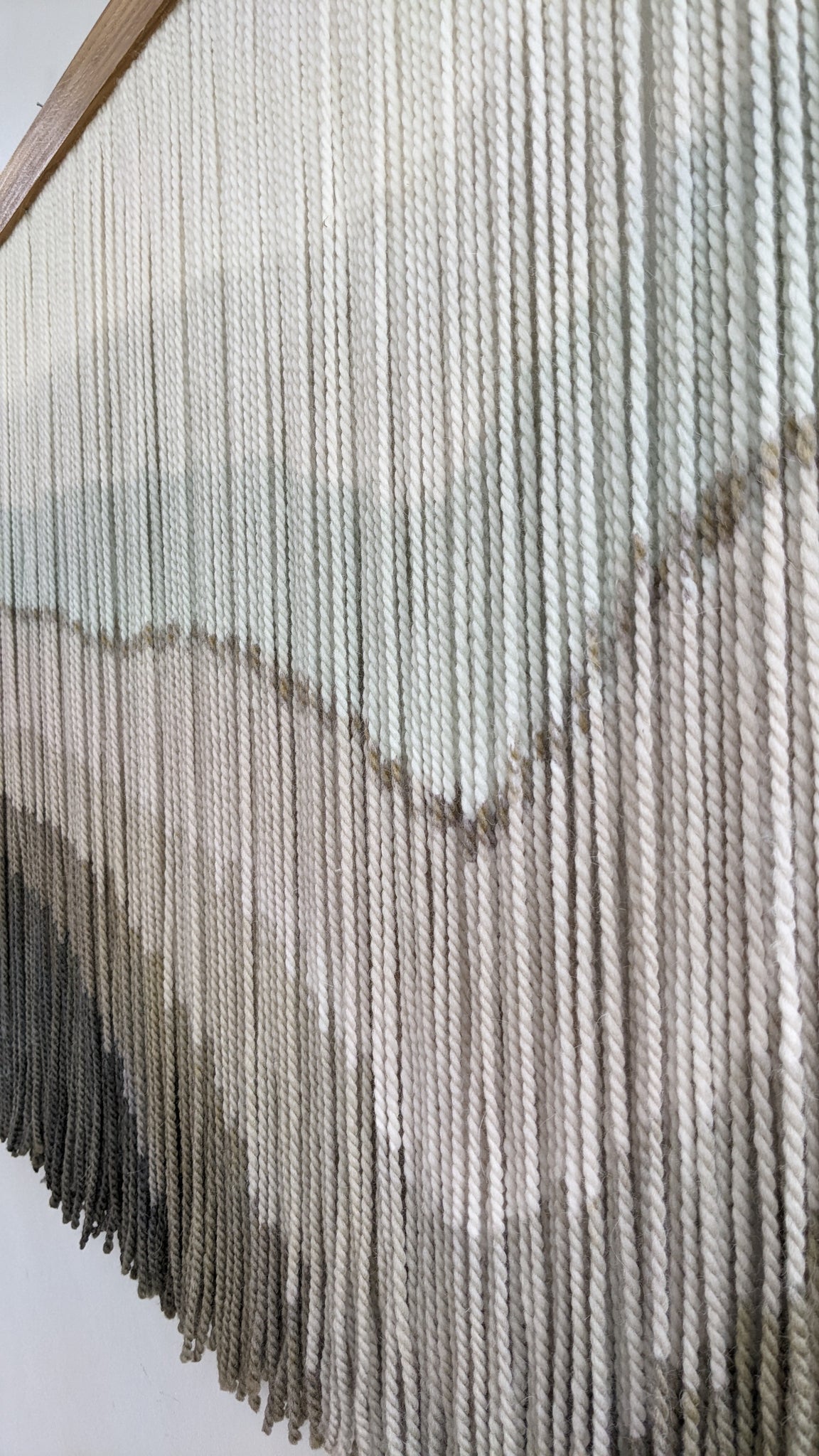 This large dip dye wall hanging is made of soft wool, in shades of gray, mint, bronze, brown and charcoal finished with an oak wood panel. Fiber art like this will suit perfectly a minimal living room, modern bedroom, and mid-century office.