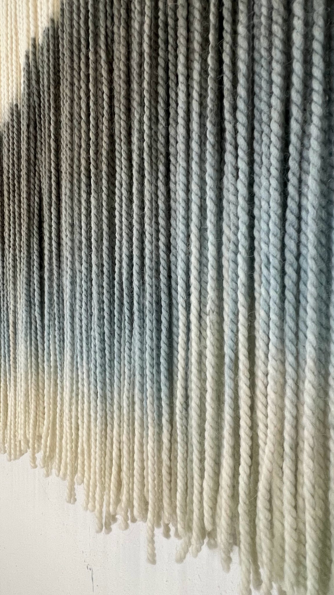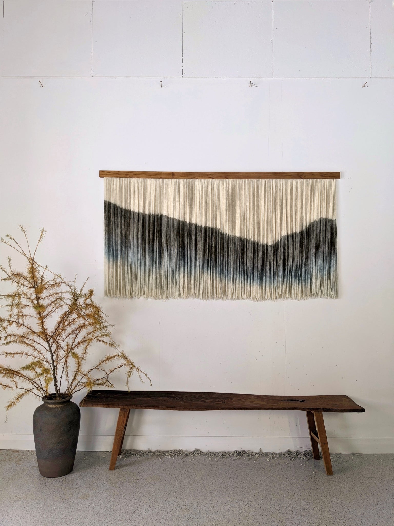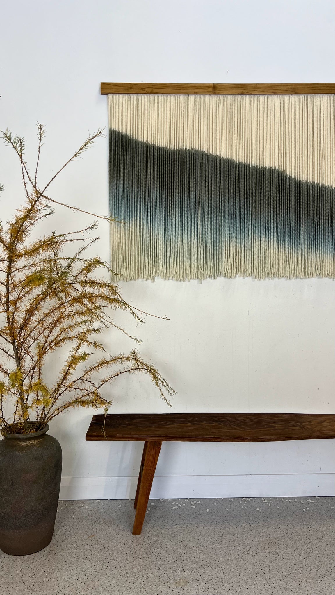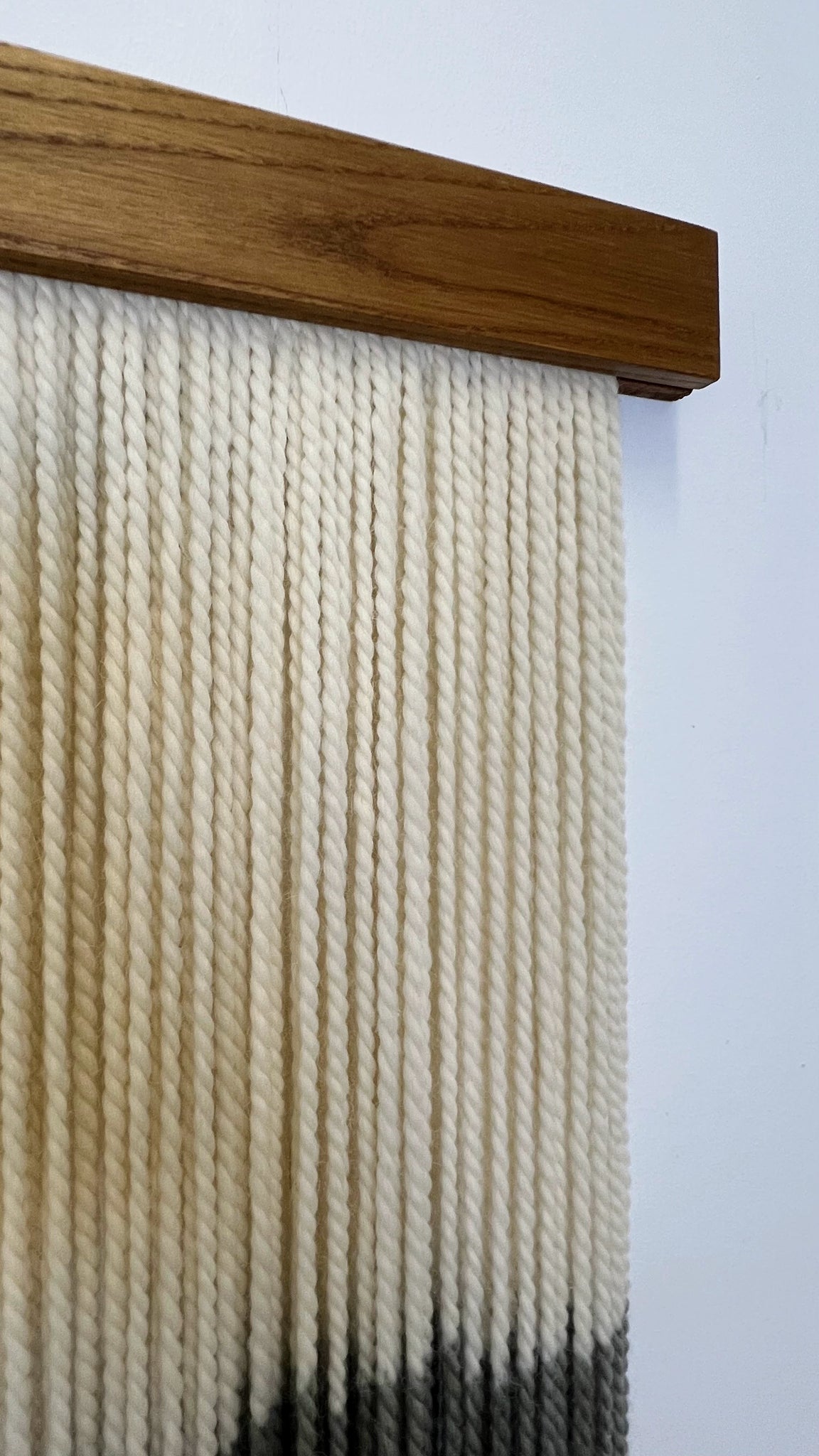This dip dyed wall hanging is made of natural color soft wool, in shades of charcoal, graphite and blue finished with an oak wood panel. Fiber art like this will suit perfectly a minimalist living room, bohemian bedroom and warm office.