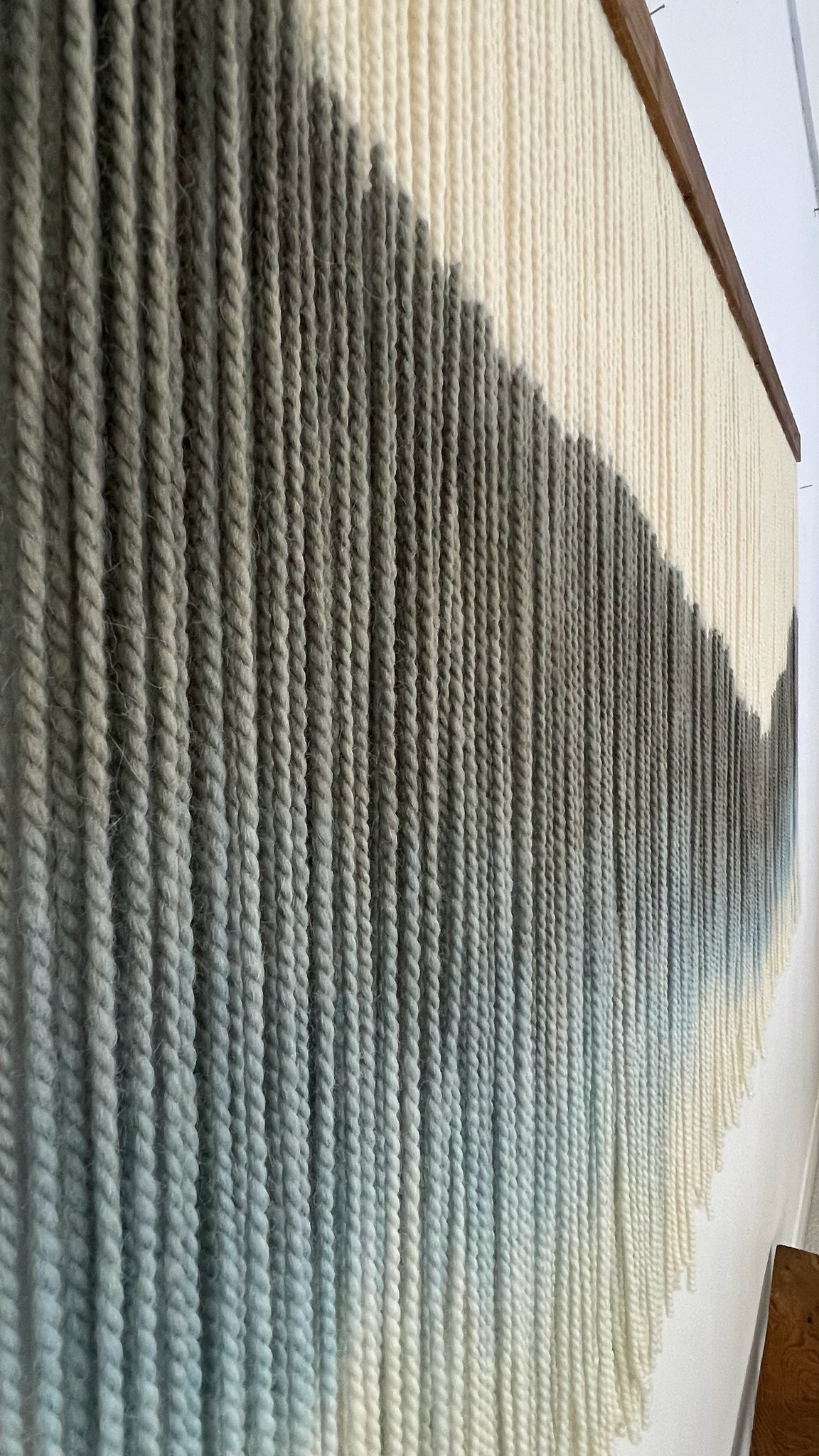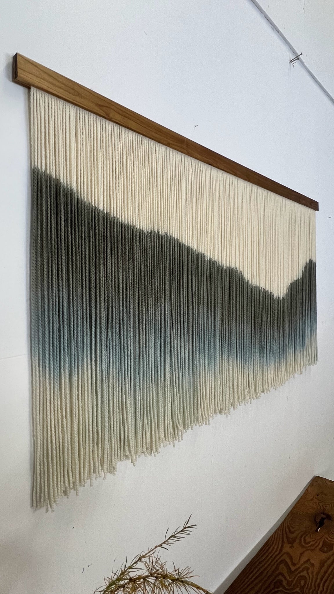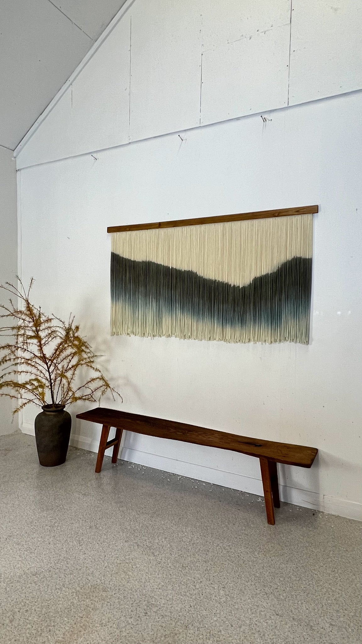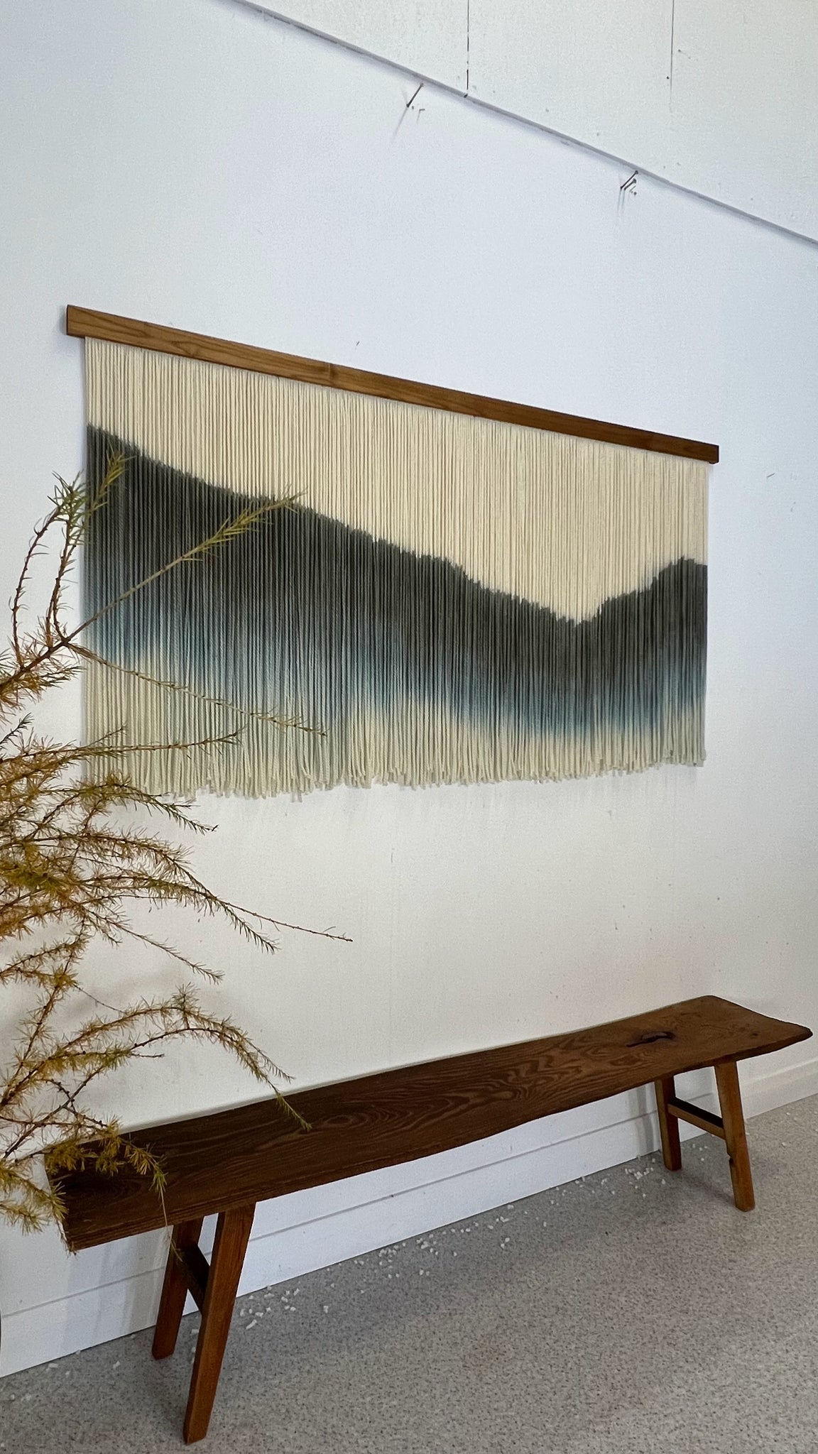 This dip dyed wall hanging is made of natural color soft wool, in shades of charcoal, graphite and blue finished with an oak wood panel. Fiber art like this will suit perfectly a minimalist living room, bohemian bedroom and warm office.
