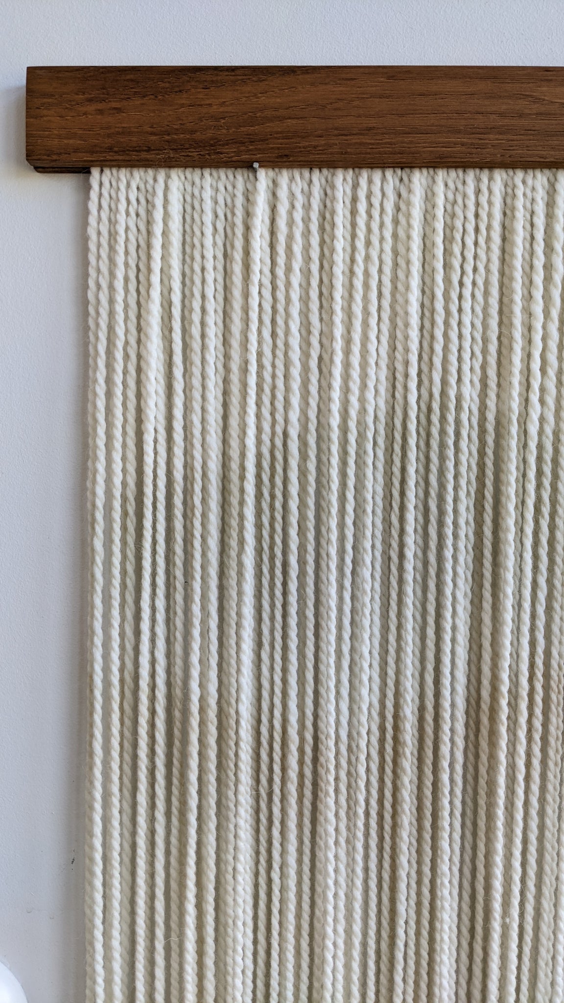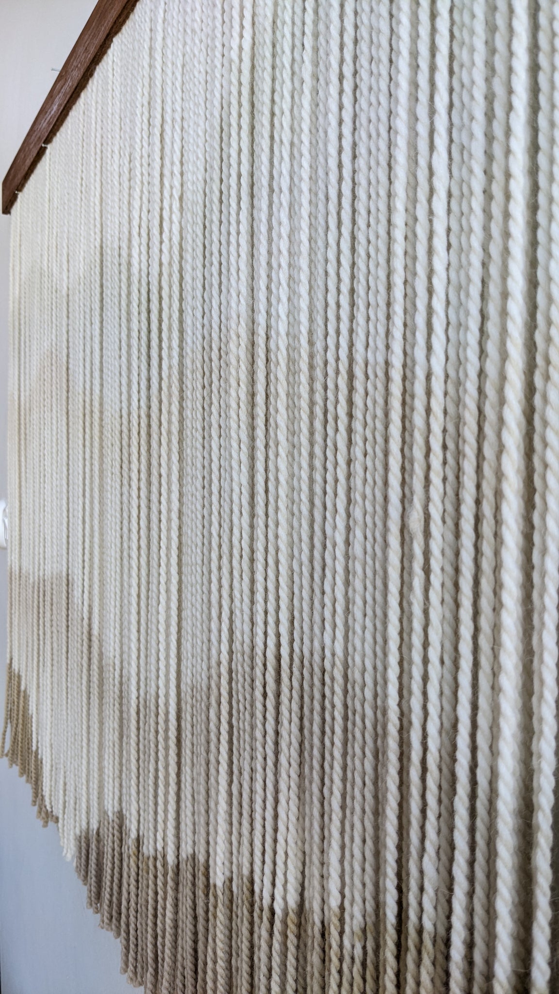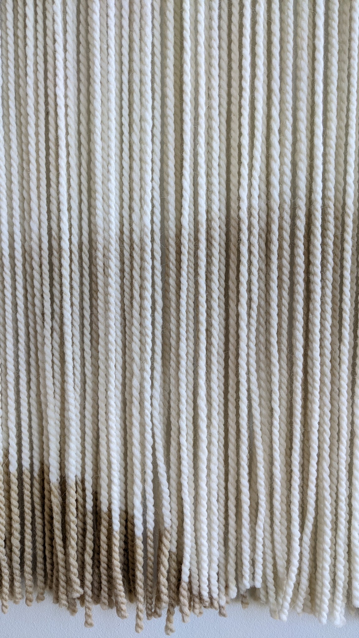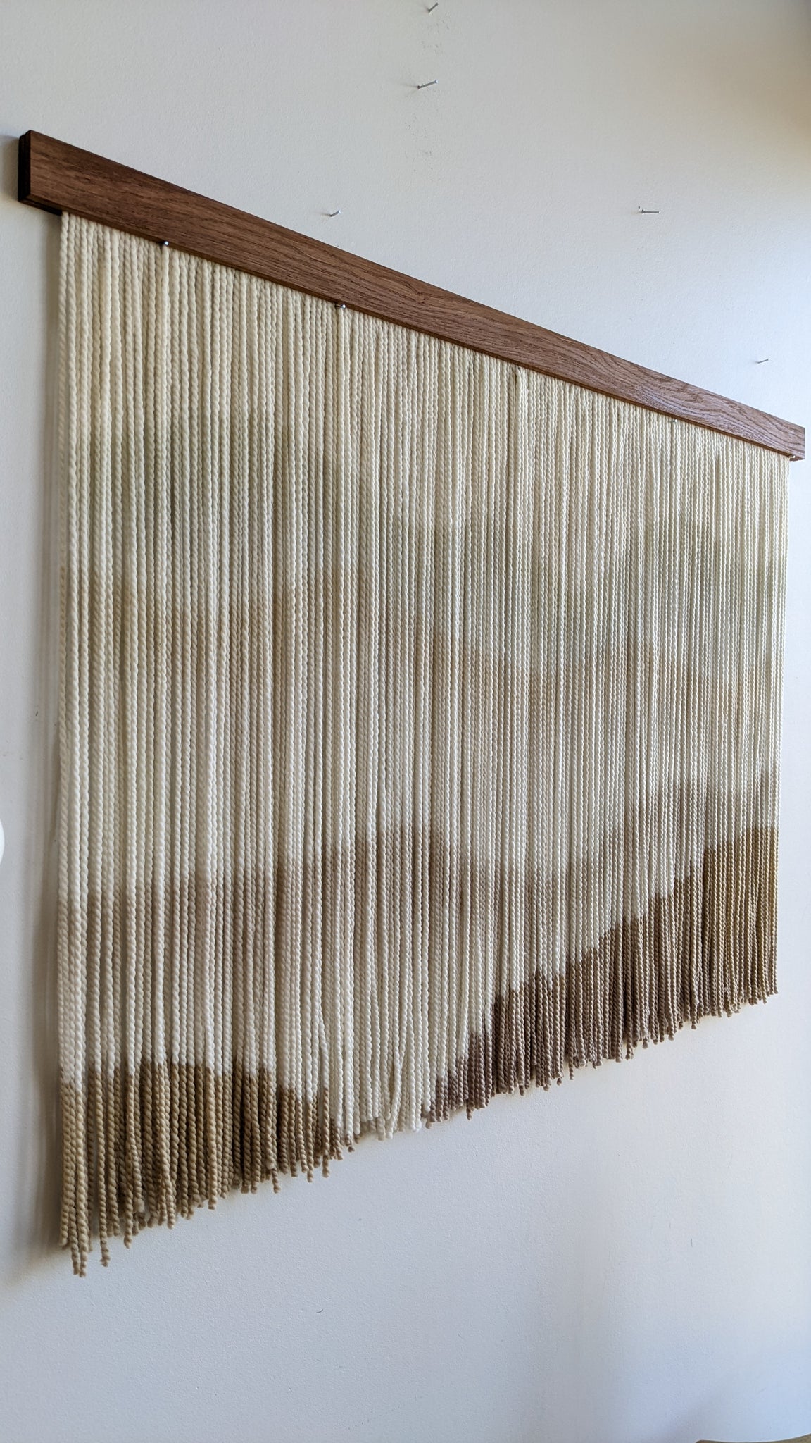 This large dip dyed wall hanging is made of soft wool, in shades of gray, sand, beige, and bronze, finished with a stained oak wood panel. Fiber art like this will suit perfectly a modern living room, bohemian bedroom, and contemporary office.