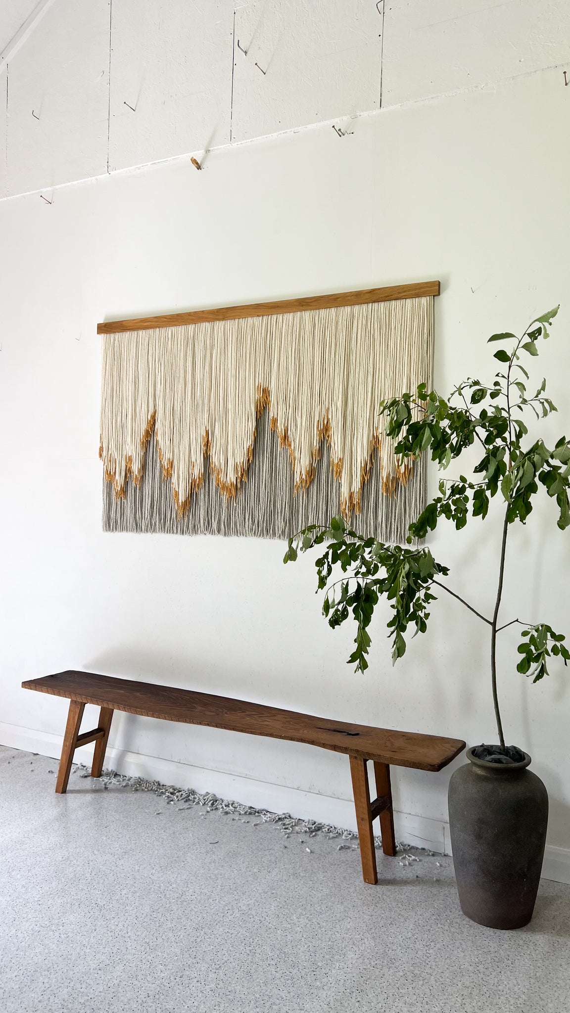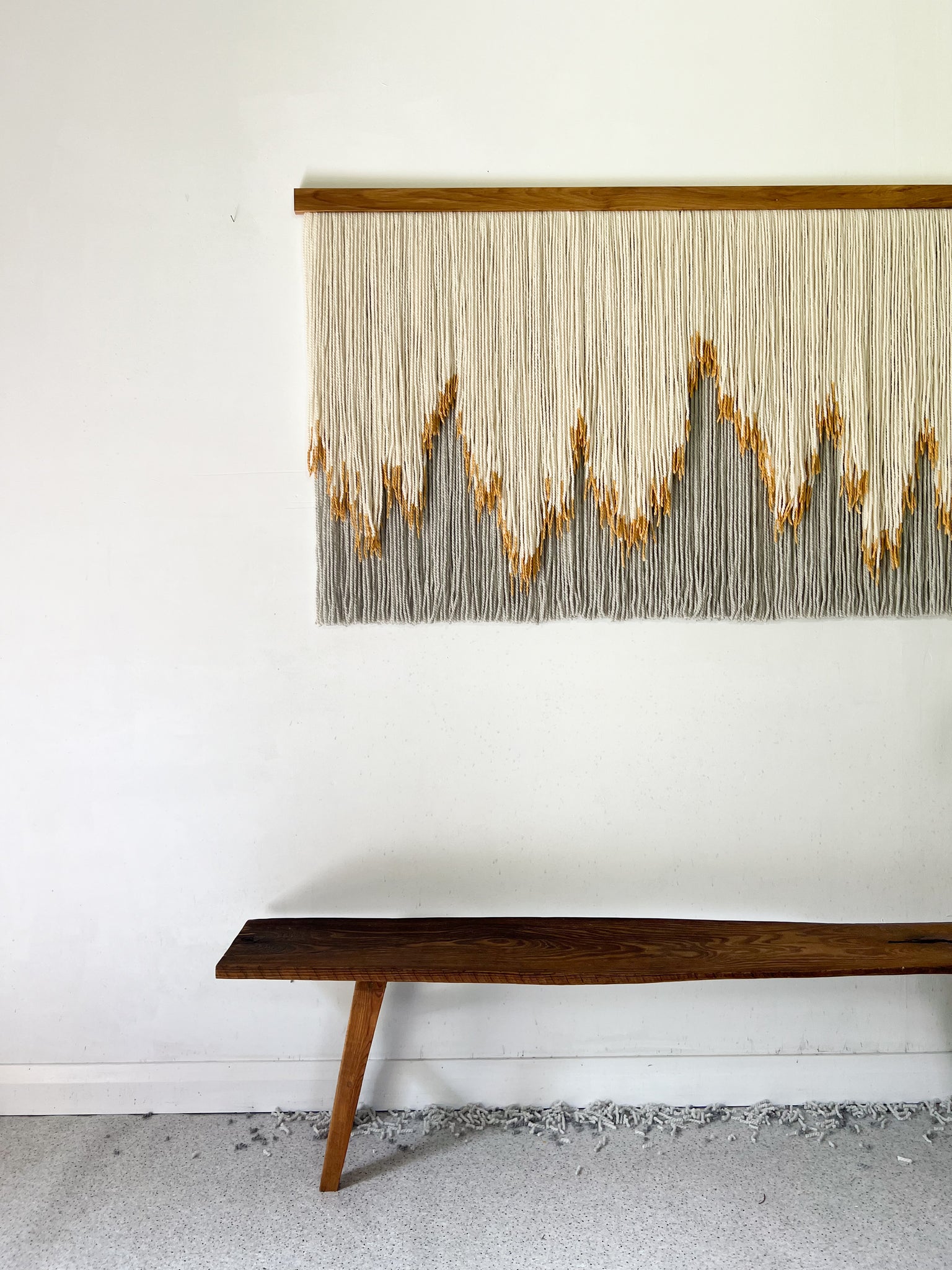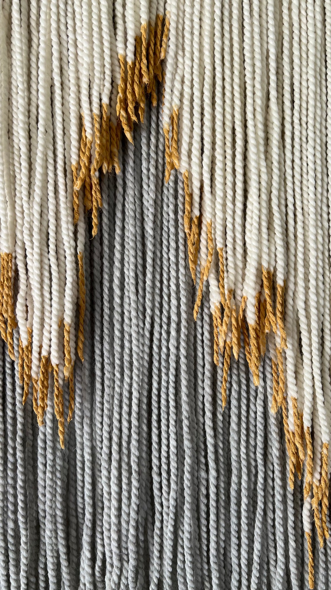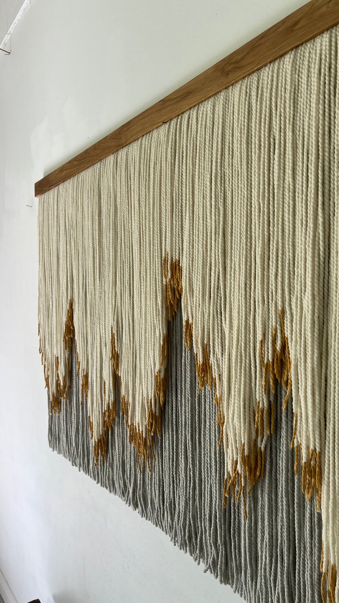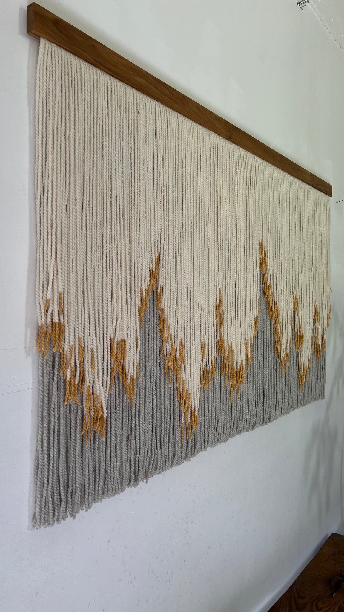 This wall hanging is made of natural color soft wool and shades of gray with the addition of gold acrylic paint finished with an oak wood panel. Fiber art like this will suit perfectly a minimalist living room, bohemian bedroom and warm office.