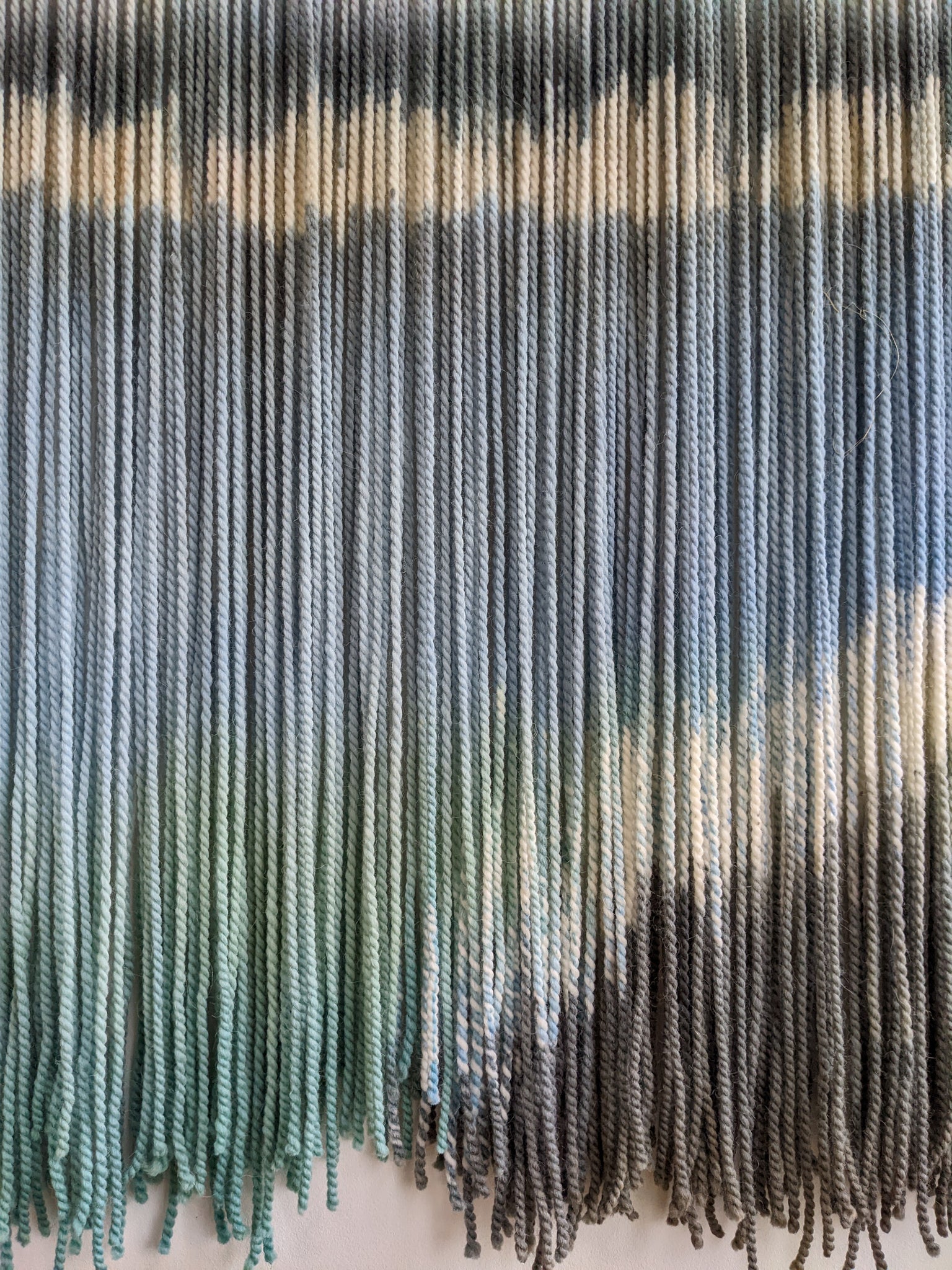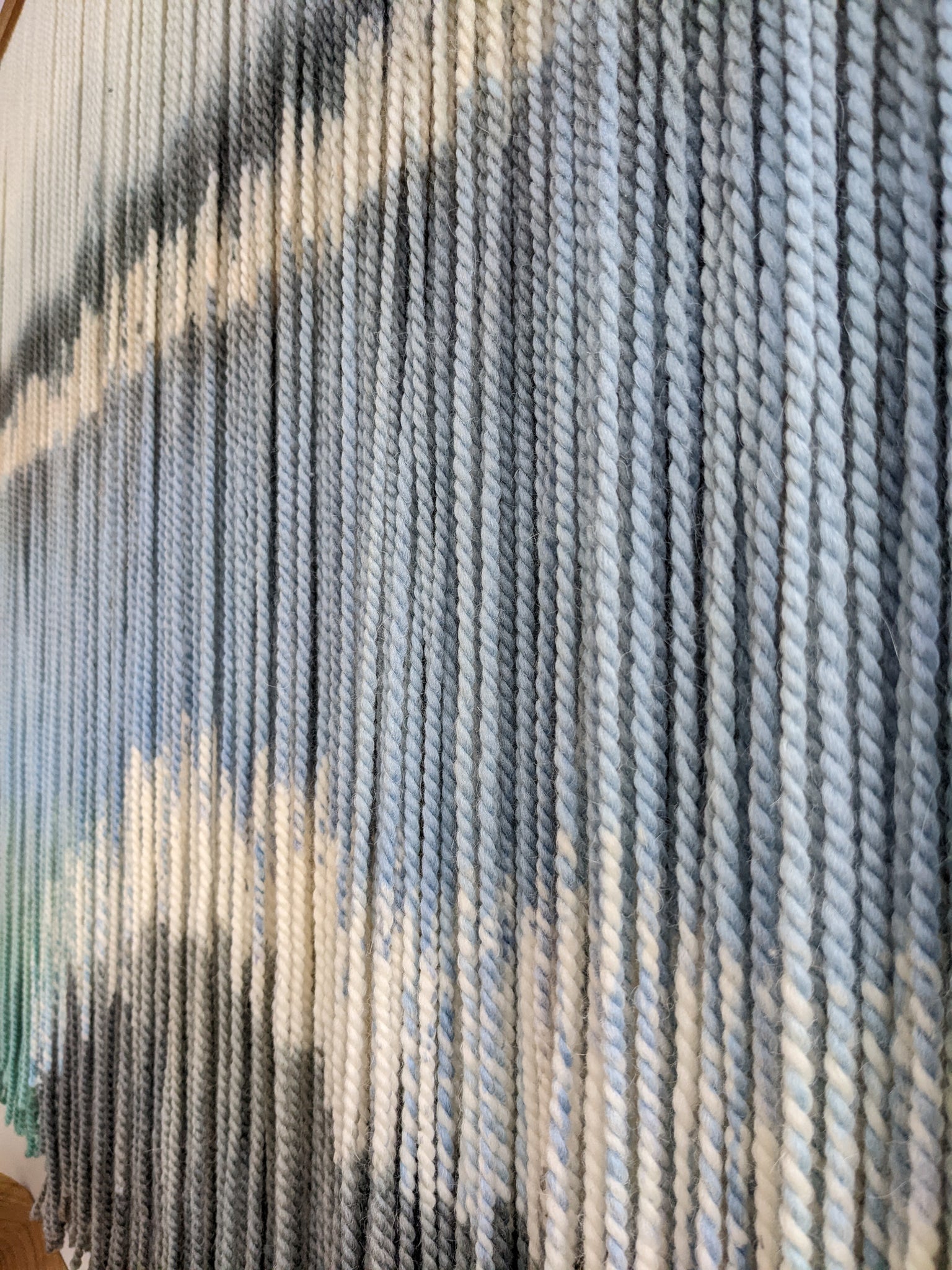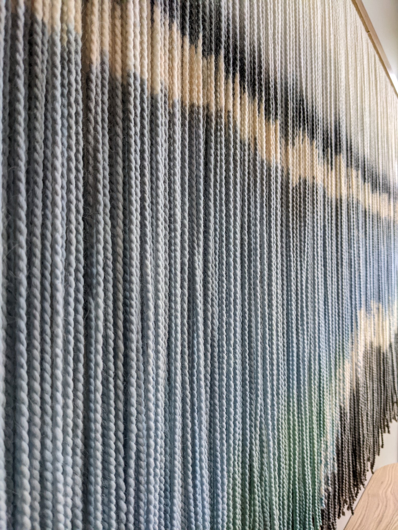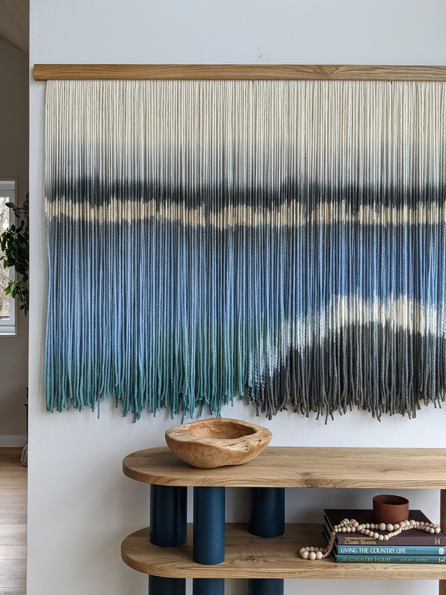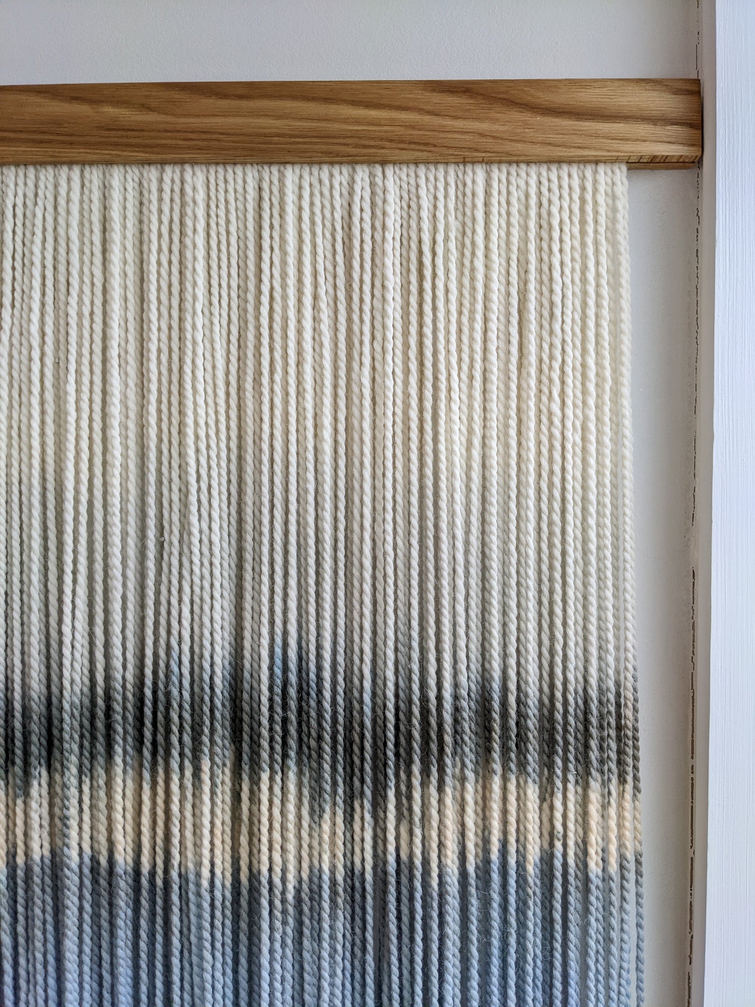 This large dip dye wall hanging is made of soft wool, in shades of natural color wool (ecru/off white), gray, soft black/chorcoal, blue and green finished with oak wood panel. Fiber art like this will suit perfectly a minimal living room, modern bedroom, and mid-century office.