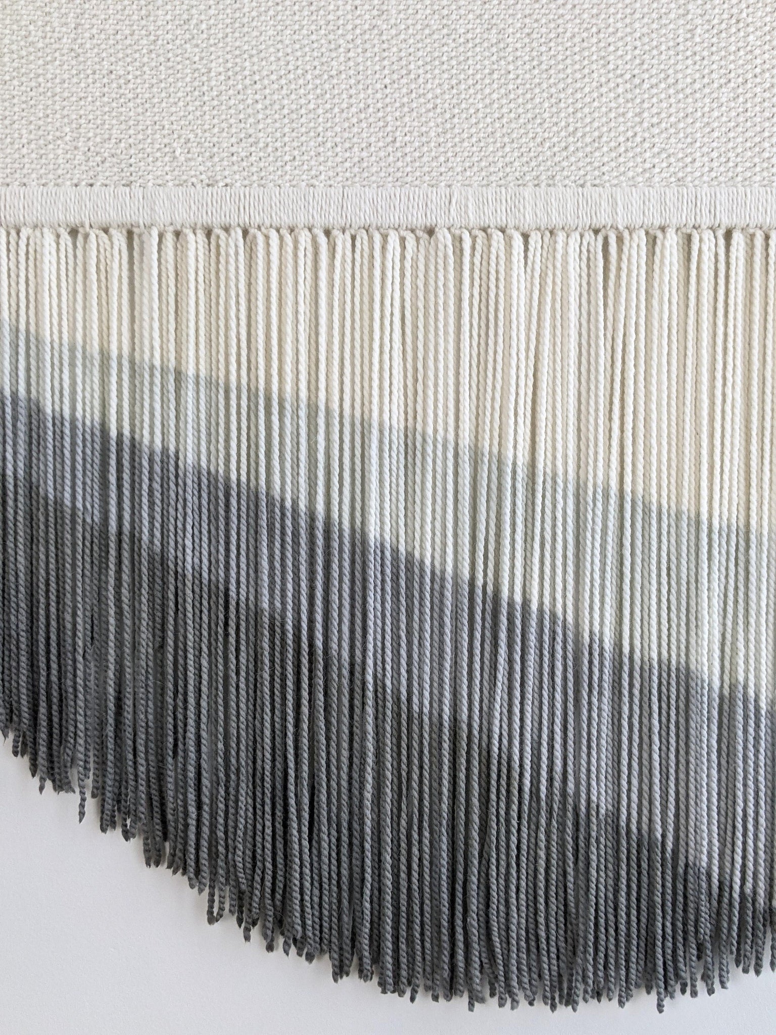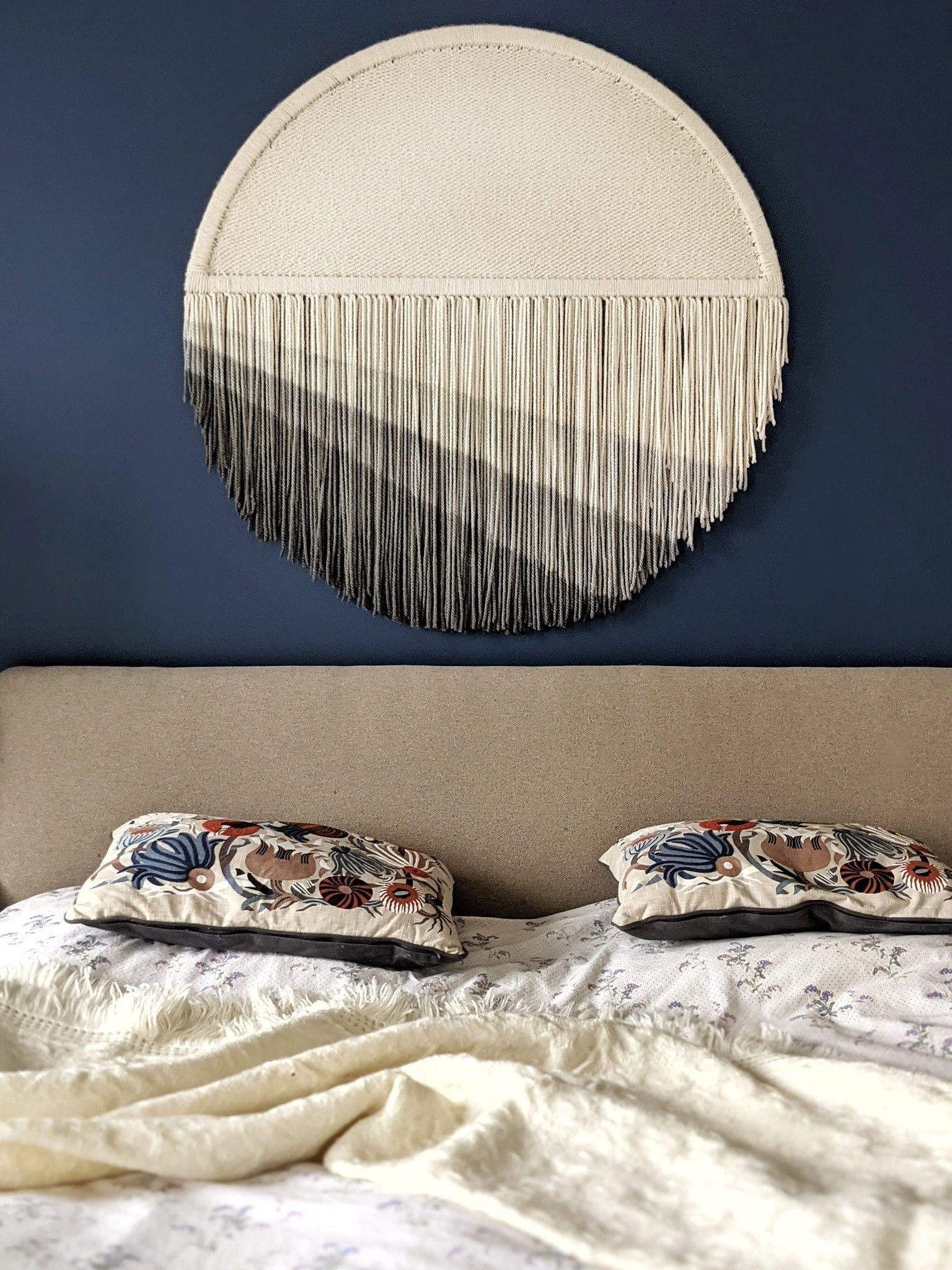 This xl dip dye round wall hanging is made of soft natural color wool, in shades of gray.Fiber art like this will suit perfectly a minimal living room, bohemian bedroom, and modern office.
