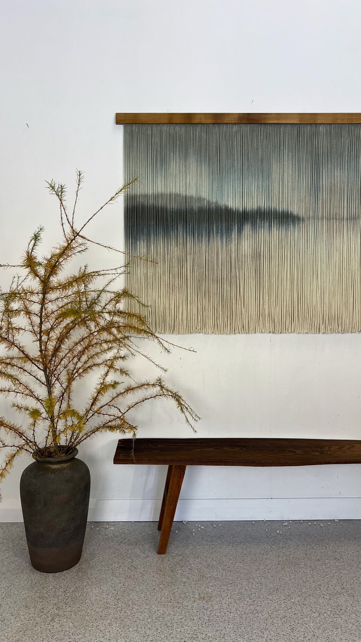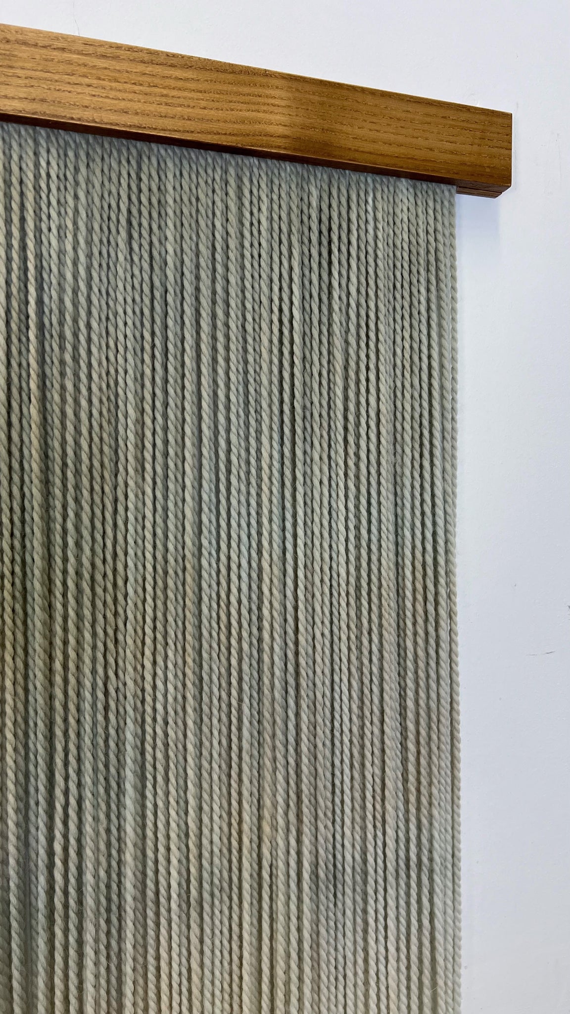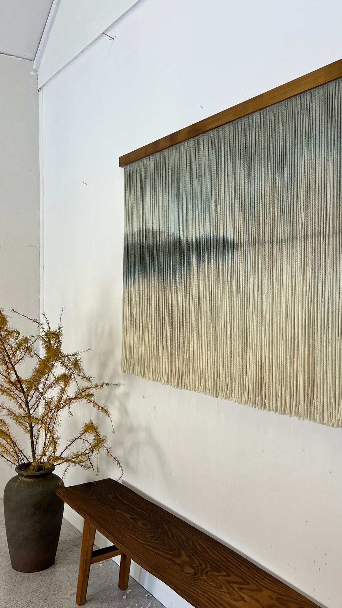 This dip dyed wall hanging is made of natural color soft wool, in shades of gray, charcoal, beige and blue finished with a stained oak wood panel. Fiber art like this will suit perfectly a minimalist living room, bohemian bedroom and warm office.