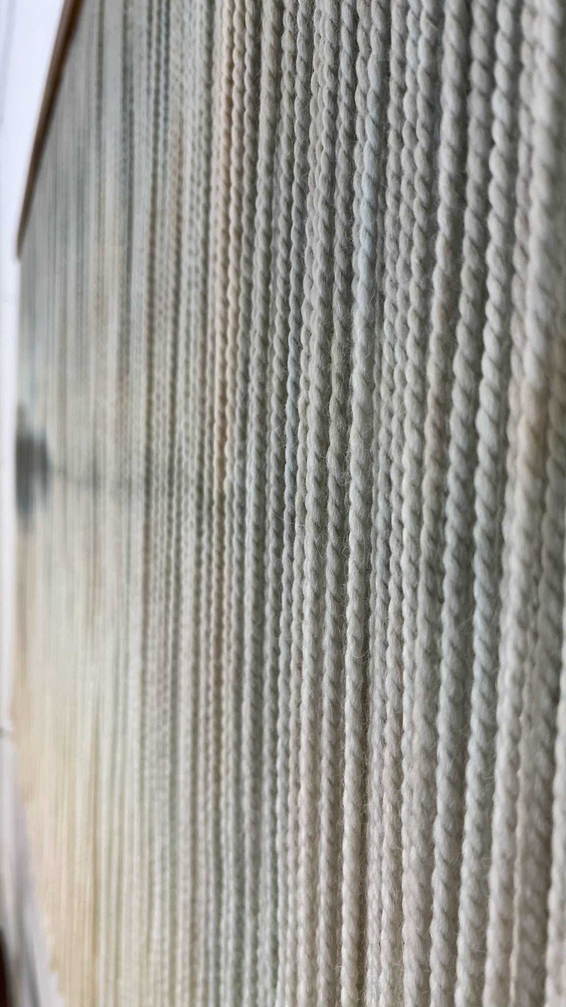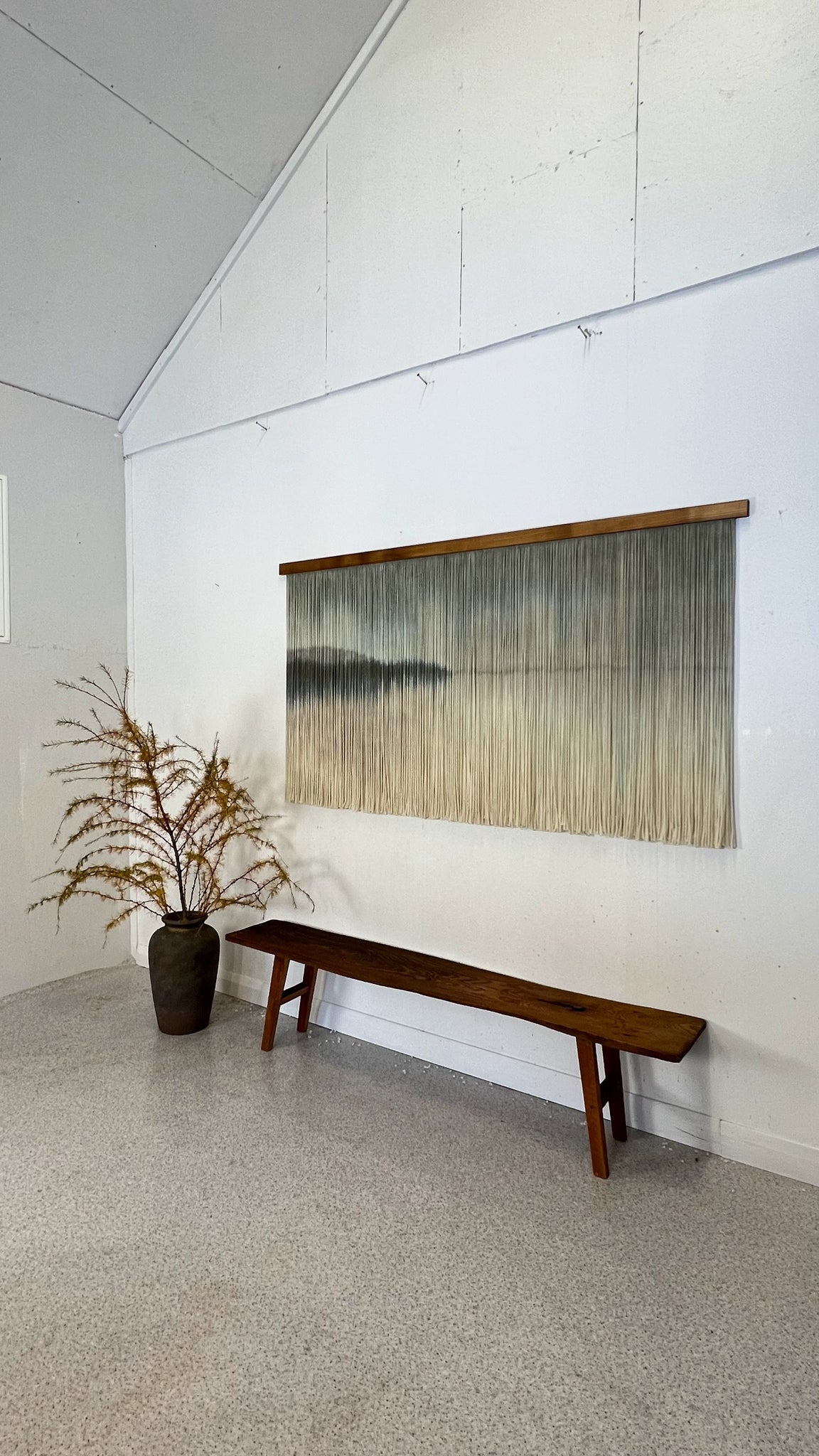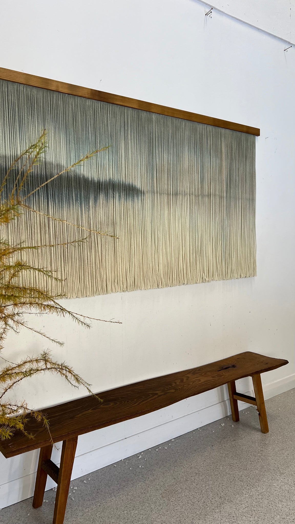 This dip dyed wall hanging is made of natural color soft wool, in shades of gray, charcoal, beige and blue finished with a stained oak wood panel. Fiber art like this will suit perfectly a minimalist living room, bohemian bedroom and warm office.