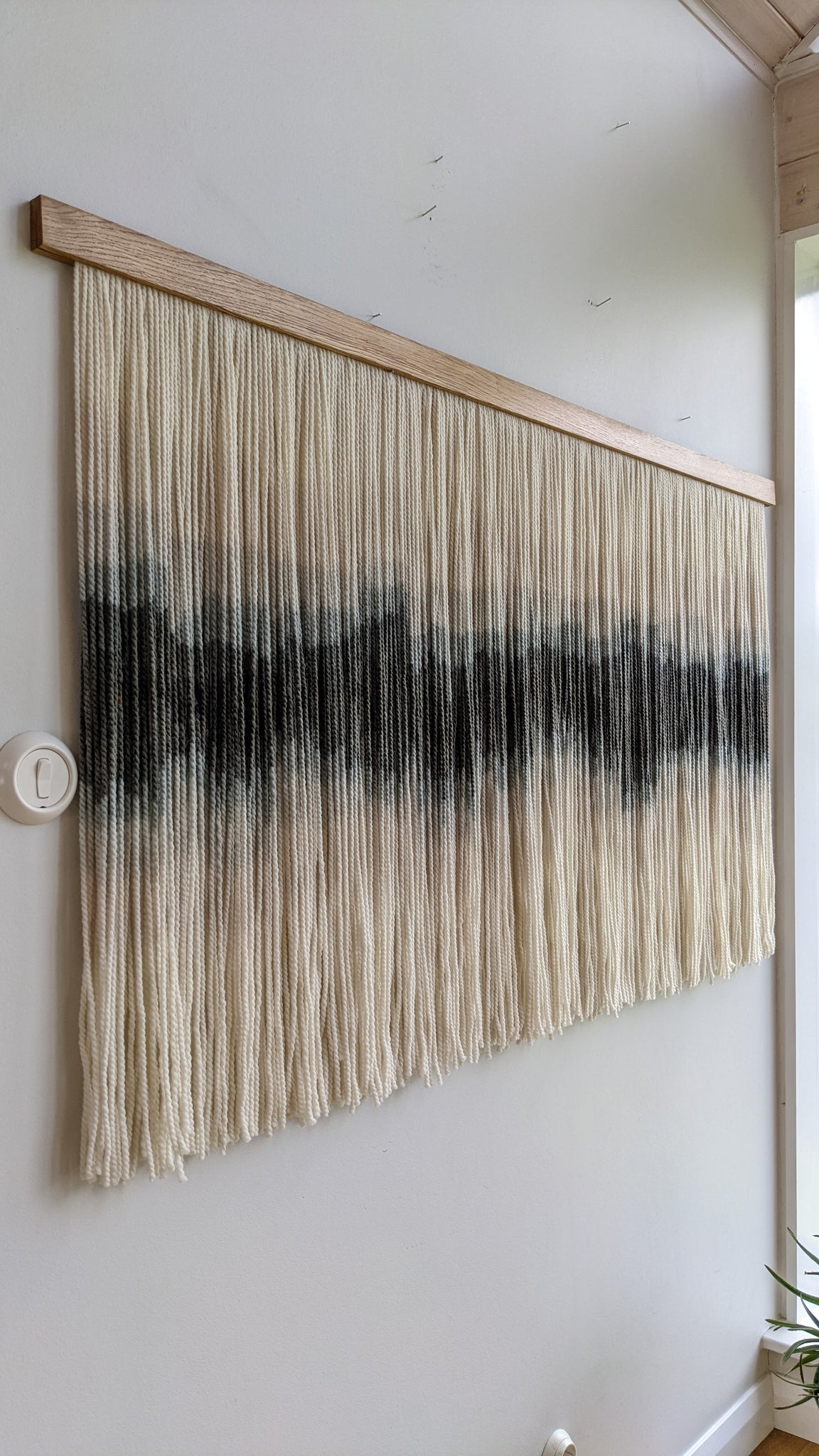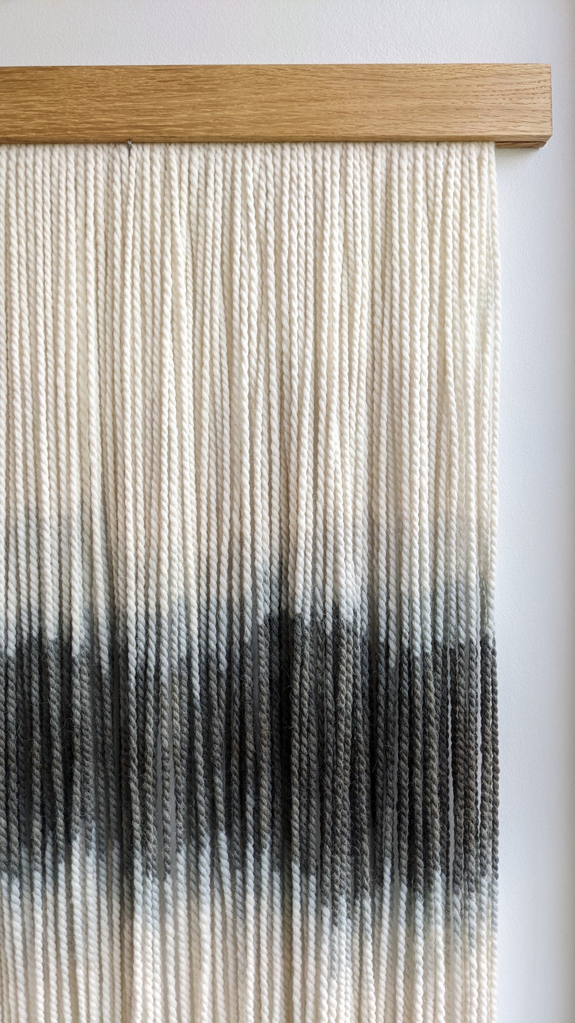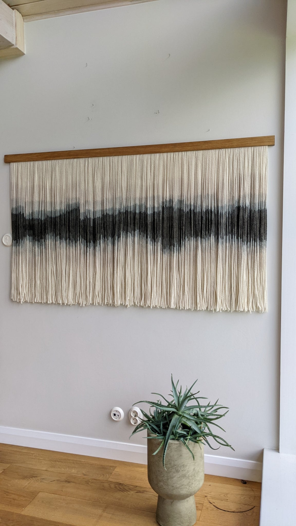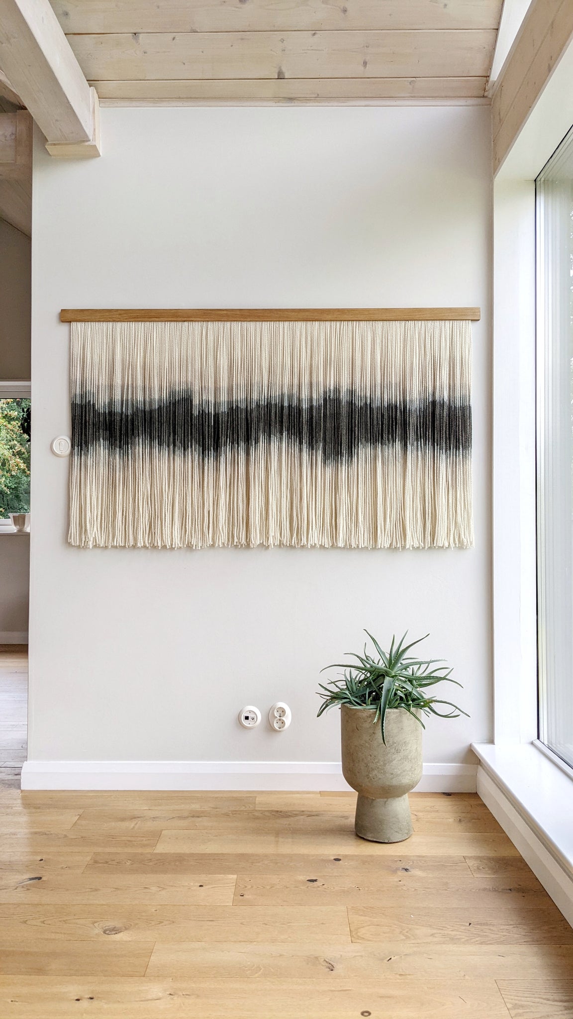 This dip dyed wall hanging is made of natural color soft wool, in shades of gray, graphite, and black, finished with an oak wood panel. Fiber art like this will suit perfectly a contemporary living room, bohemian bedroom and modern office.