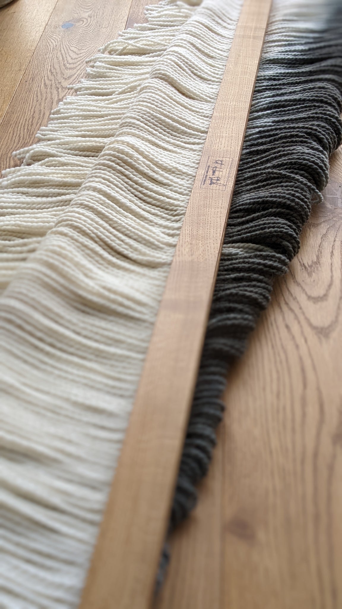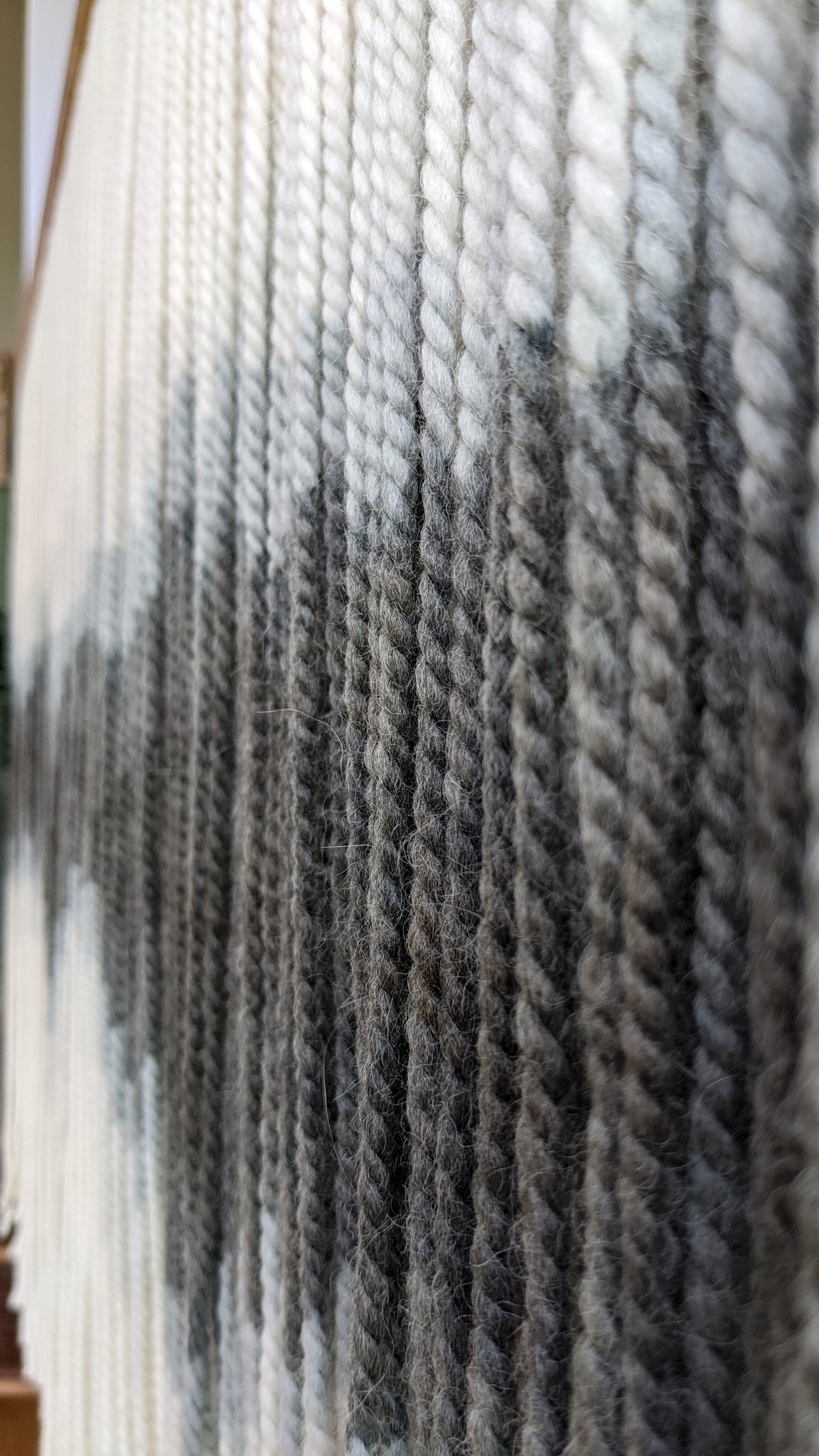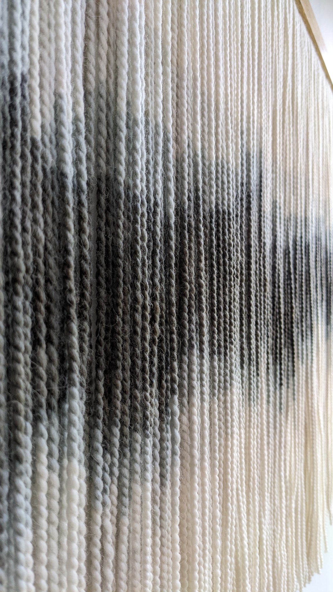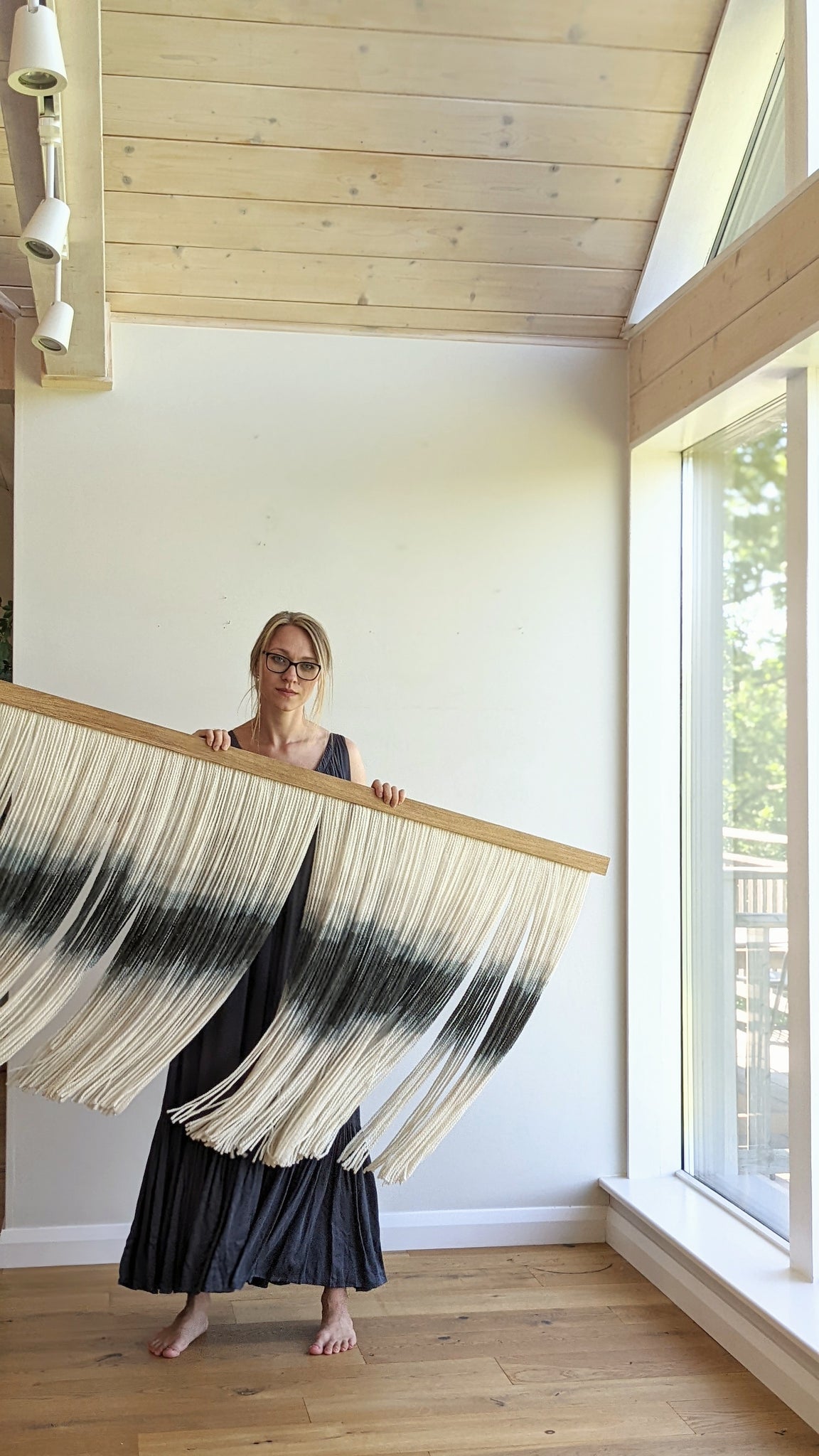 This dip dyed wall hanging is made of natural color soft wool, in shades of gray, graphite, and black, finished with an oak wood panel. Fiber art like this will suit perfectly a contemporary living room, bohemian bedroom and modern office.