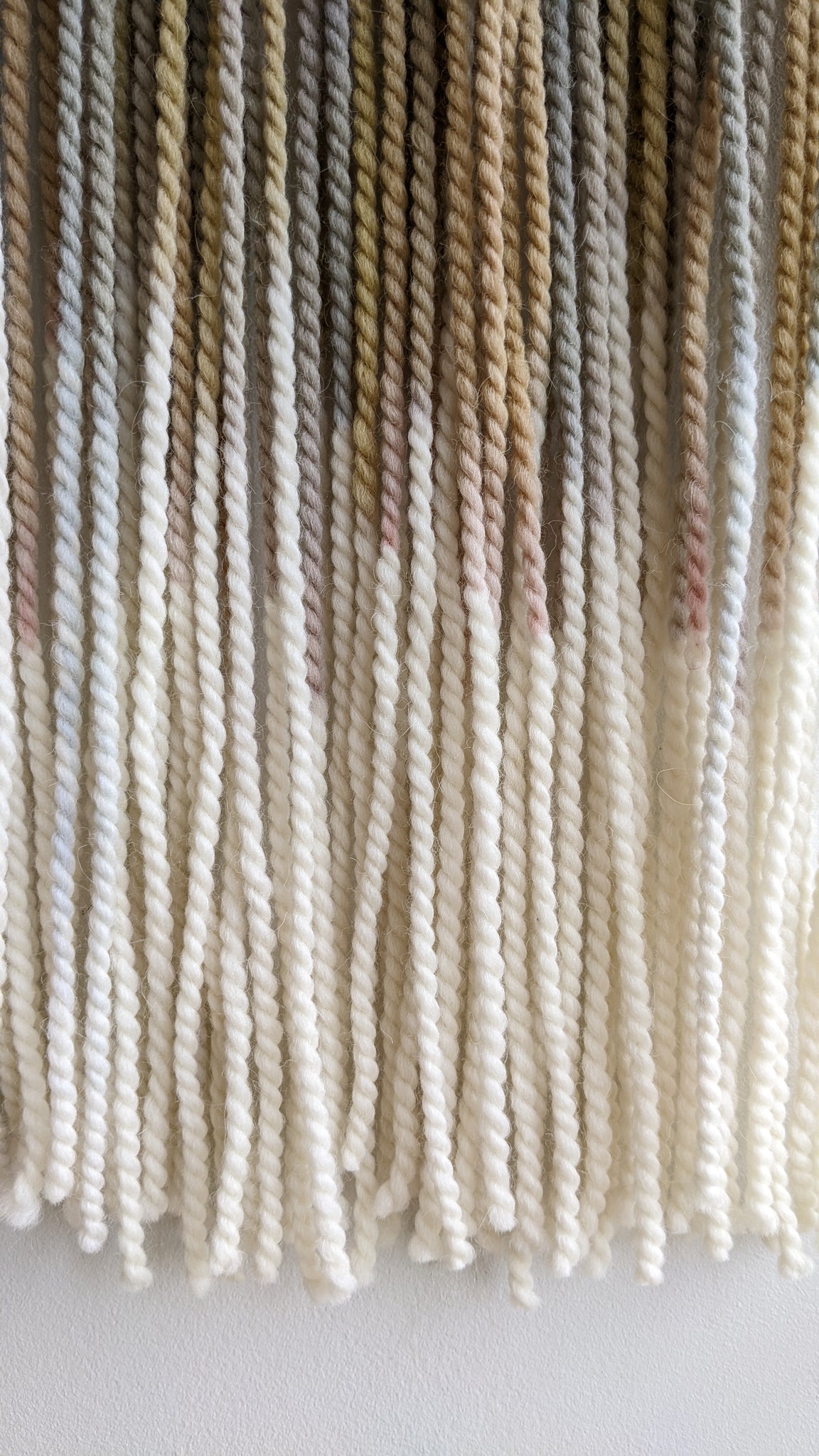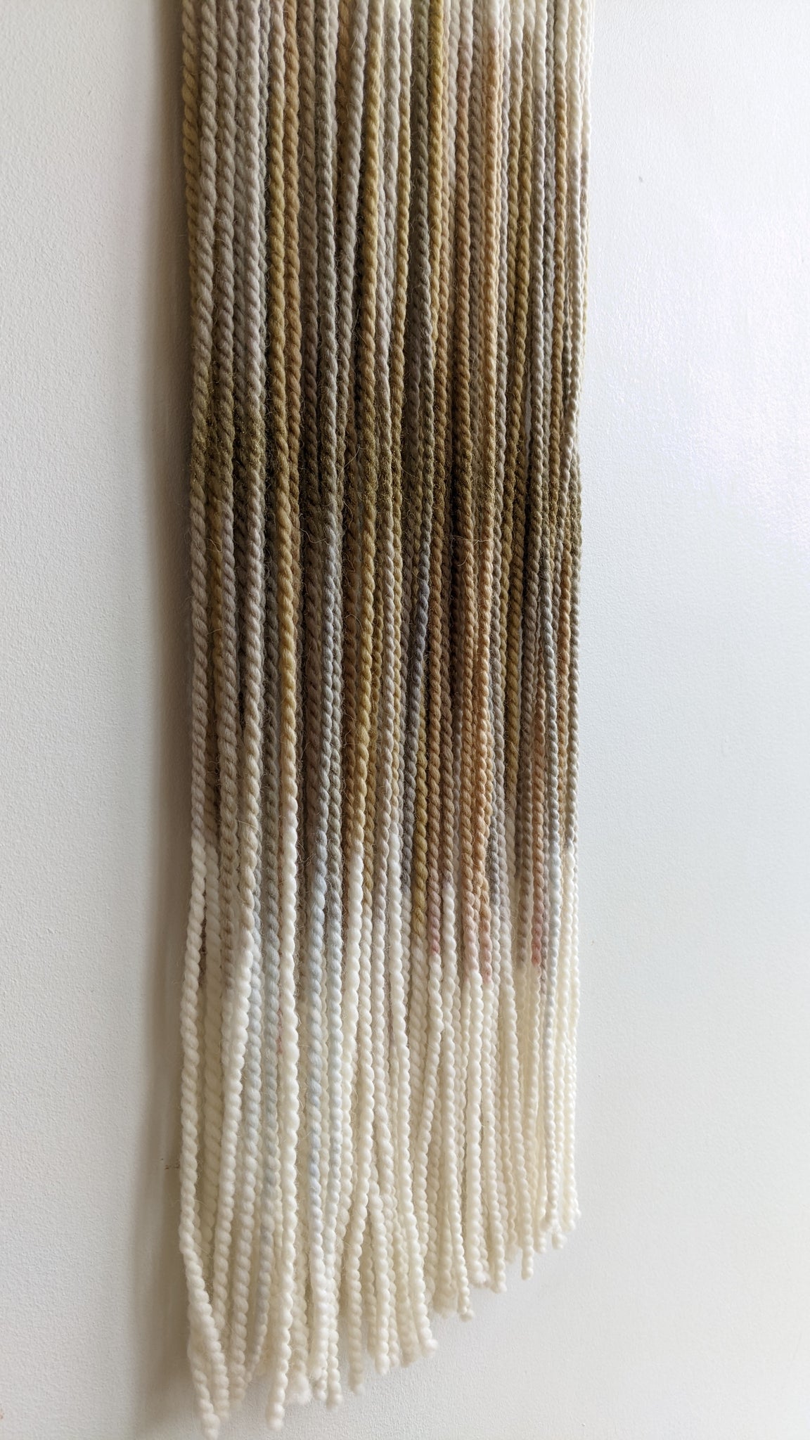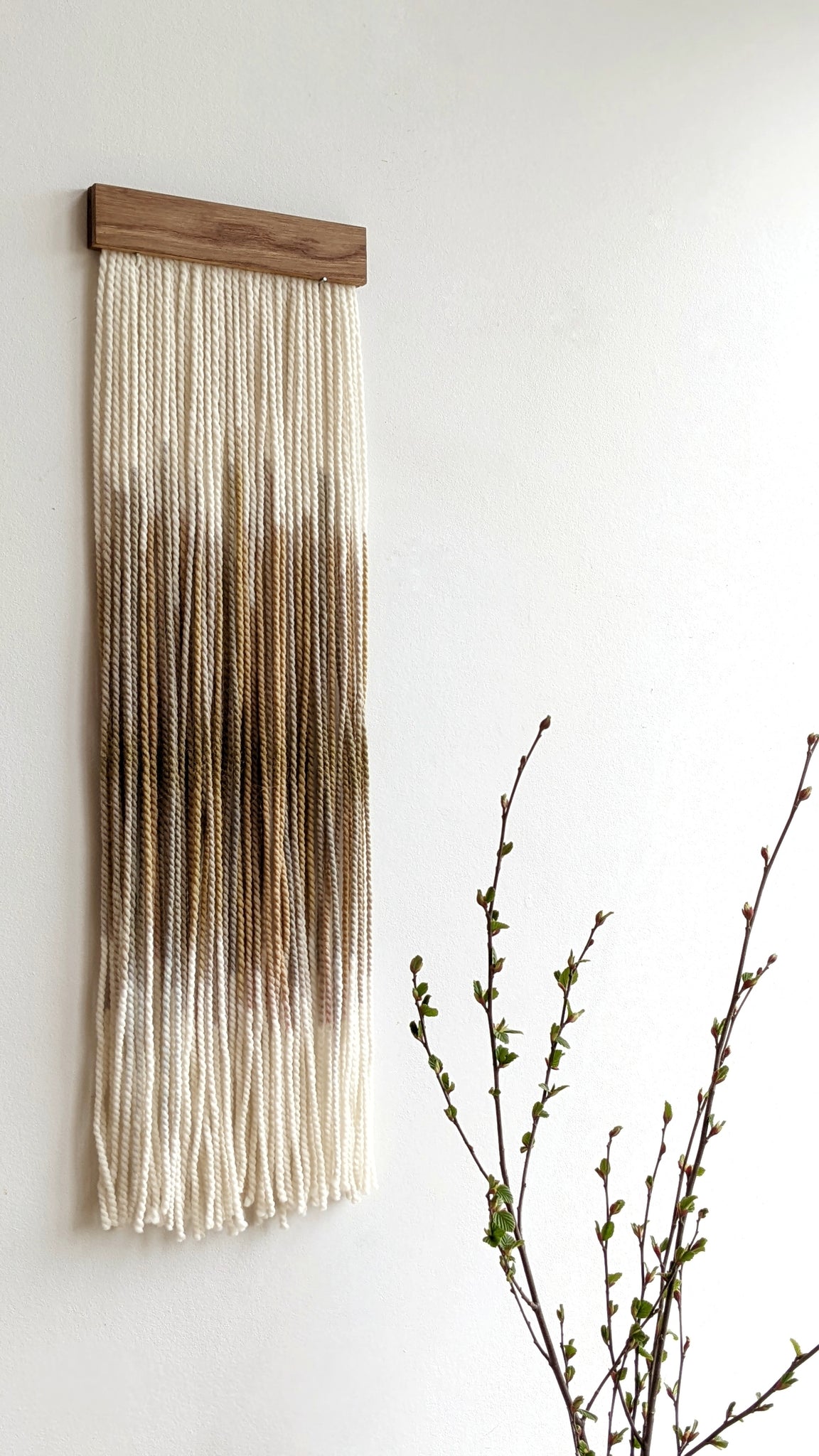 This large dip dyed wall hanging is made of soft wool, in shades of gold, bronze, sand and brown with the addition of gold acrylic paint, finished with stained oak wood panel. Fiber art like this will suit perfectly a small living room, office wall, and bedroom.