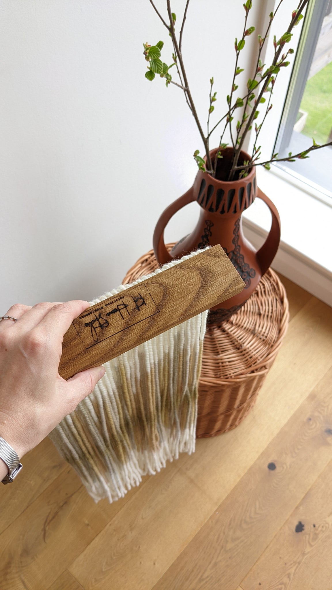 Thanks to the dyeing process, the wool painting is a unique and inspiring addition to any interior. The wood panel gives it a modern note.