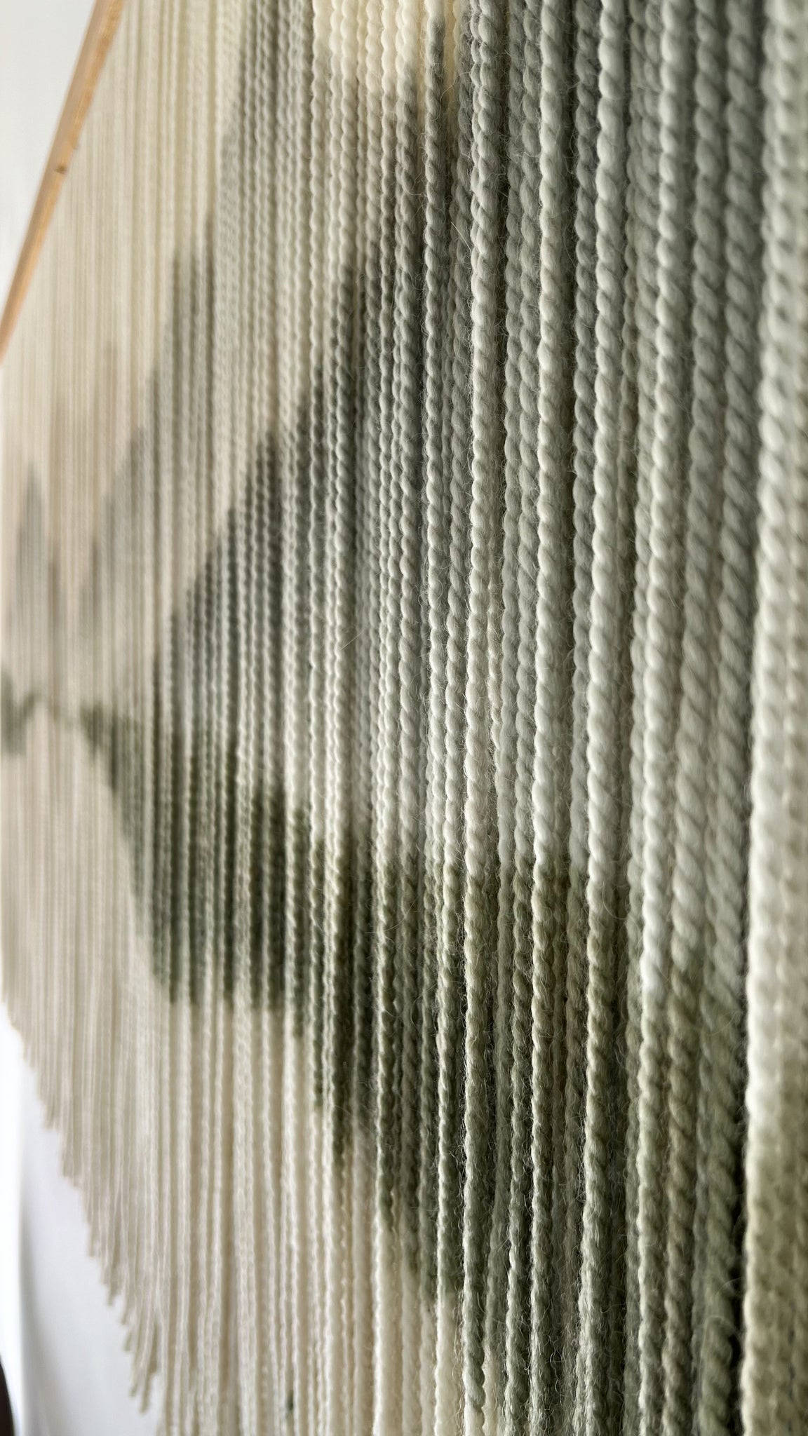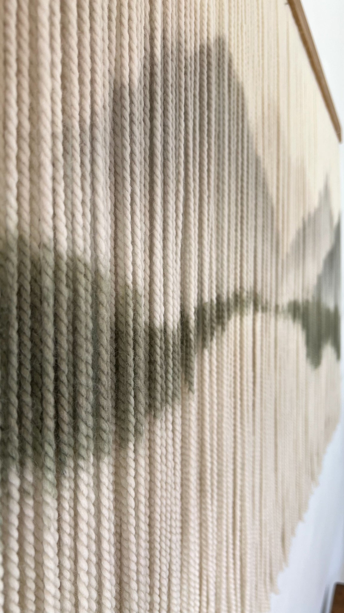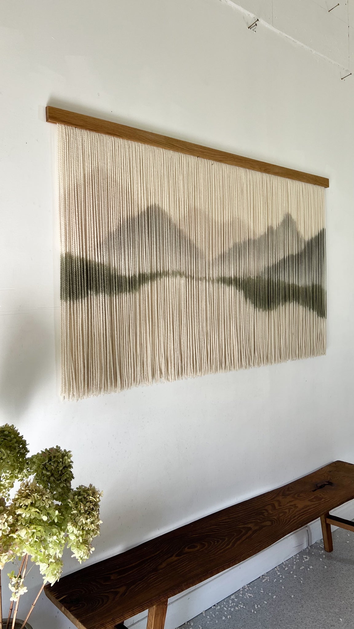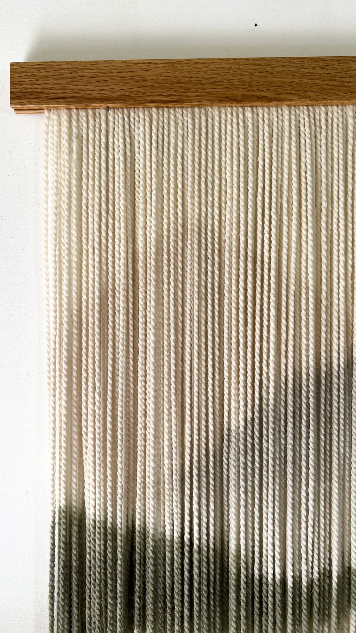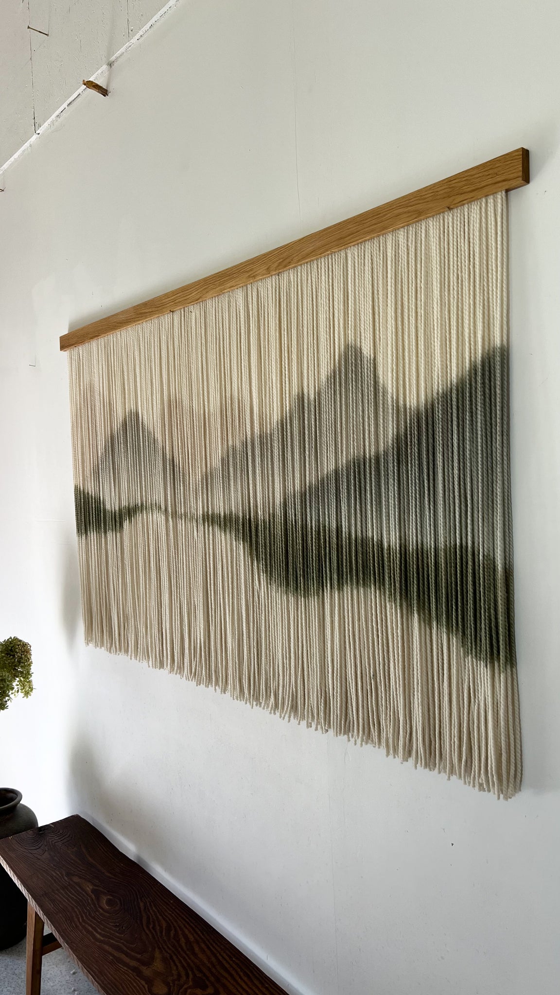 This dip dyed wall hanging is made of natural color soft wool, in shades of gray, beige and green finished with an oak wood panel. Fiber art like this will suit perfectly a minimalist living room, bohemian bedroom and warm office.