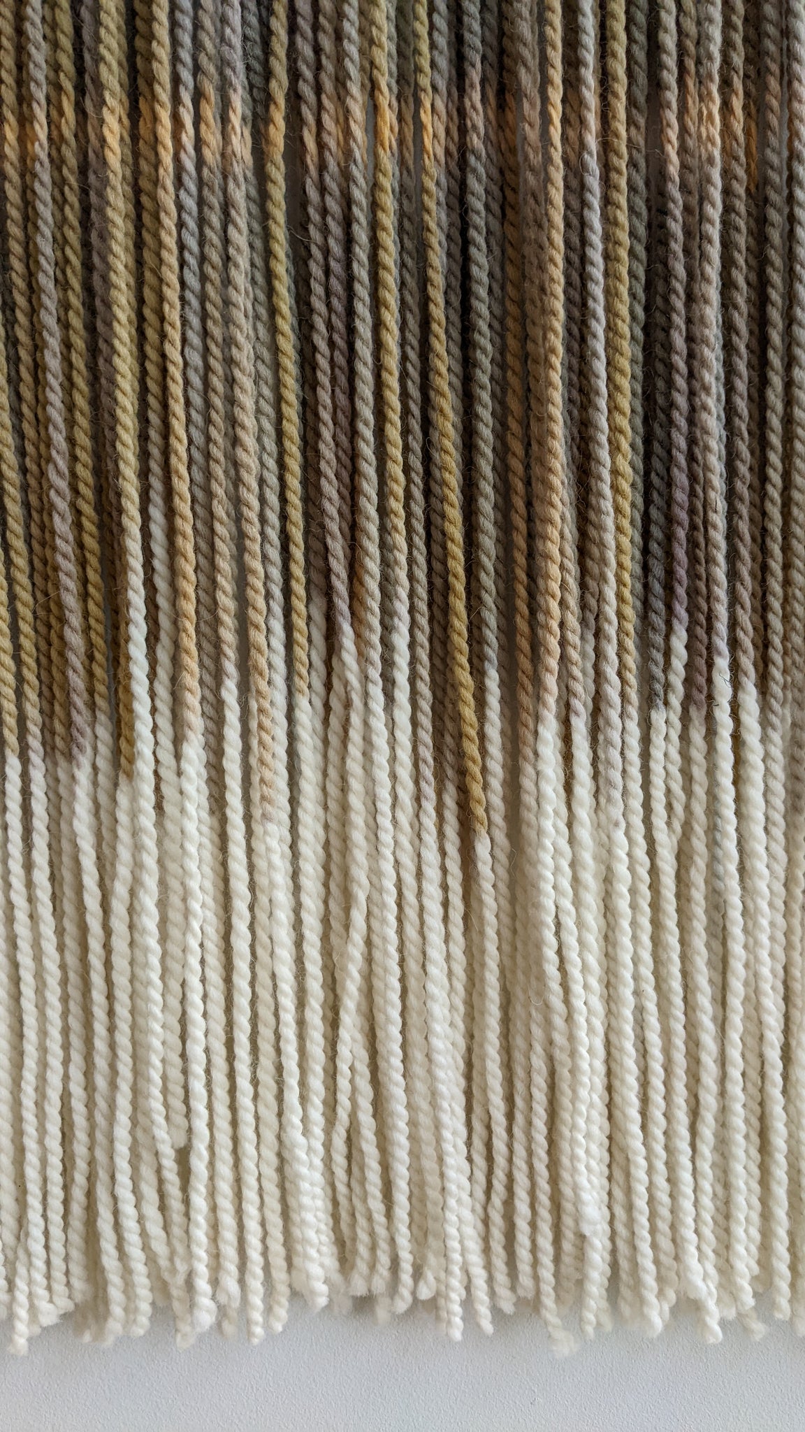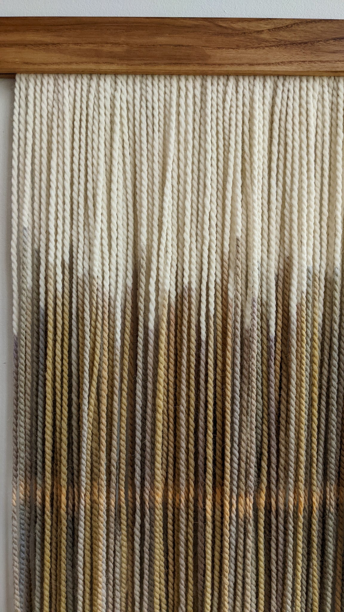 This dip dyed wall hanging is made of soft wool, in shades of beige, bronze, gold and brown, finished with a bronze stained oak wood panel. Fiber art like this will suit perfectly a wabi sabi living room, bohemian bedroom and warm office.