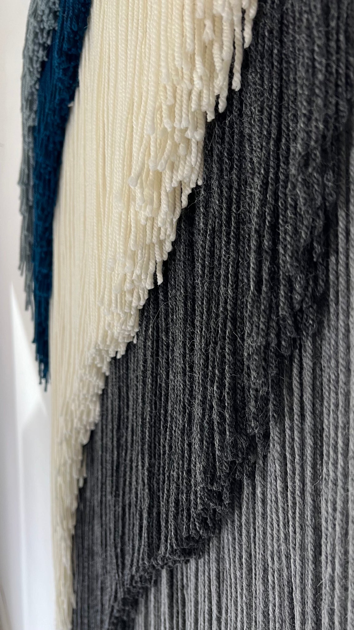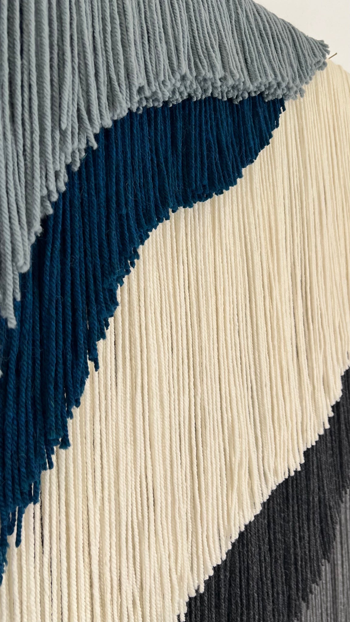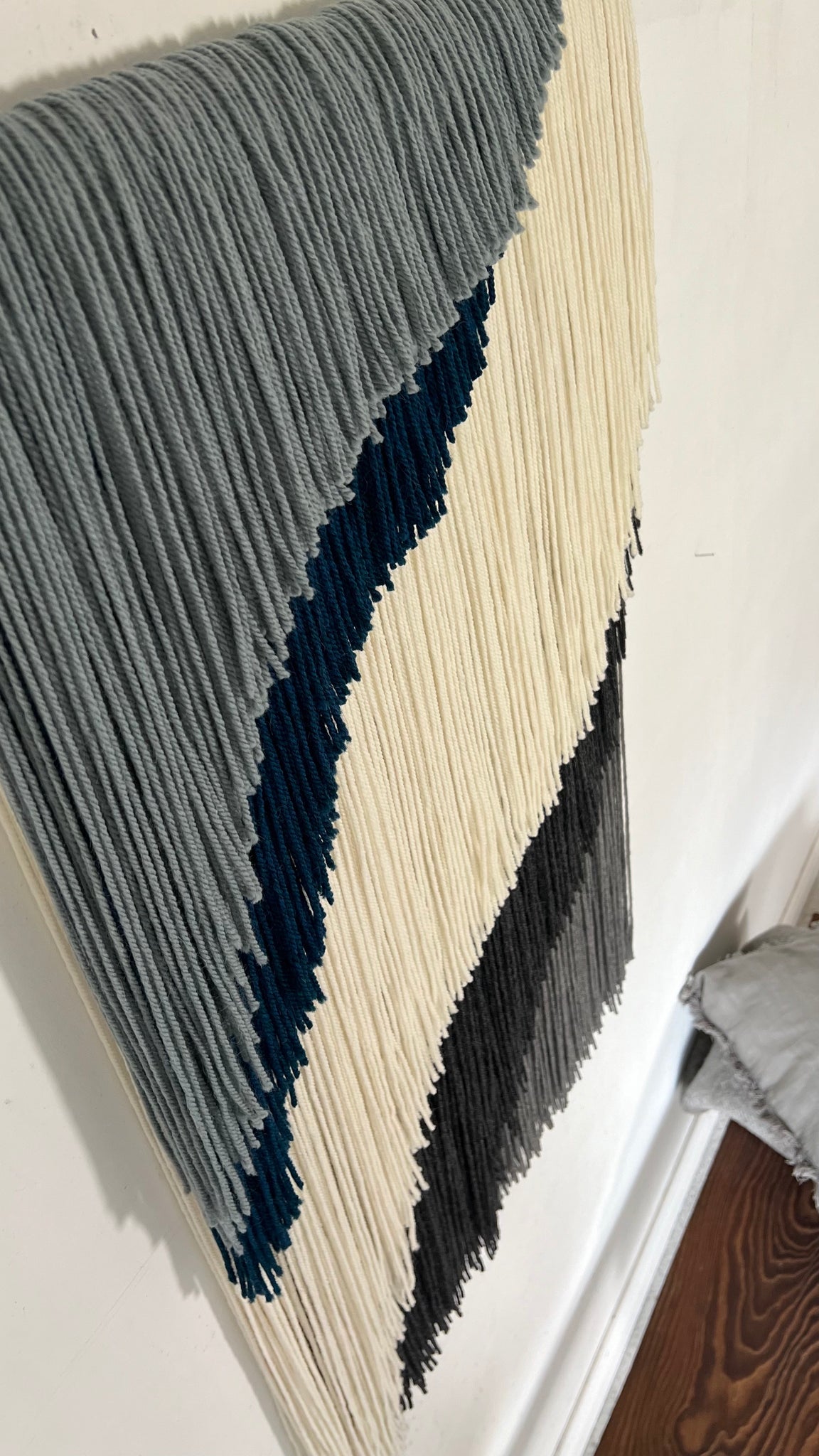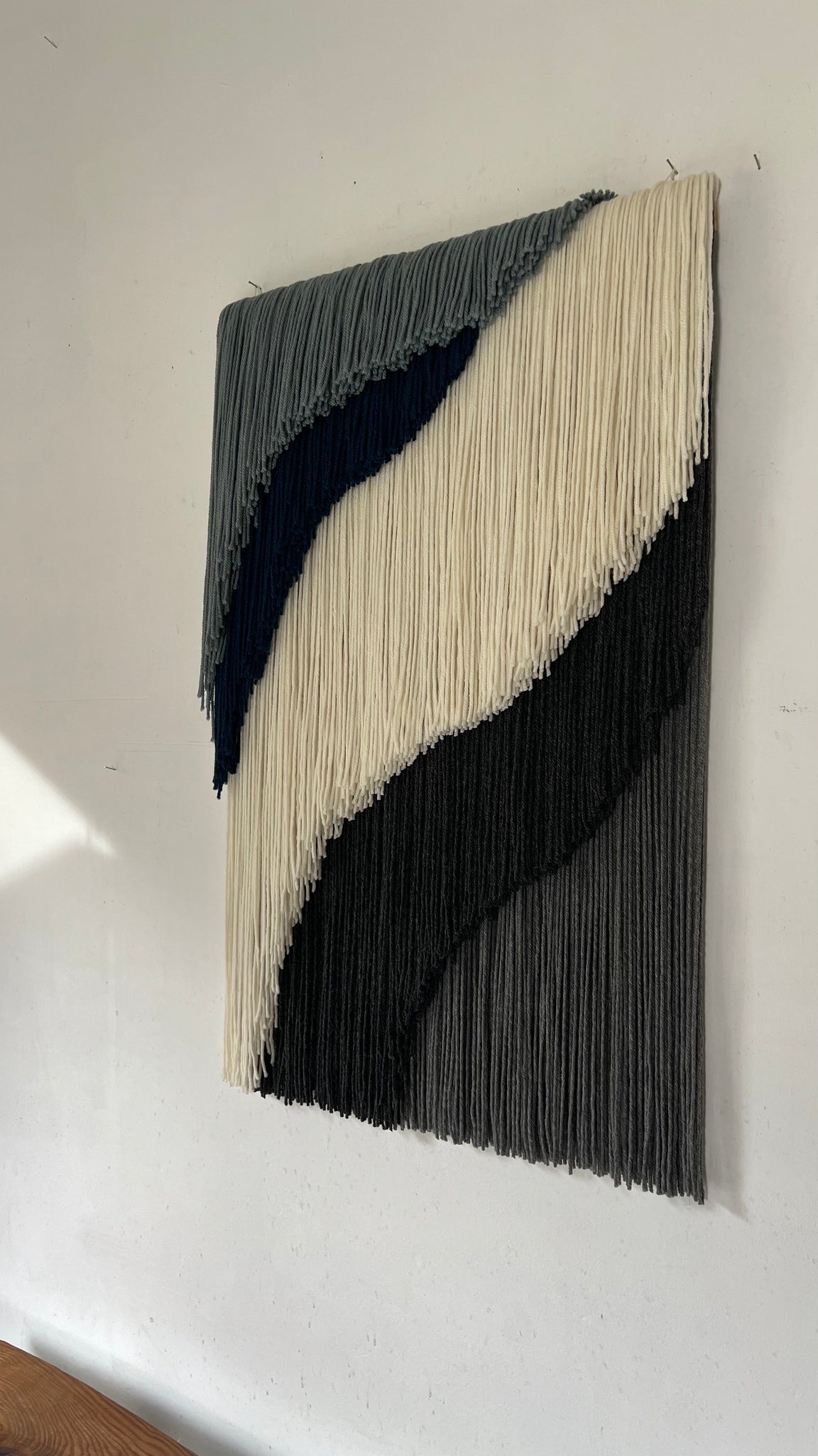 This layered dip dye wall hanging, is made of natural color soft wool in shades of dusty blue, dark turquoise, anthracite and gray finished with a concealed wood panel. Fiber art like this will suit perfectly a minimalist living room, bohemian bedroom and modern office.