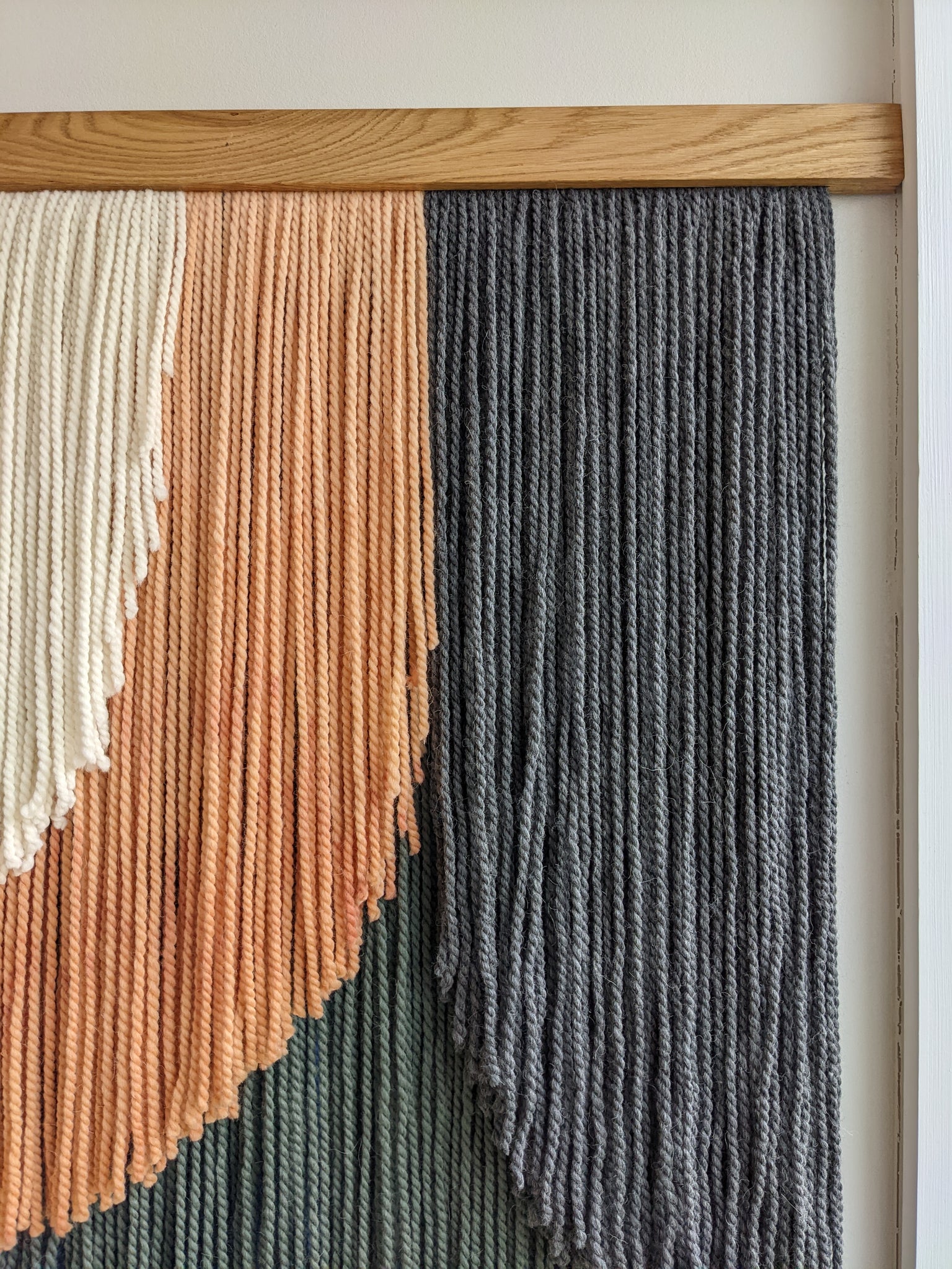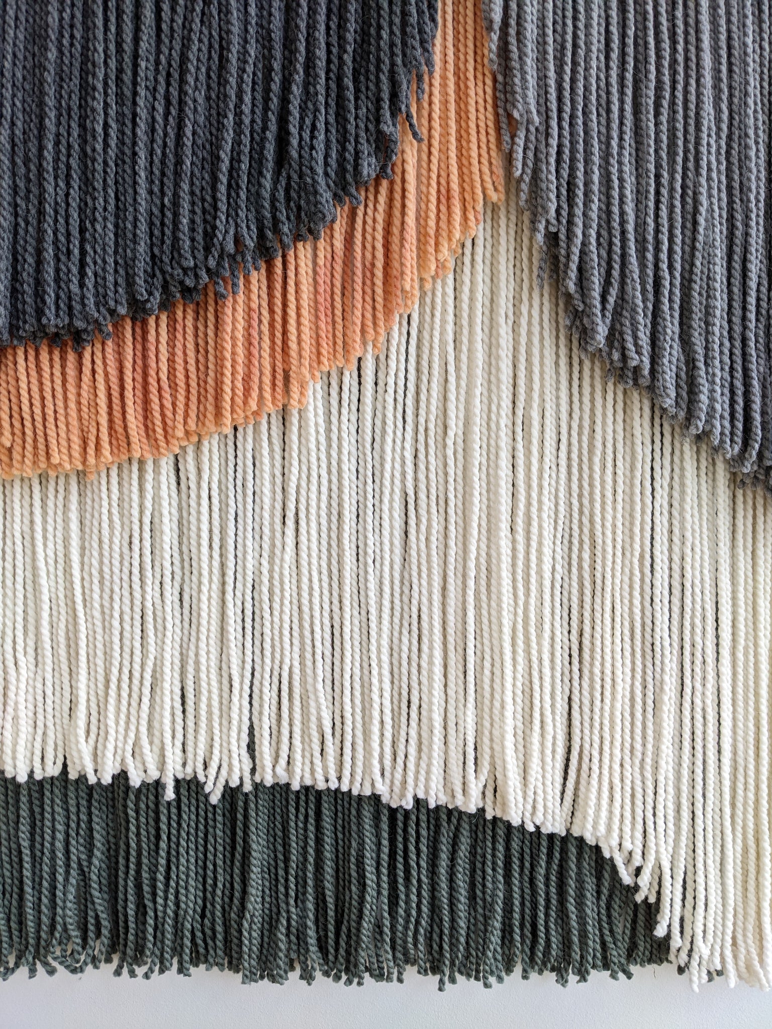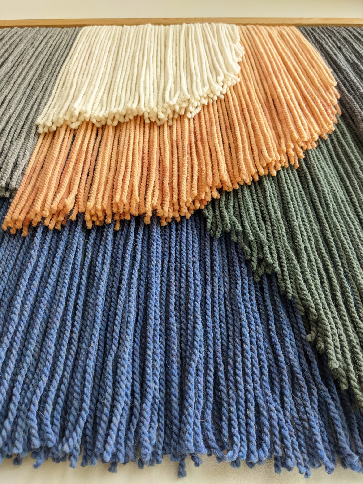 This large layered wall hanging is made of soft wool, in shades of natural color wool (ecru/off white), gray, green, blue and orange, finished with oak wood panel. Fiber art like this will suit perfectly a minimal living room, modern bedroom, and mid-century office.