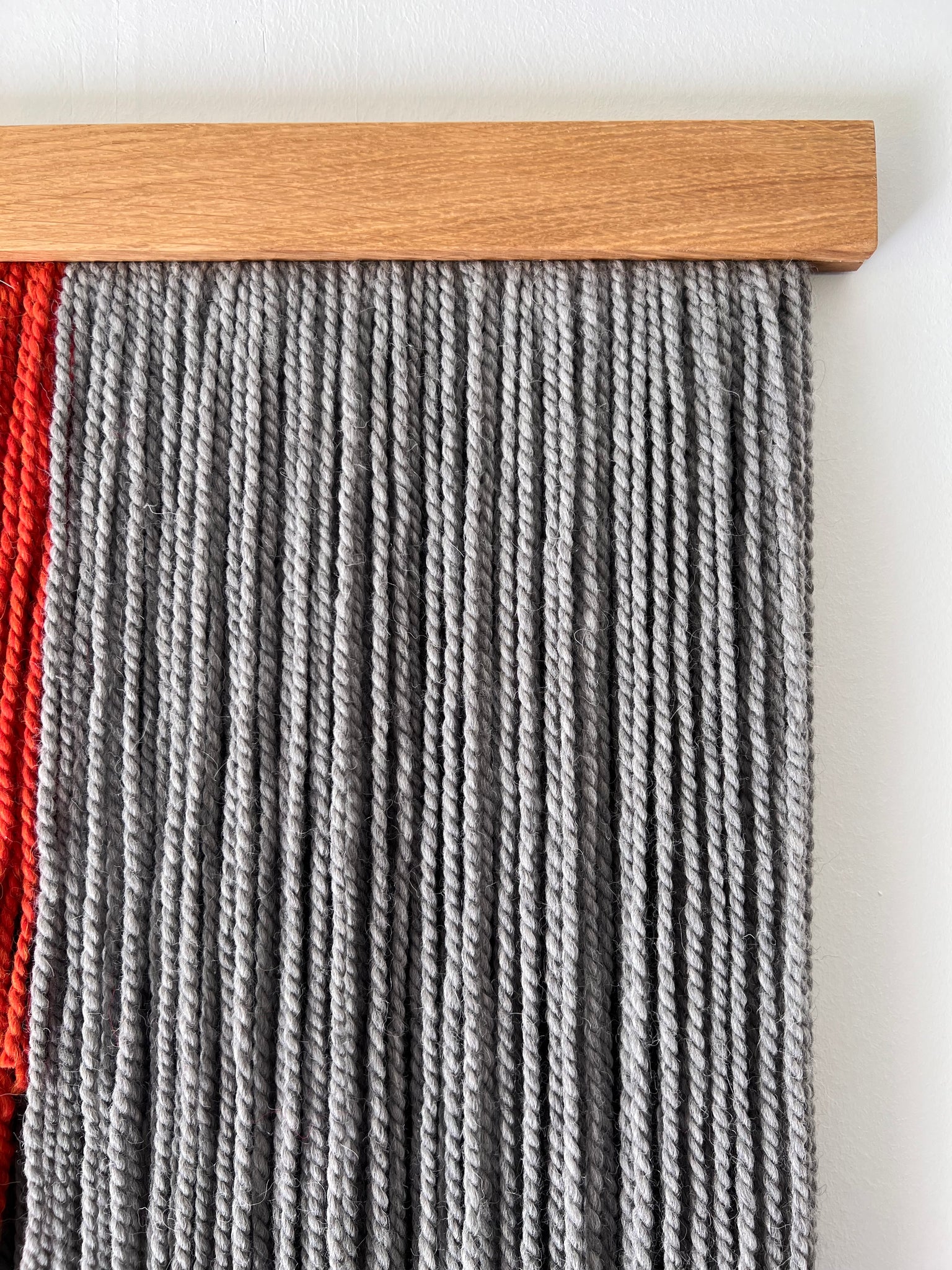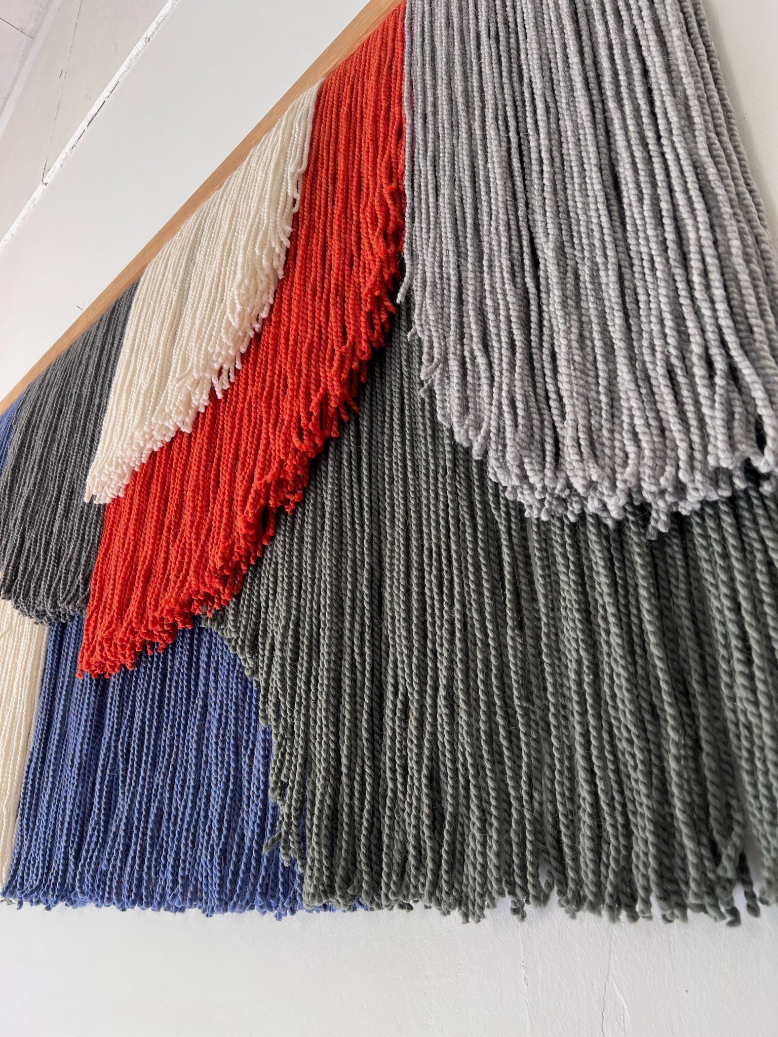 This large layered wall hanging is made of soft wool, in shades of natural color wool (ecru/off white), gray, green, blue and ginger/red, finished with oak wood panel. Fiber art like this will suit perfectly a minimal living room, modern bedroom, and mid-century office.