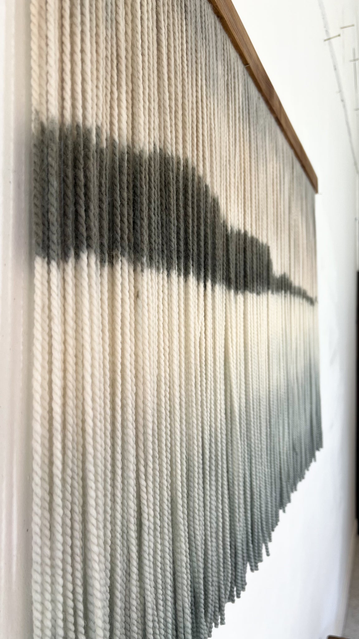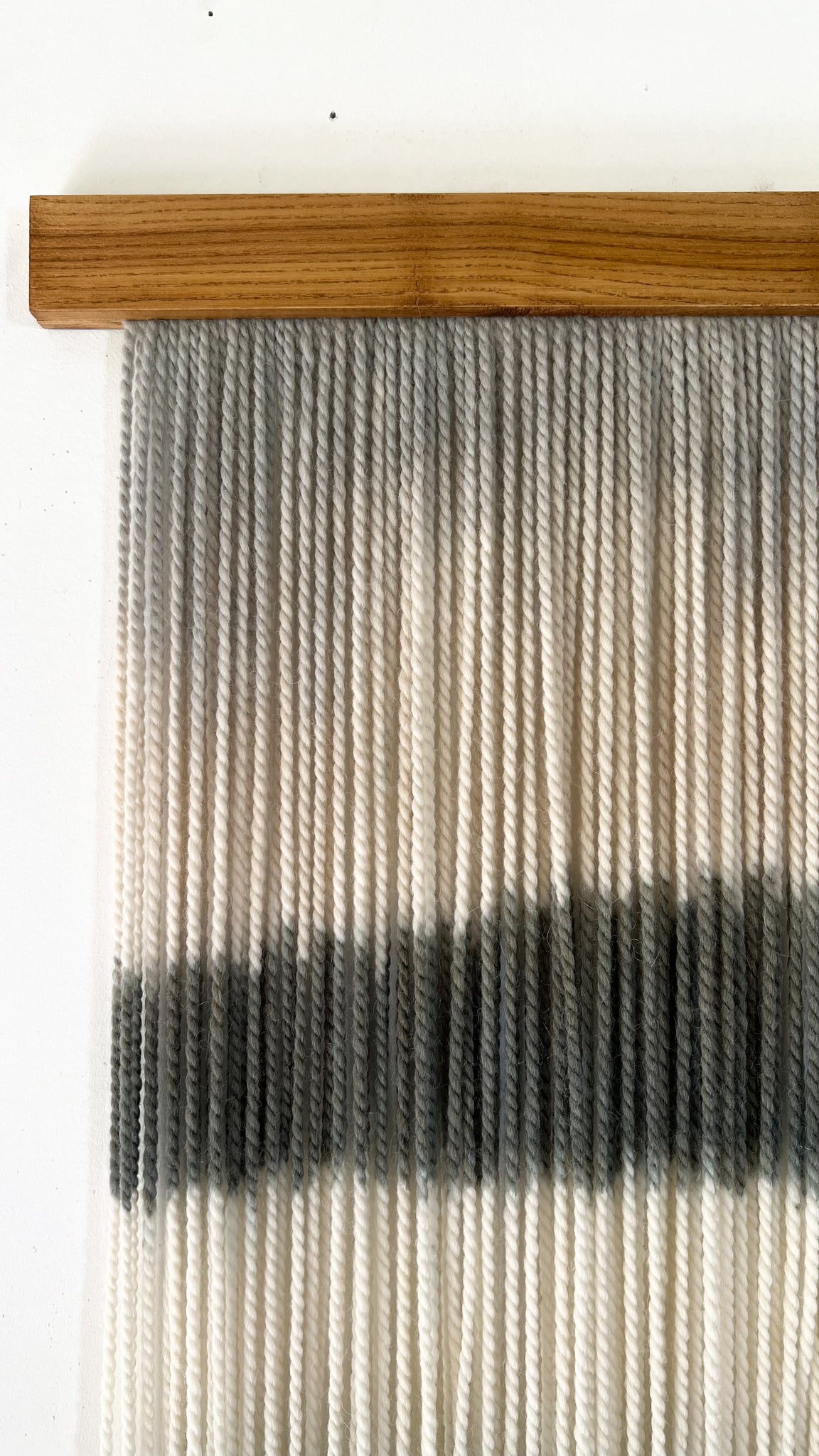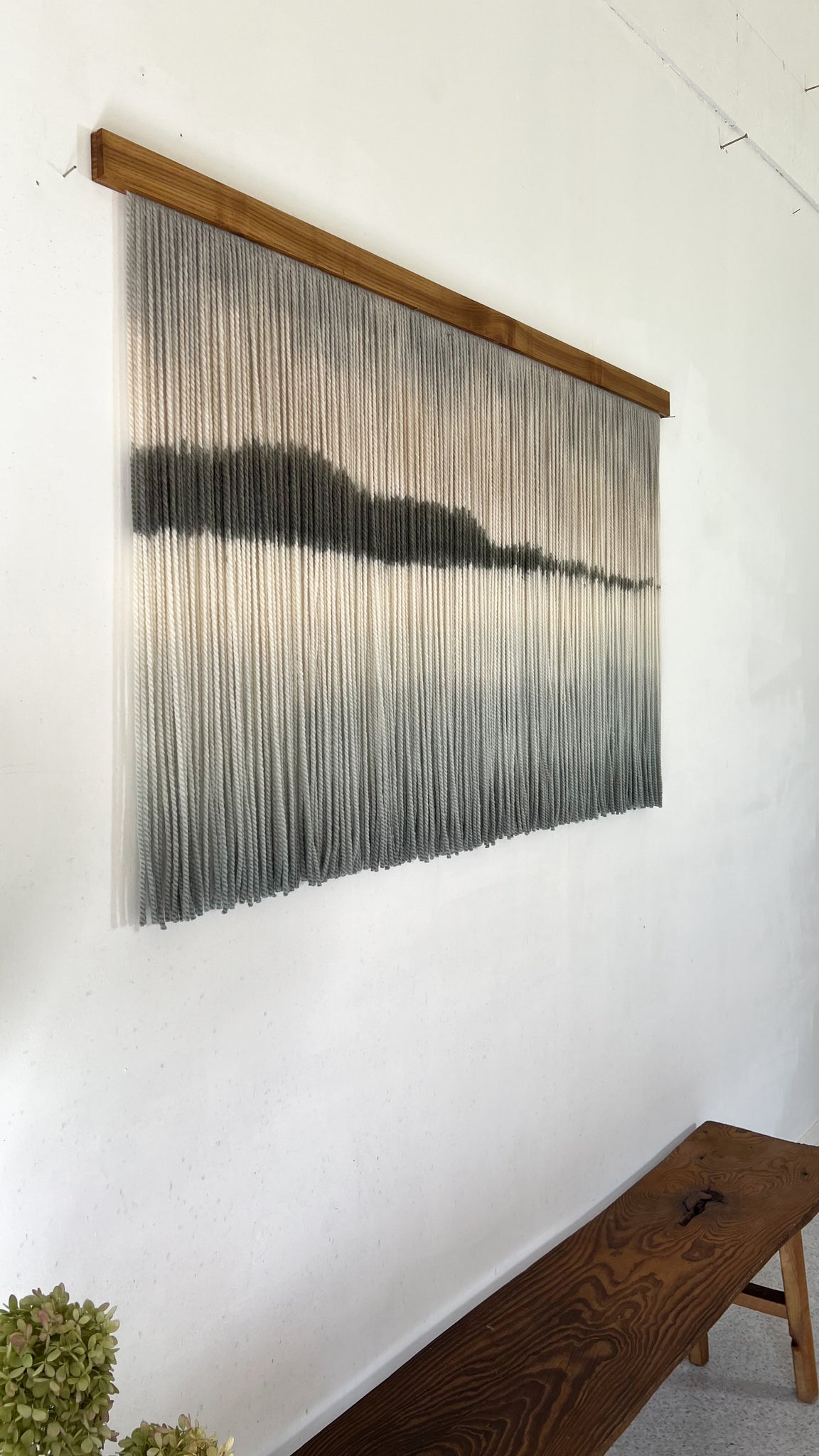 This dip dyed wall hanging is made of natural color soft wool, in shades of gray, charcoal, beige and blue finished with a stained oak wood panel. Fiber art like this will suit perfectly a minimalist living room, bohemian bedroom and warm office.