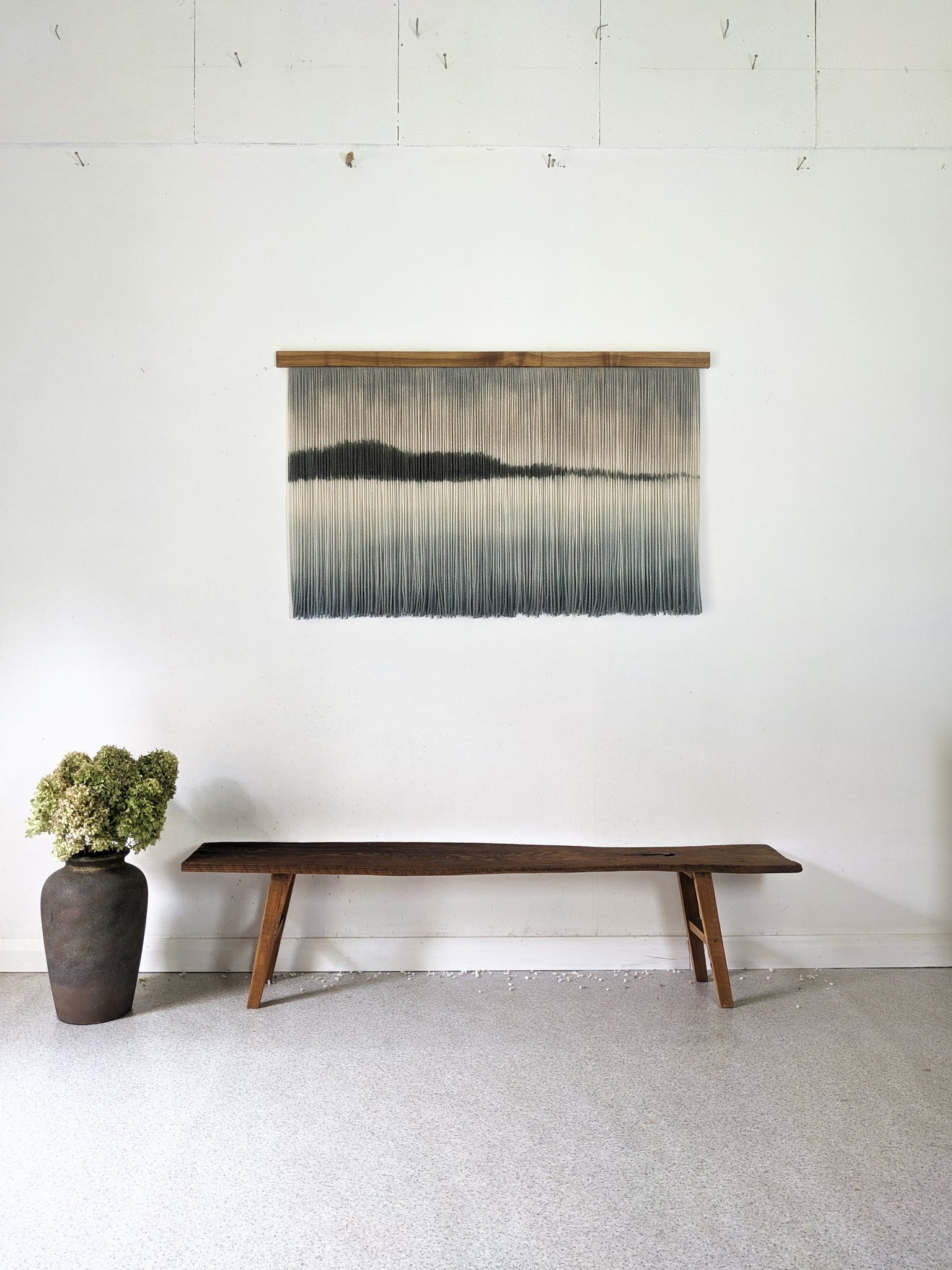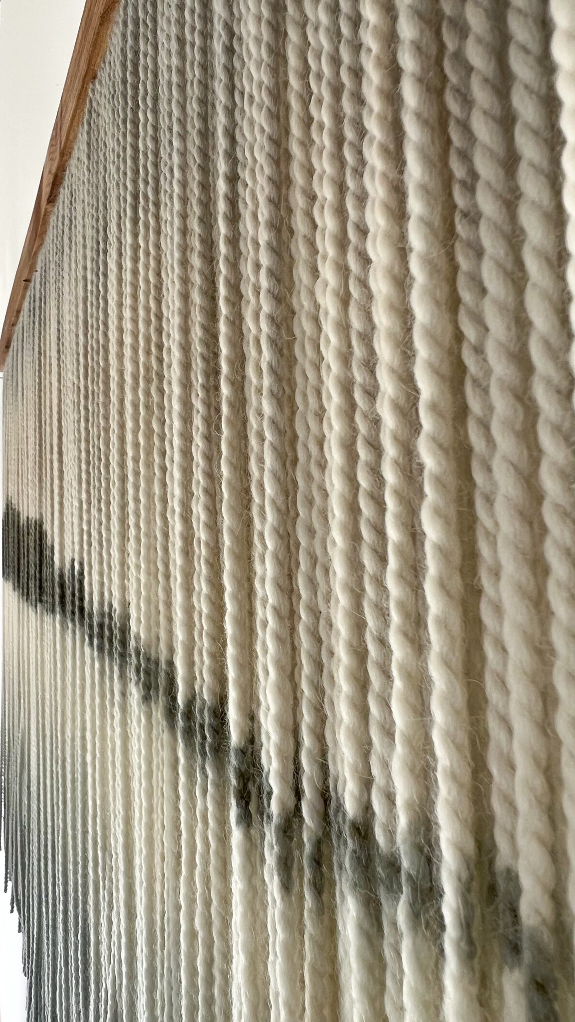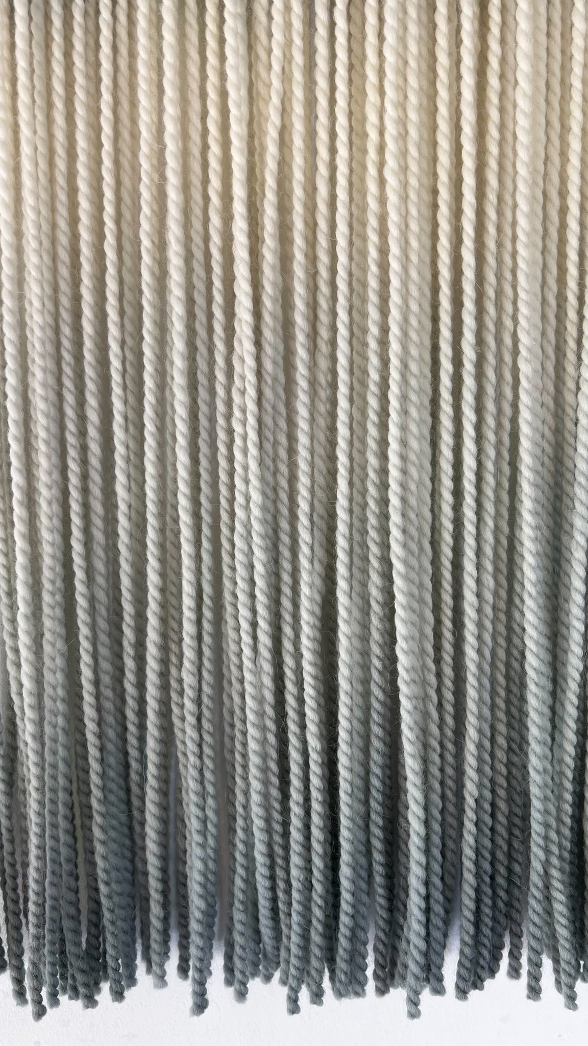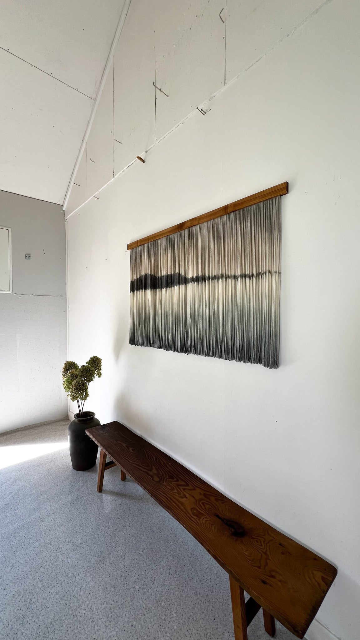 This dip dyed wall hanging is made of natural color soft wool, in shades of gray, charcoal, beige and blue finished with a stained oak wood panel. Fiber art like this will suit perfectly a minimalist living room, bohemian bedroom and warm office.